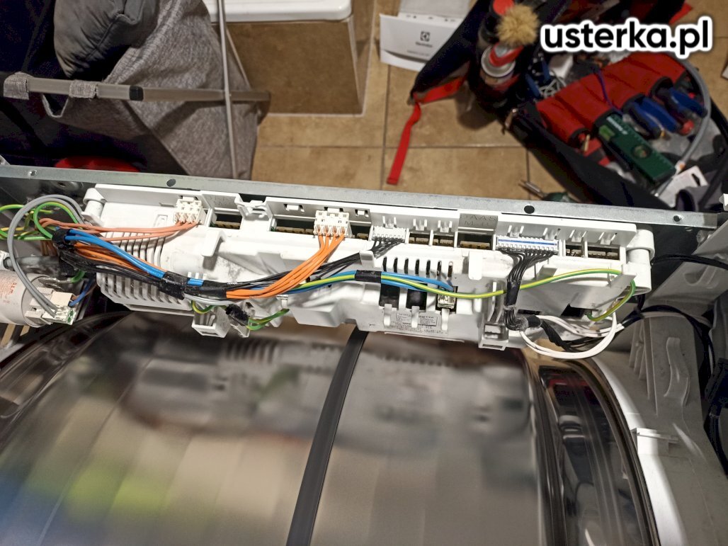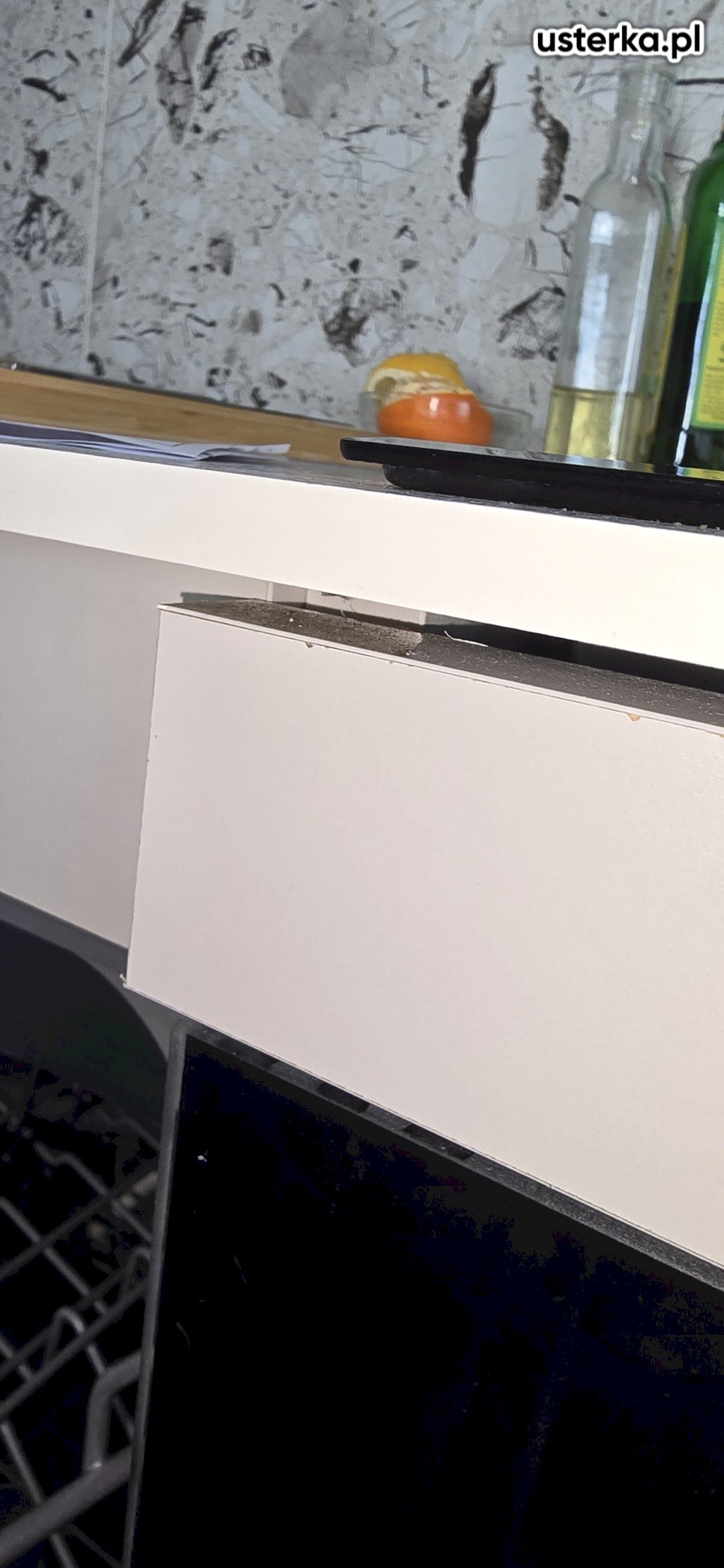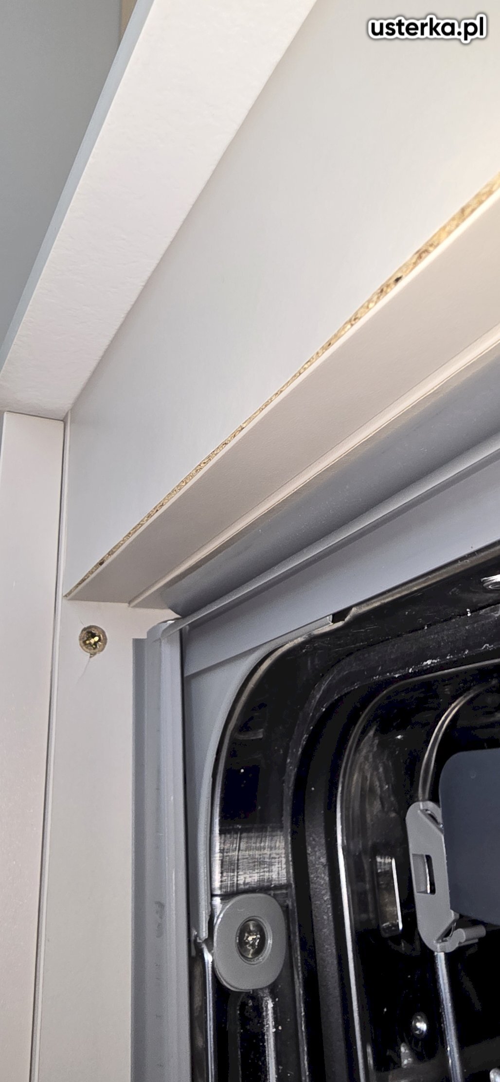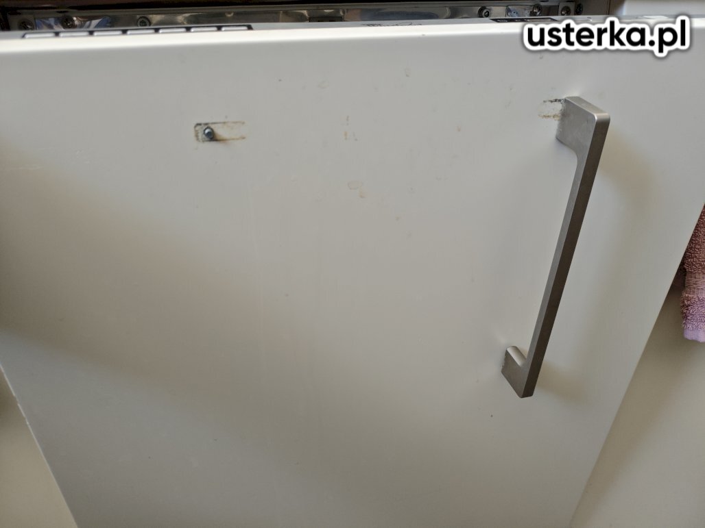 Zamontowano front do nowej pralki w zabudowie kuchennej. Montaż był niestandardowy ze względu na niepasujące otwory pod zawiasy.
