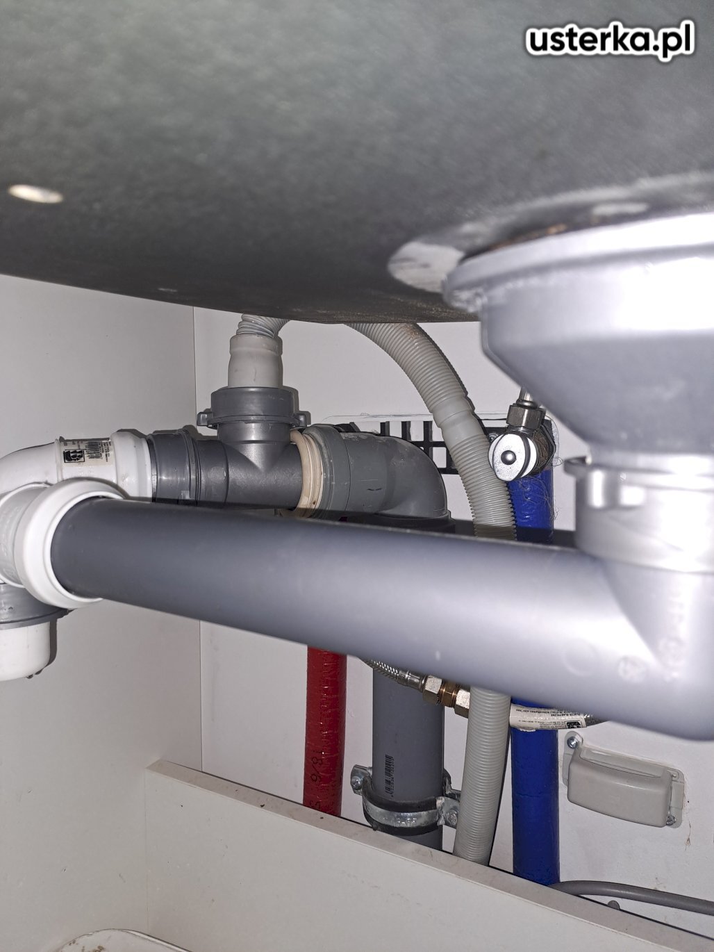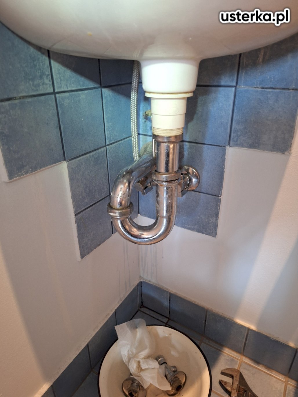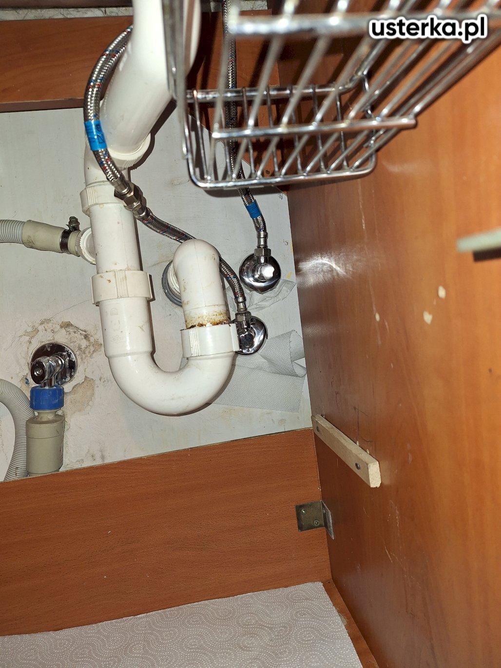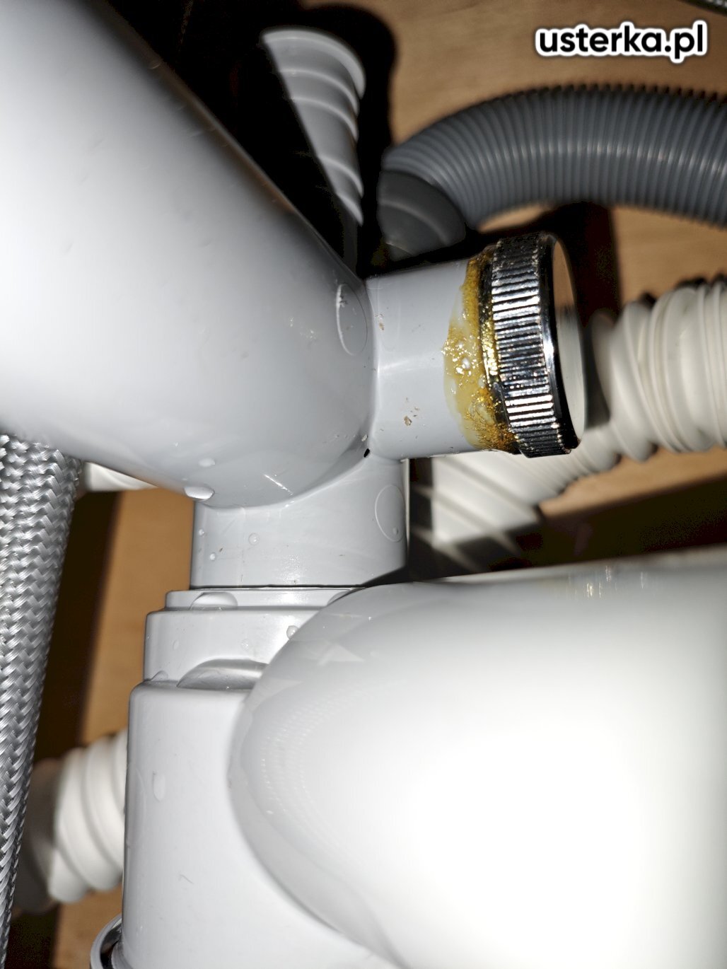 Przyczyną awarii była pęknięta śruba kielicha syfonu. Po jej wymianie instalacja działa prawidłowo i nie stwierdzono wycieków. Zwrócono również uwagę na niewłaściwy spadek instalacji, wynikający ze zbyt wysoko osadzonego odpływu kanalizacyjnego, co może powodować nieszczelności na kolankach z uszczelkami wargowymi.