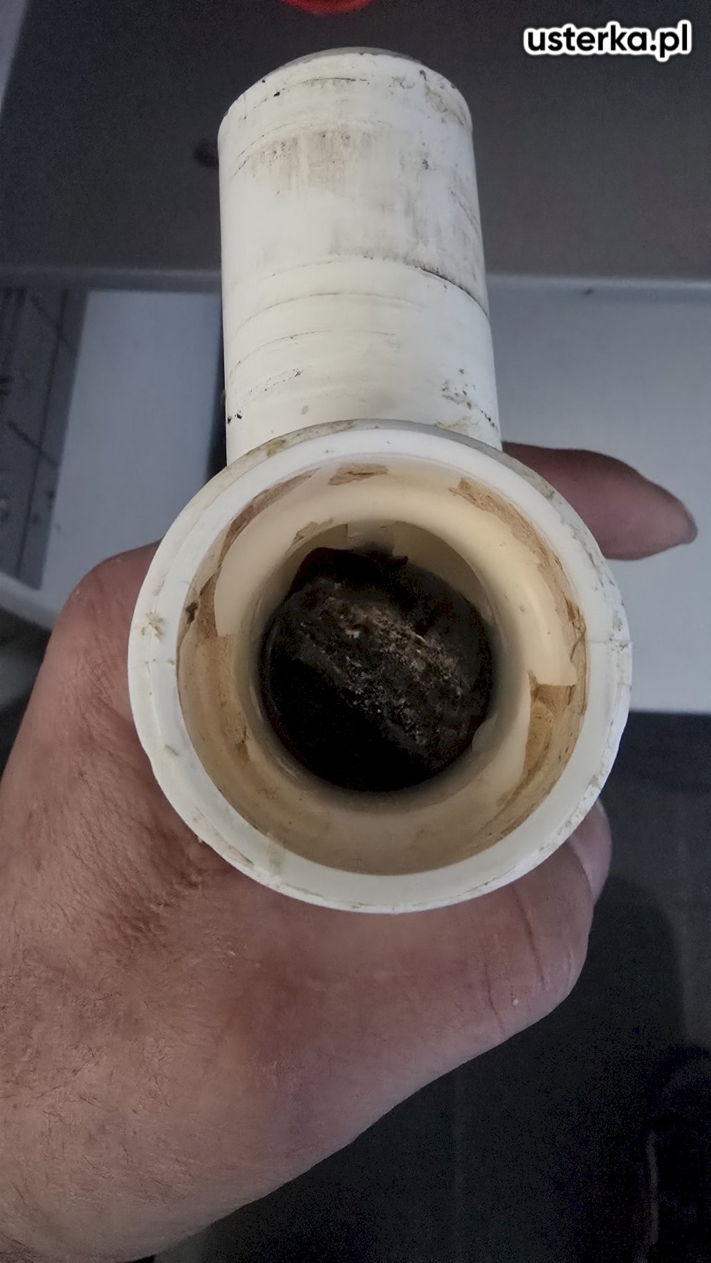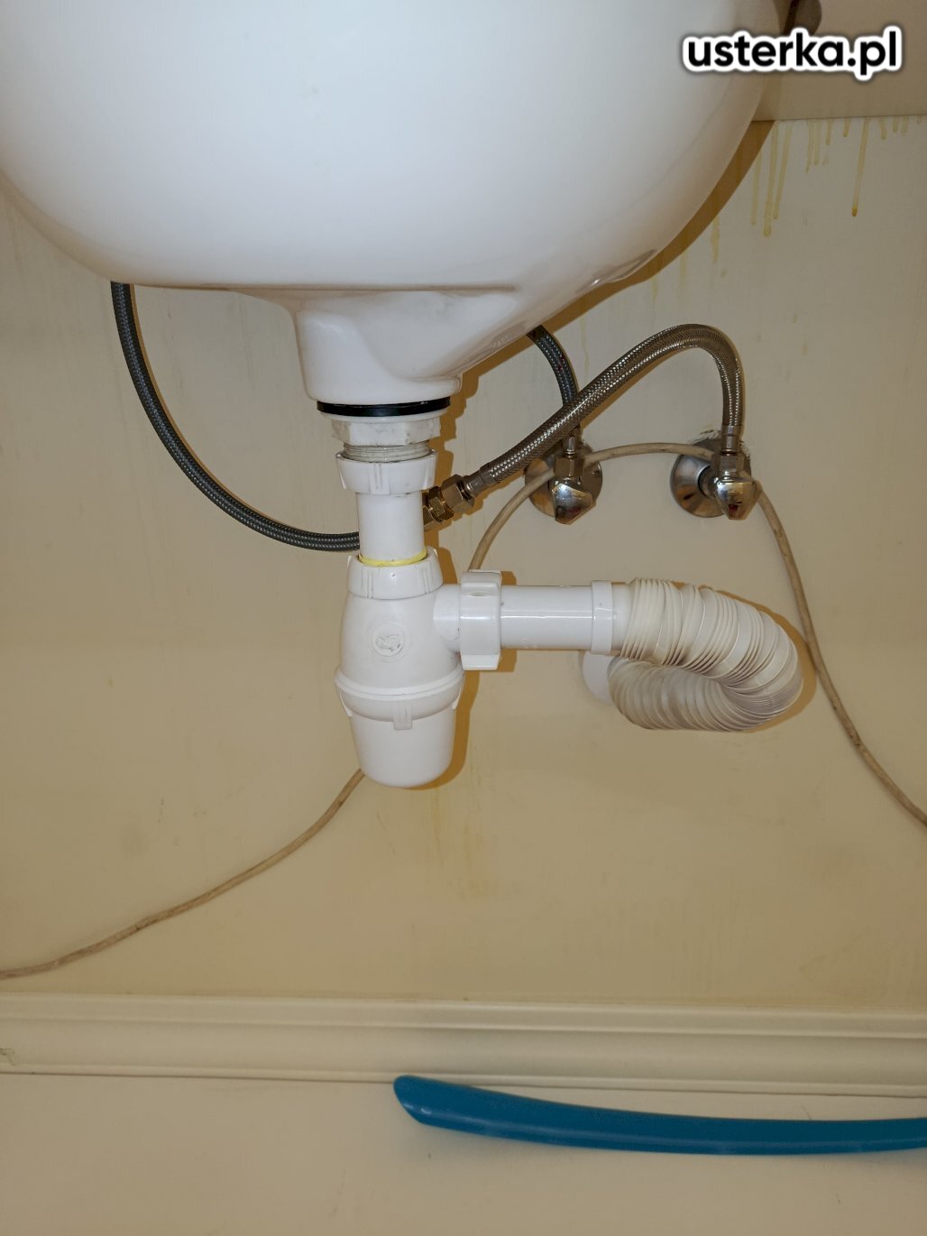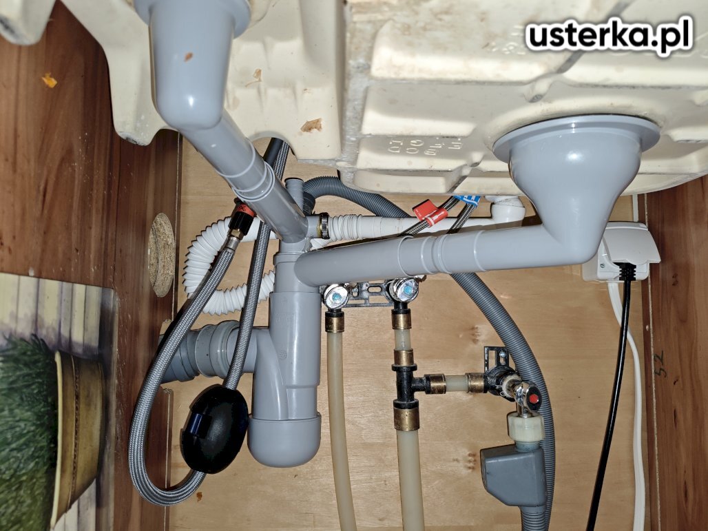 Przyczyną awarii była pęknięta śruba kielicha syfonu. Po jej wymianie instalacja działa prawidłowo i nie stwierdzono wycieków. Zwrócono również uwagę na niewłaściwy spadek instalacji, wynikający ze zbyt wysoko osadzonego odpływu kanalizacyjnego, co może powodować nieszczelności na kolankach z uszczelkami wargowymi.