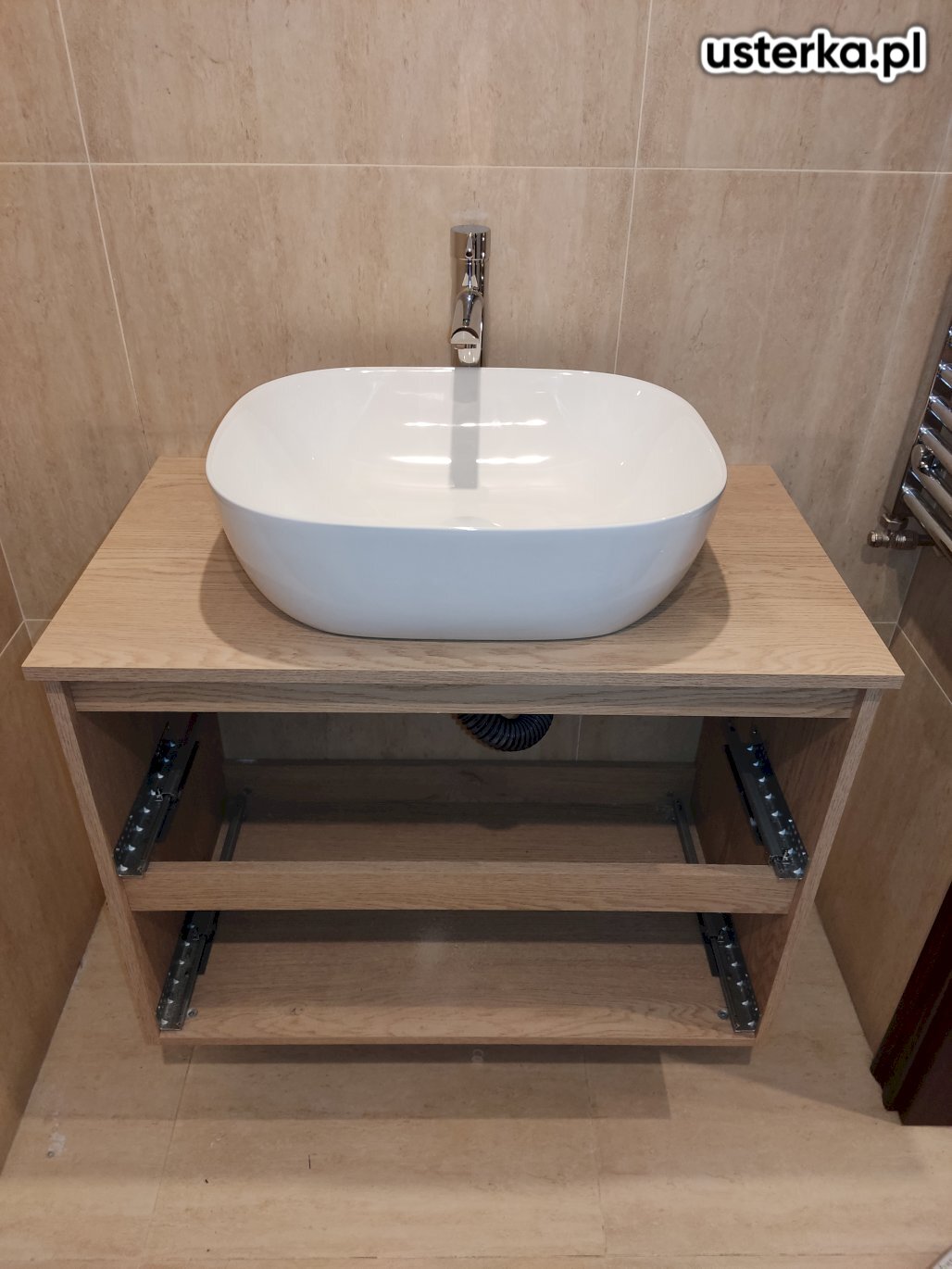 Wykonałem otwory w blacie pod umywalkę i baterię, zamontowałem nową szafkę z umywalką oraz baterią, a także zawiesiłem telewizor na ścianie.