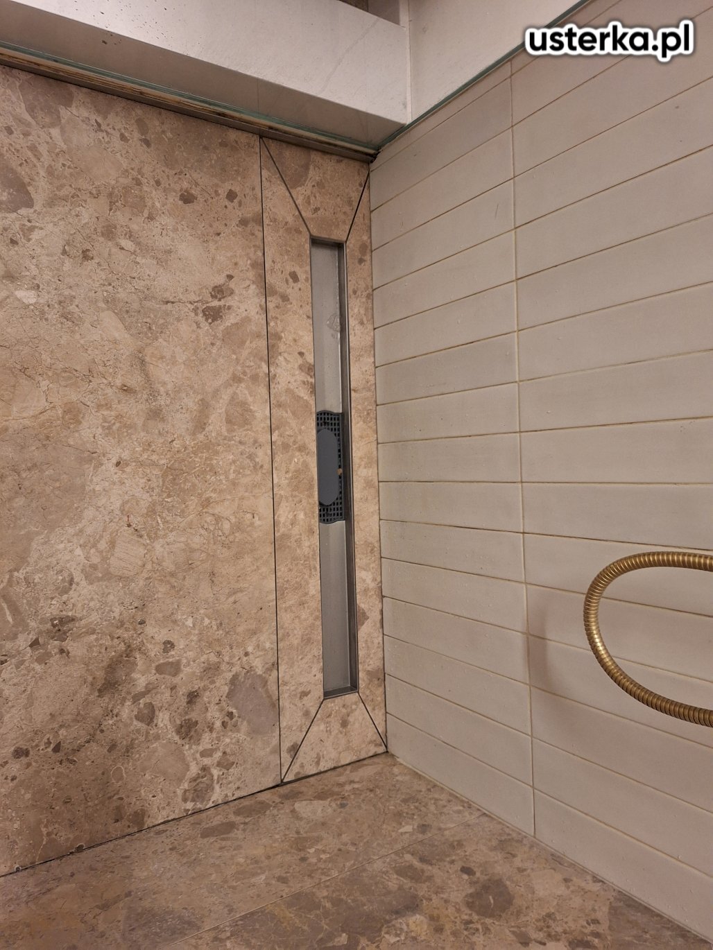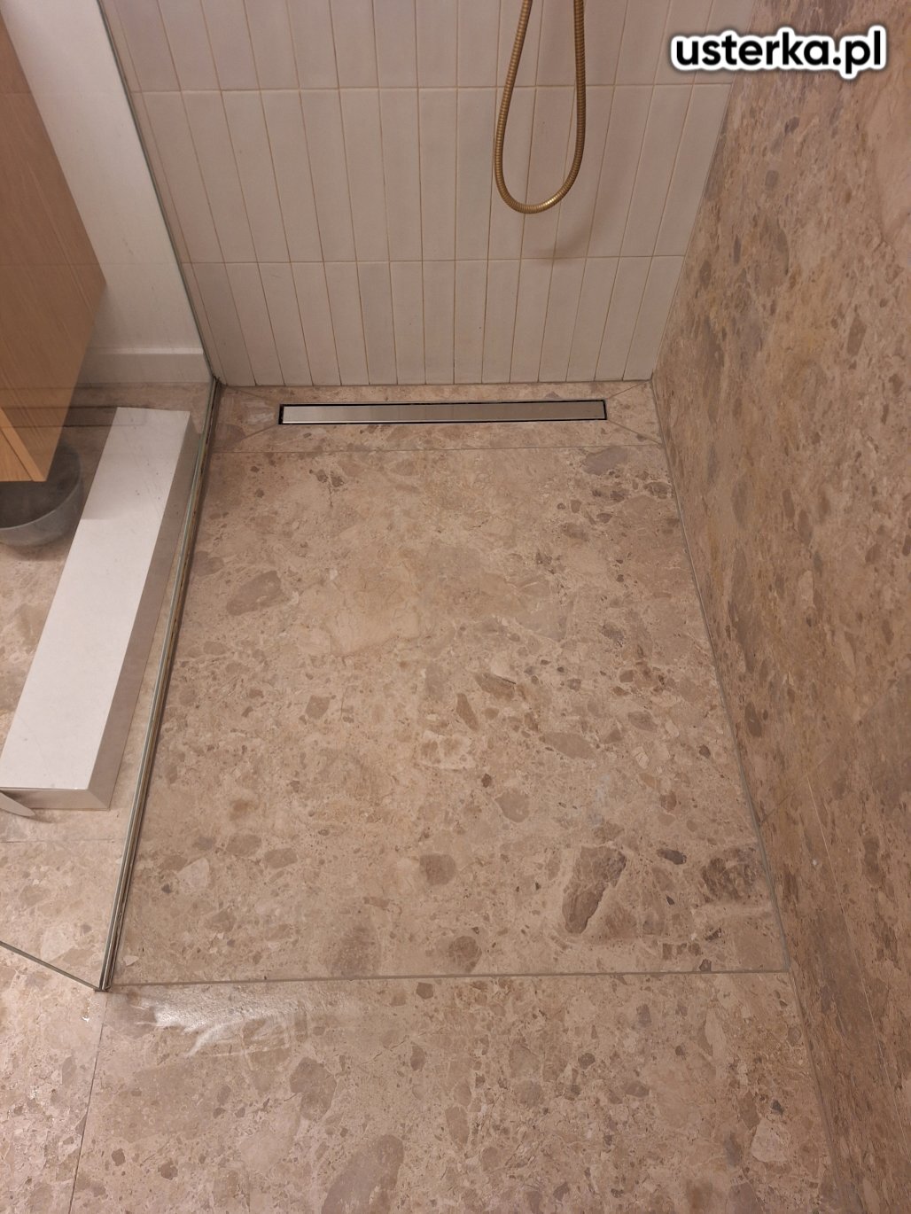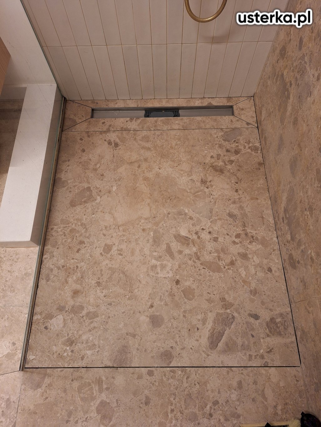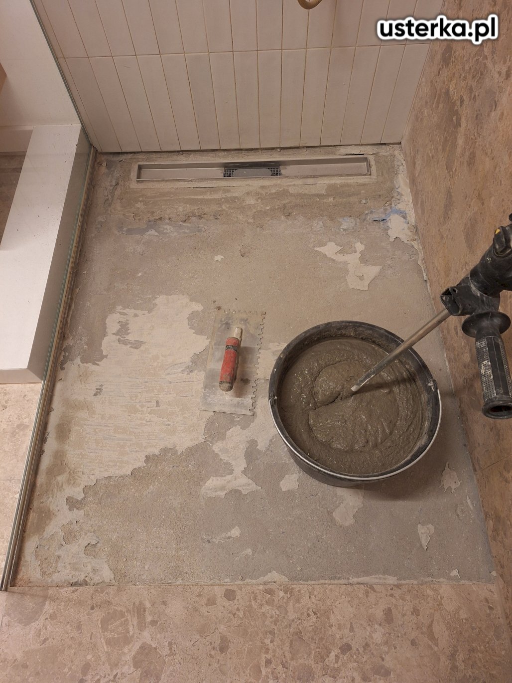 Skułem stare płytki i ułożyłem nowe na brodziku z odpływem liniowym, wykonując odpowiednie spadki dla prawidłowego odpływu wody.