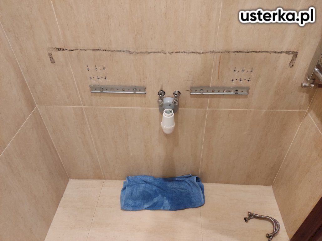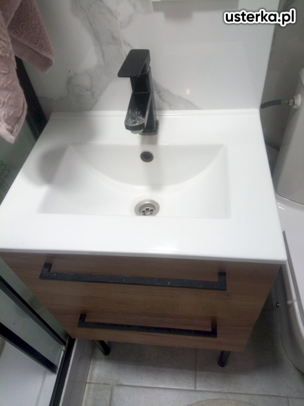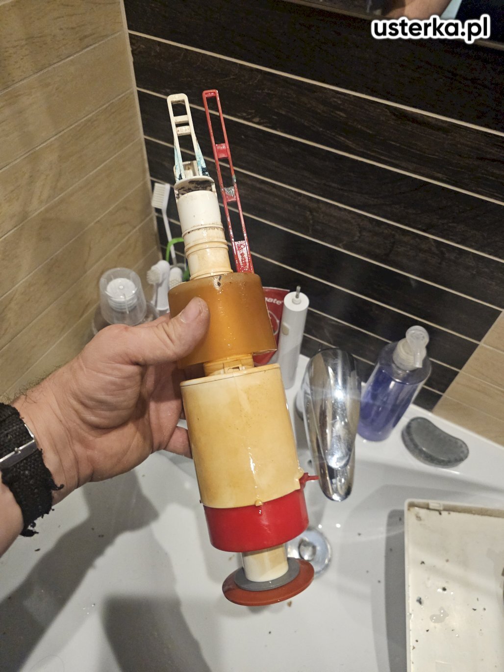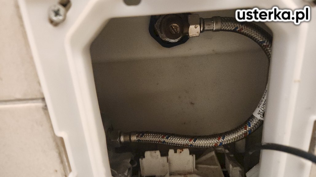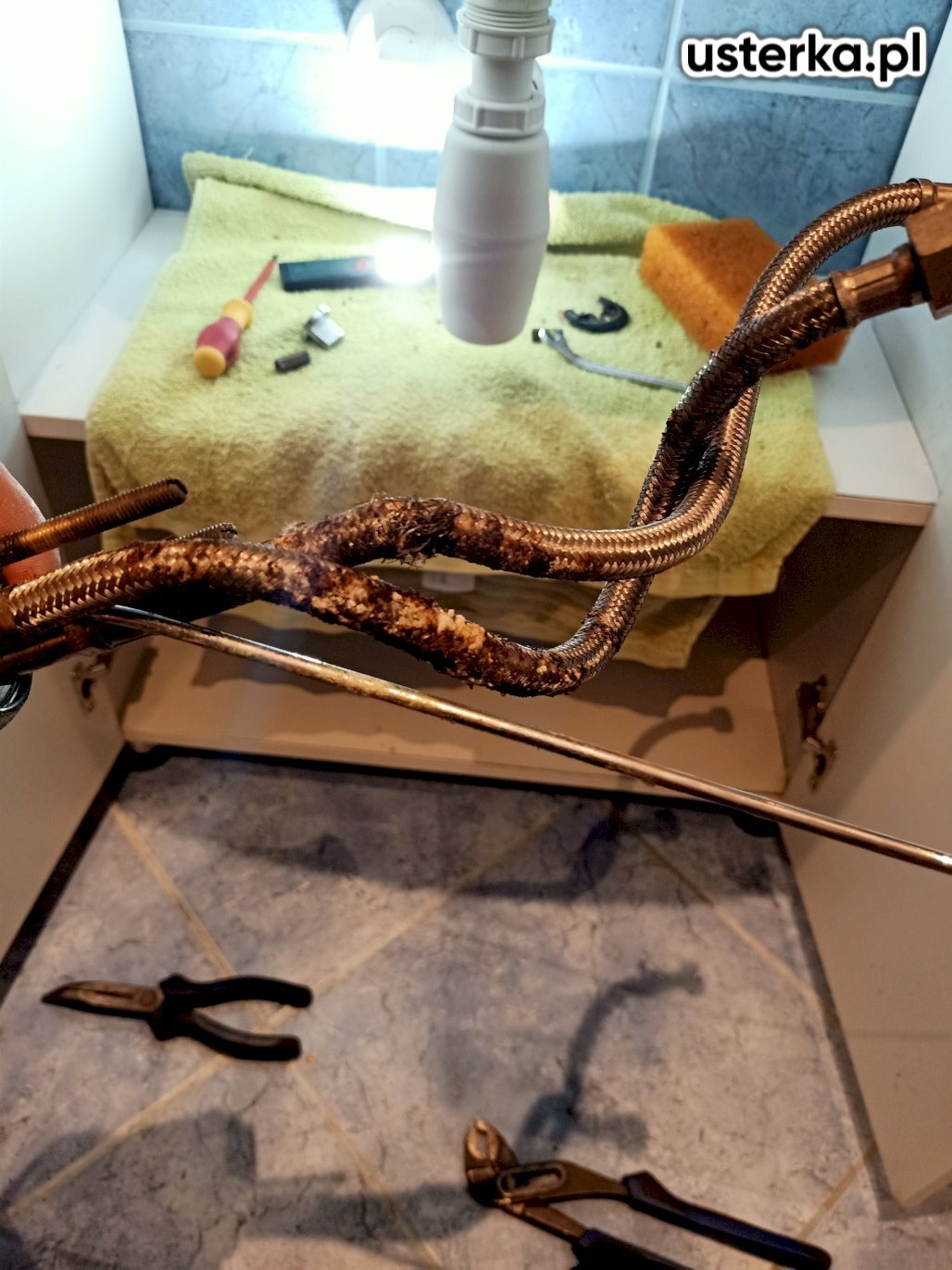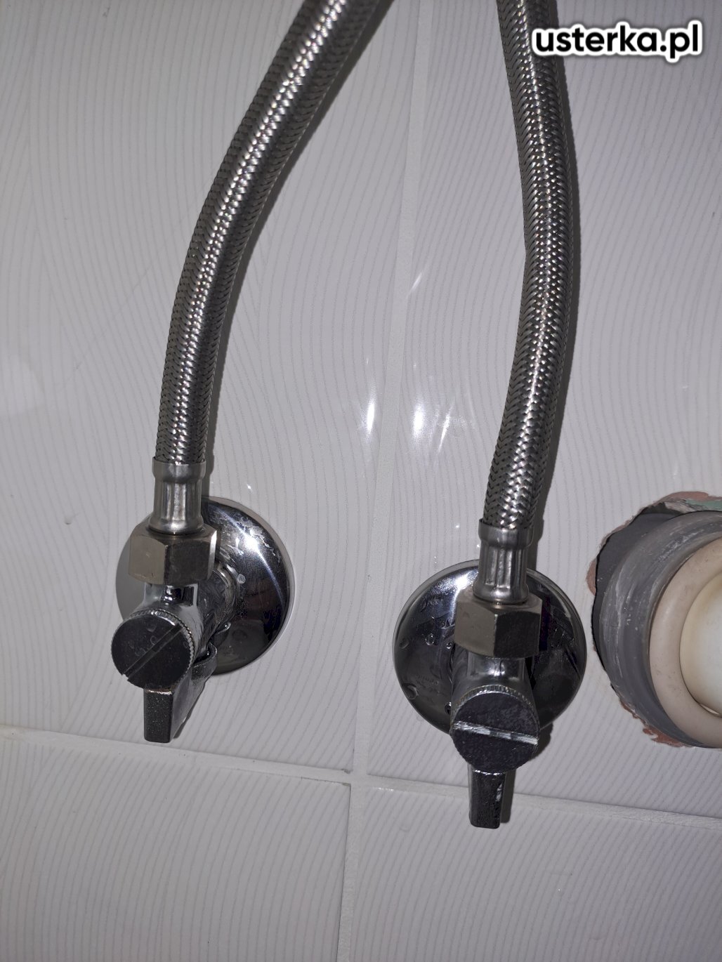 Wymieniono zawór napełniający w spłuczce oraz baterię umywalkową. Do montażu użyto wężyków z poprzedniej baterii, ponieważ nowe okazały się za krótkie. Wężyki były w dobrym stanie, gdyż wcześniejsza wymiana baterii wynikała z uszkodzenia mechanicznego rączki, a nie zużycia.