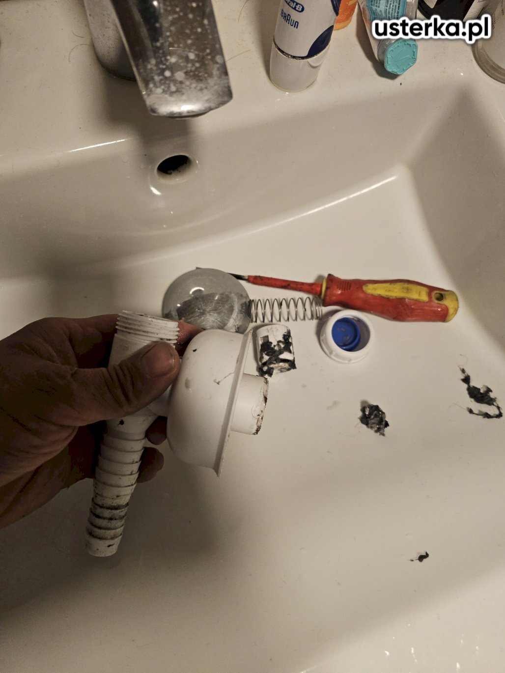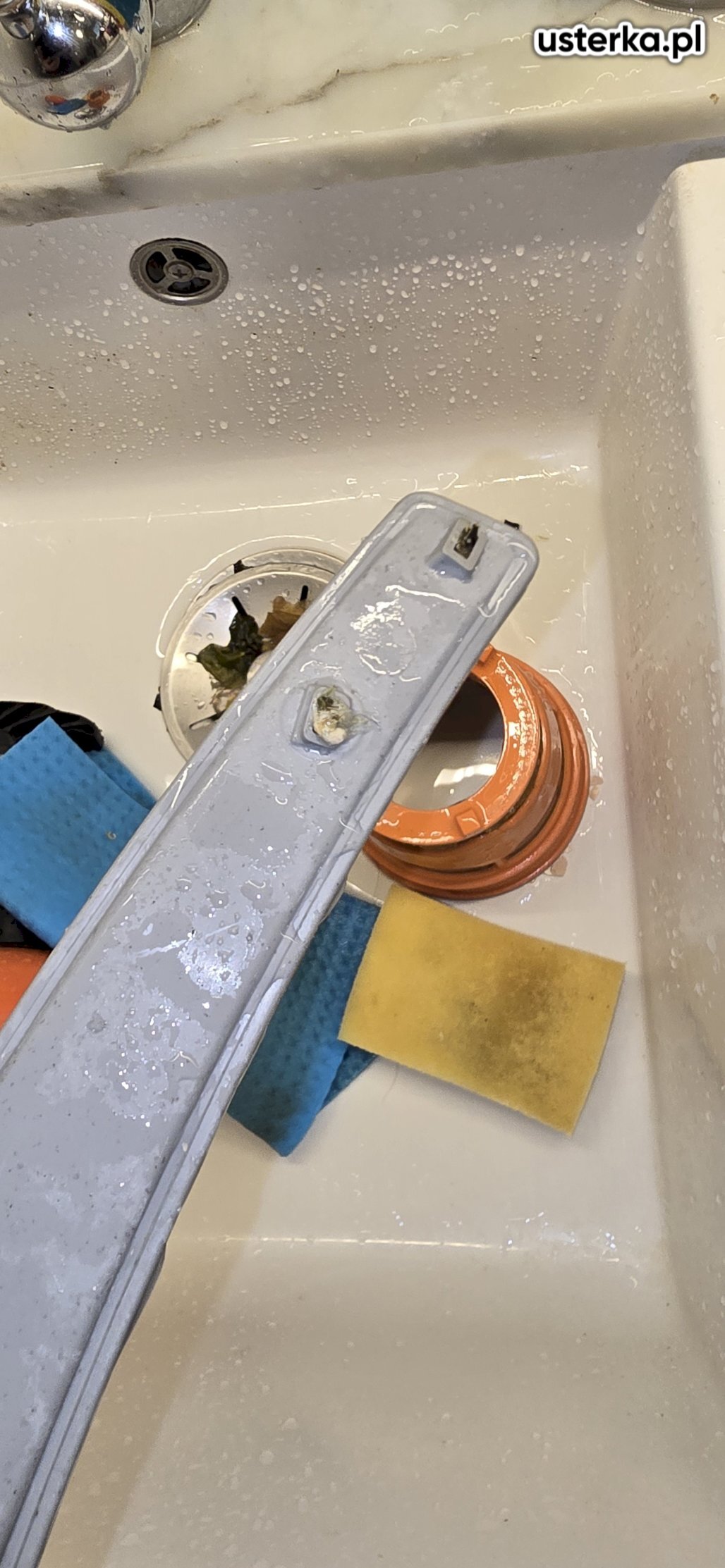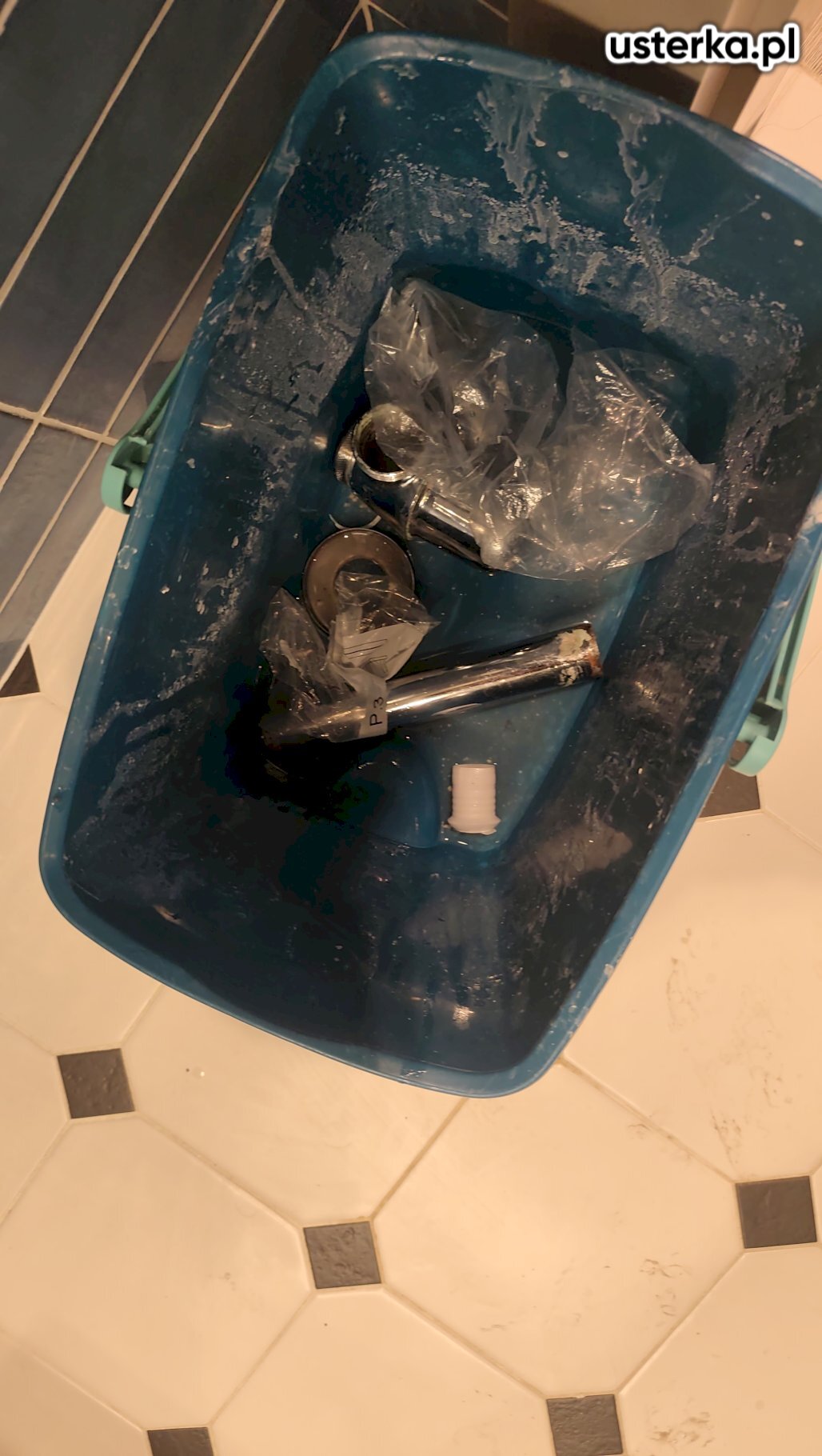 Wizyta obejmowała wymianę baterii umywalkowej, korka klik-klak w umywalce oraz amortyzatorów w drzwiczkach szafki.