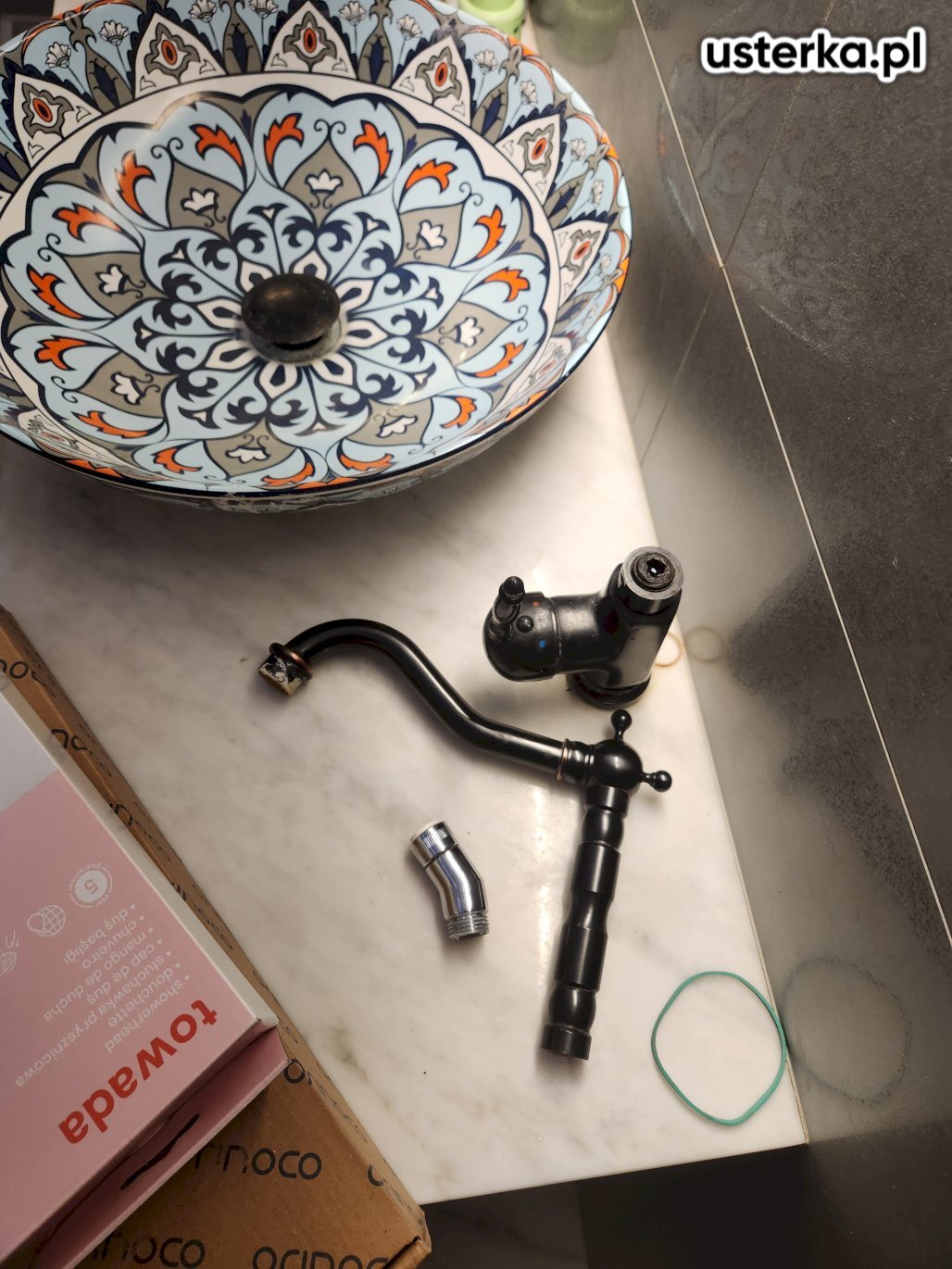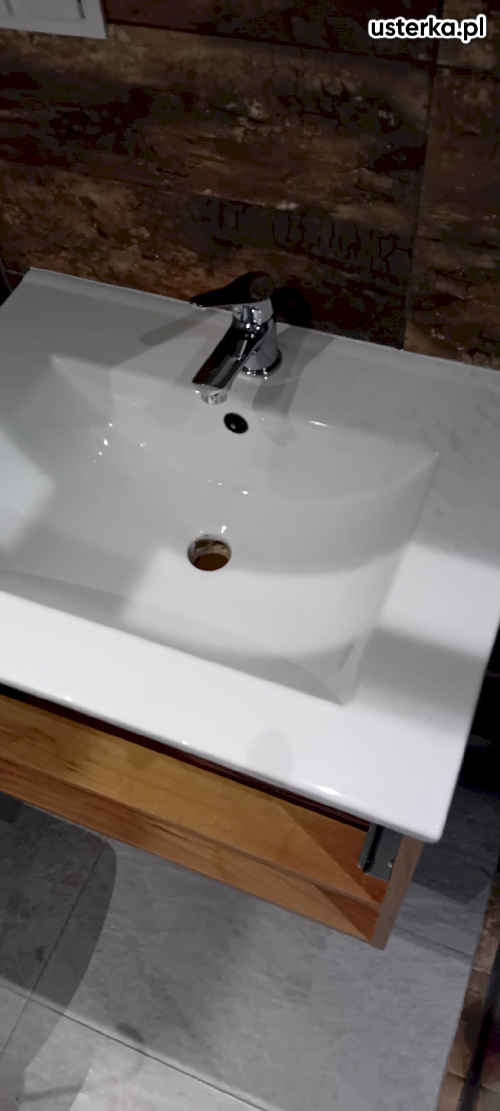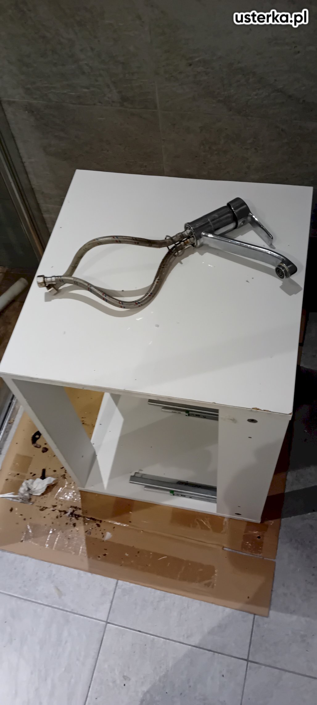 Wizyta obejmowała wymianę baterii umywalkowej, korka klik-klak w umywalce oraz amortyzatorów w drzwiczkach szafki.