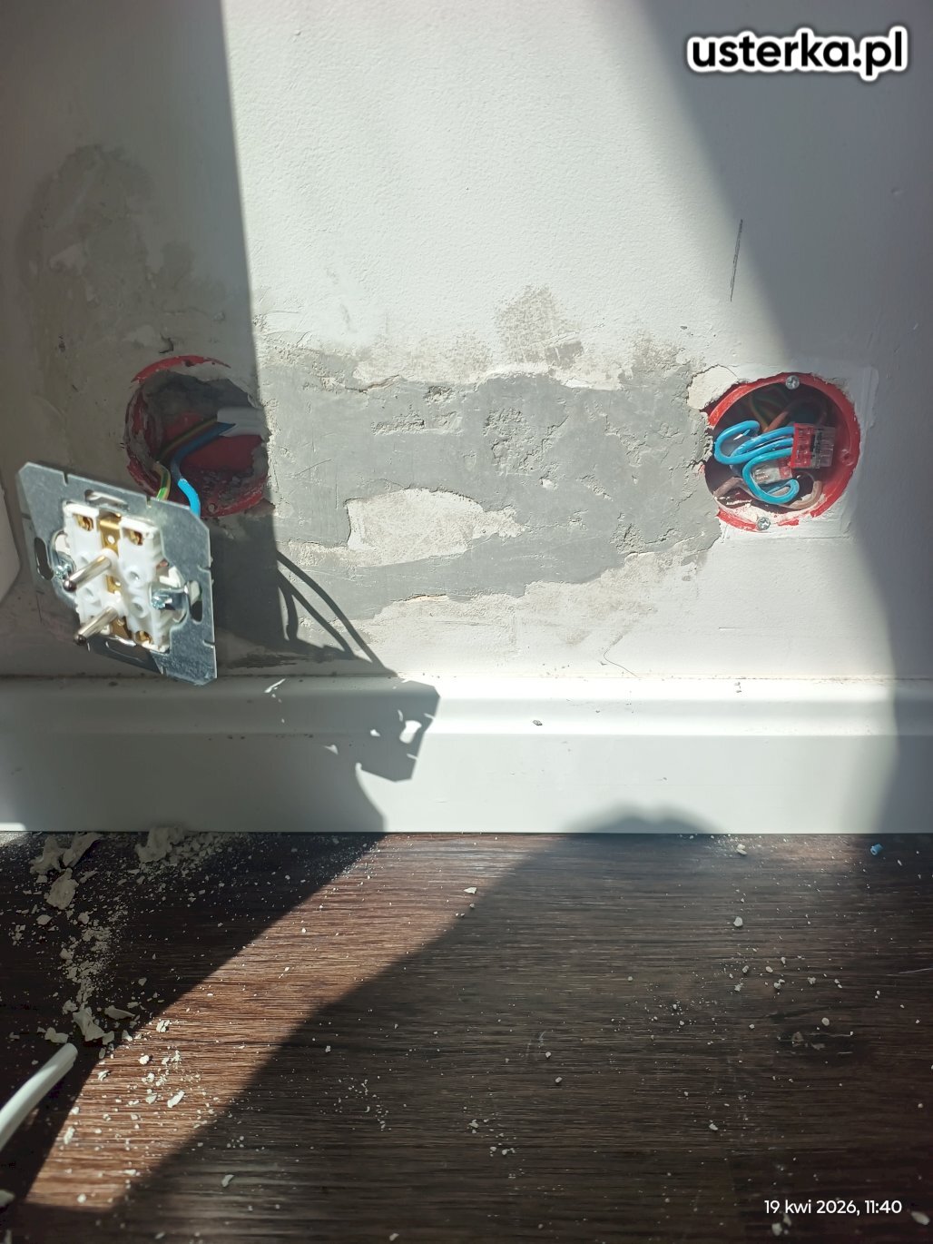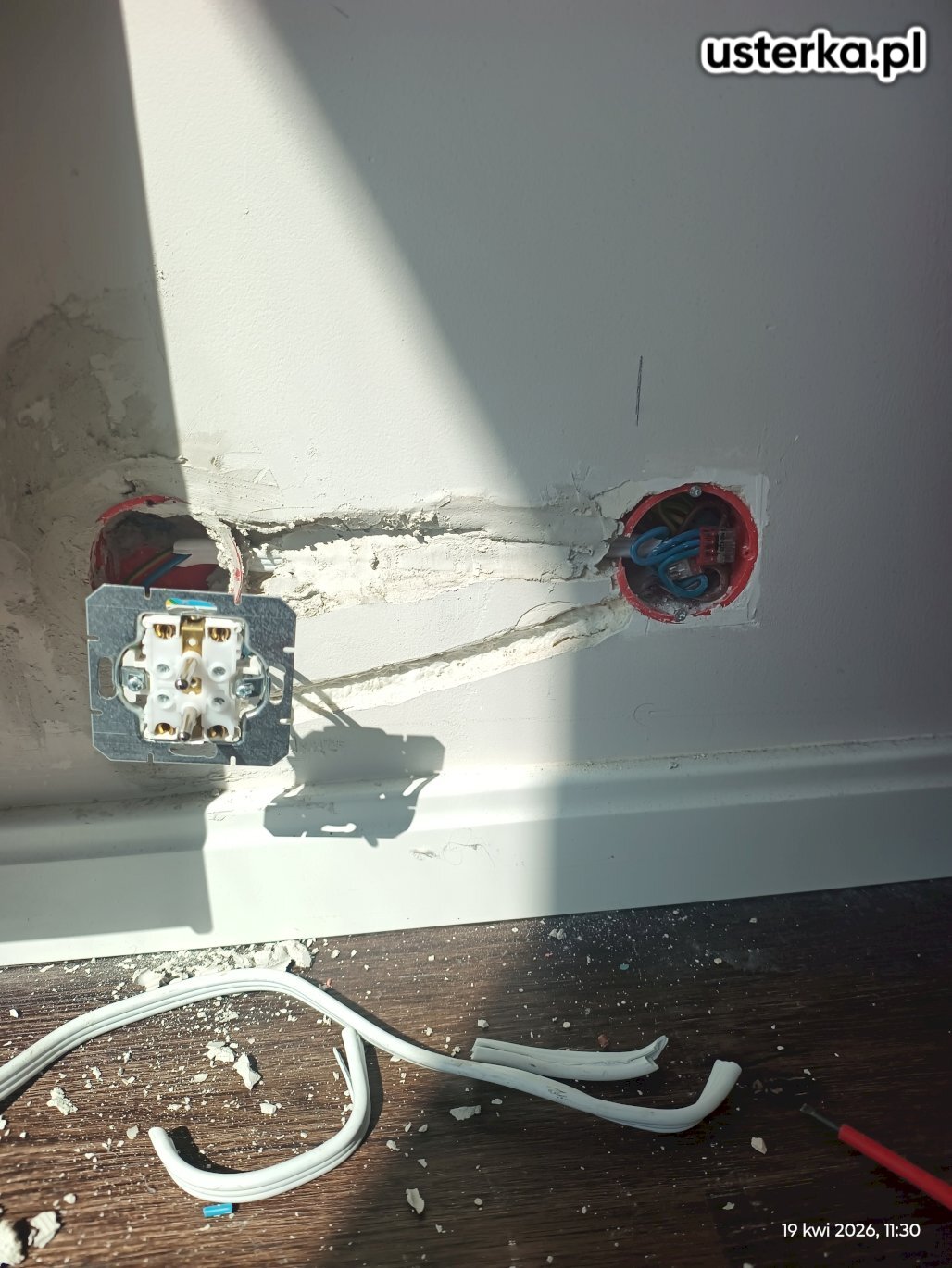 Naprawa instalacji elektrycznej w mieszkaniu. Załączenie bezpiecznika obwodu gniazdek w dwóch pokojach powodowało zadziałanie wyłącznika różnicowoprądowego. Przyczyną usterki był przewód fazowy w jednym z gniazdek, stykający się z wkrętem mocującym gniazdo w puszce.