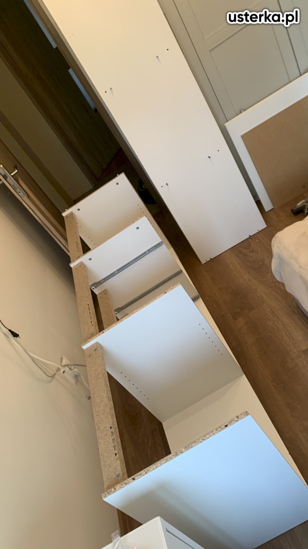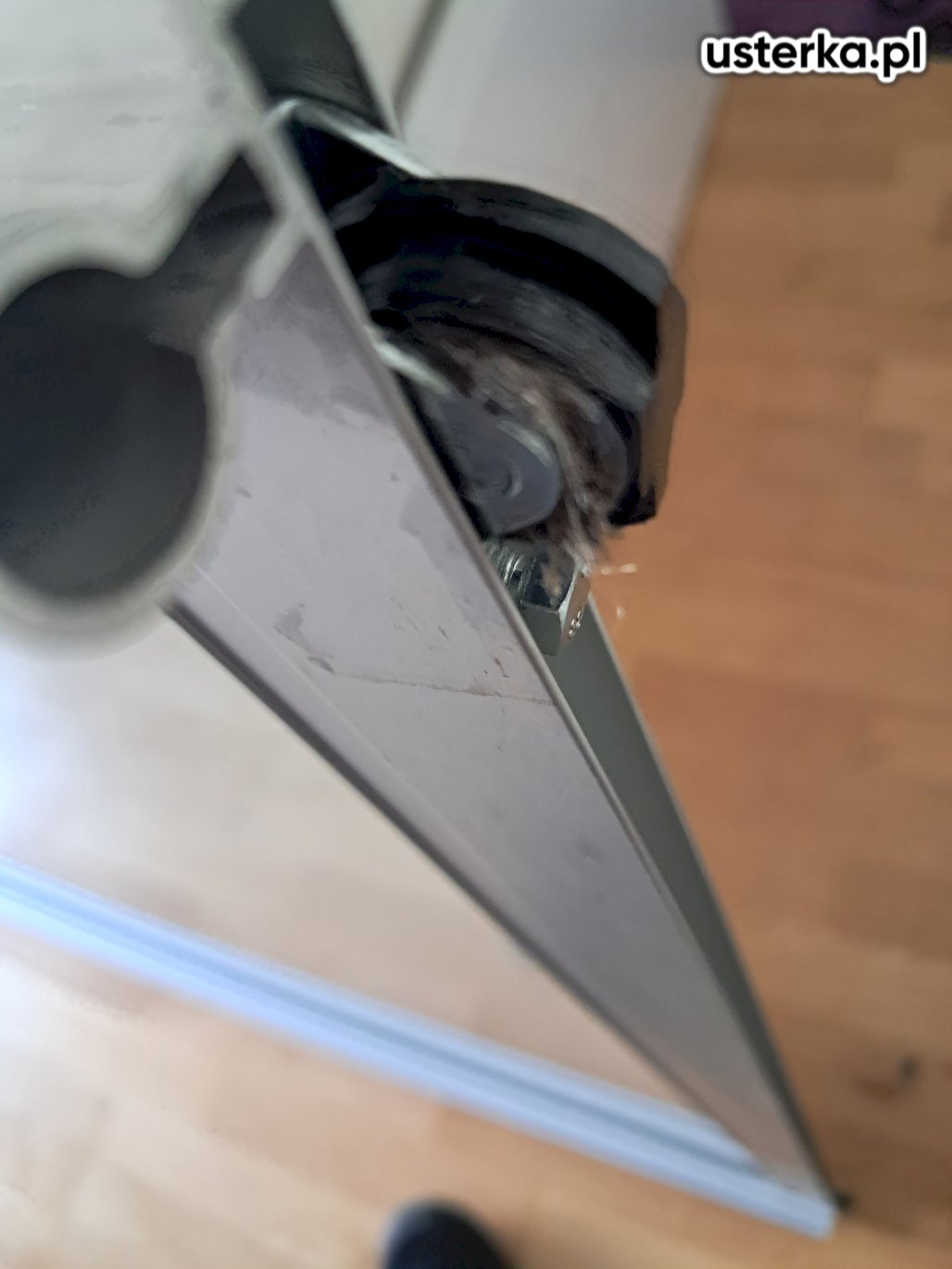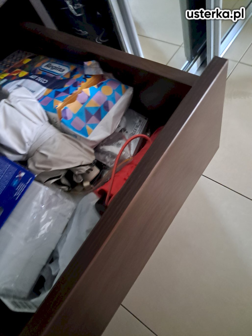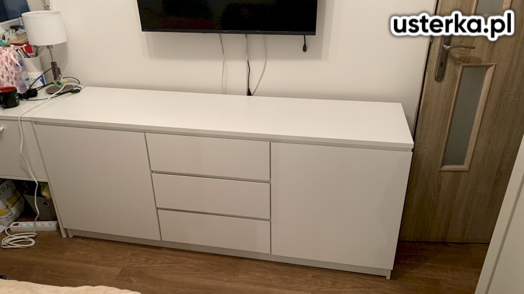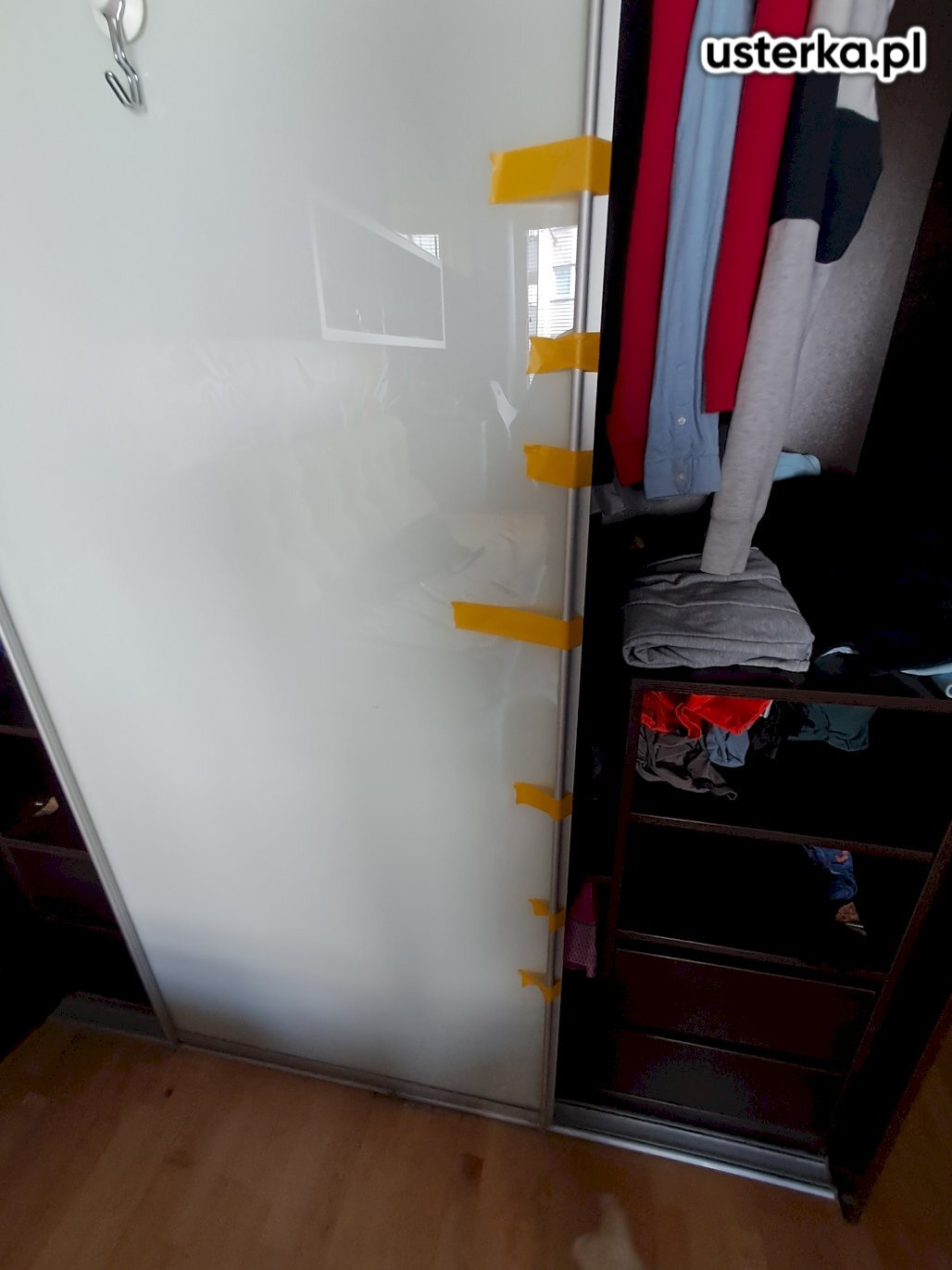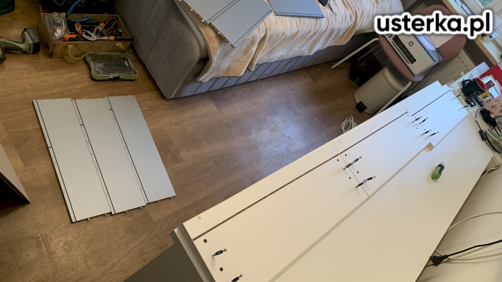 Naprawiono drzwi przesuwne. Wyregulowano opadającą szufladę oraz sprawdzono żaluzję drewnianą; mechanizm był wyrobiony, po korekcie działa lepiej. Podklejono również lustro do aluminiowej ramy.