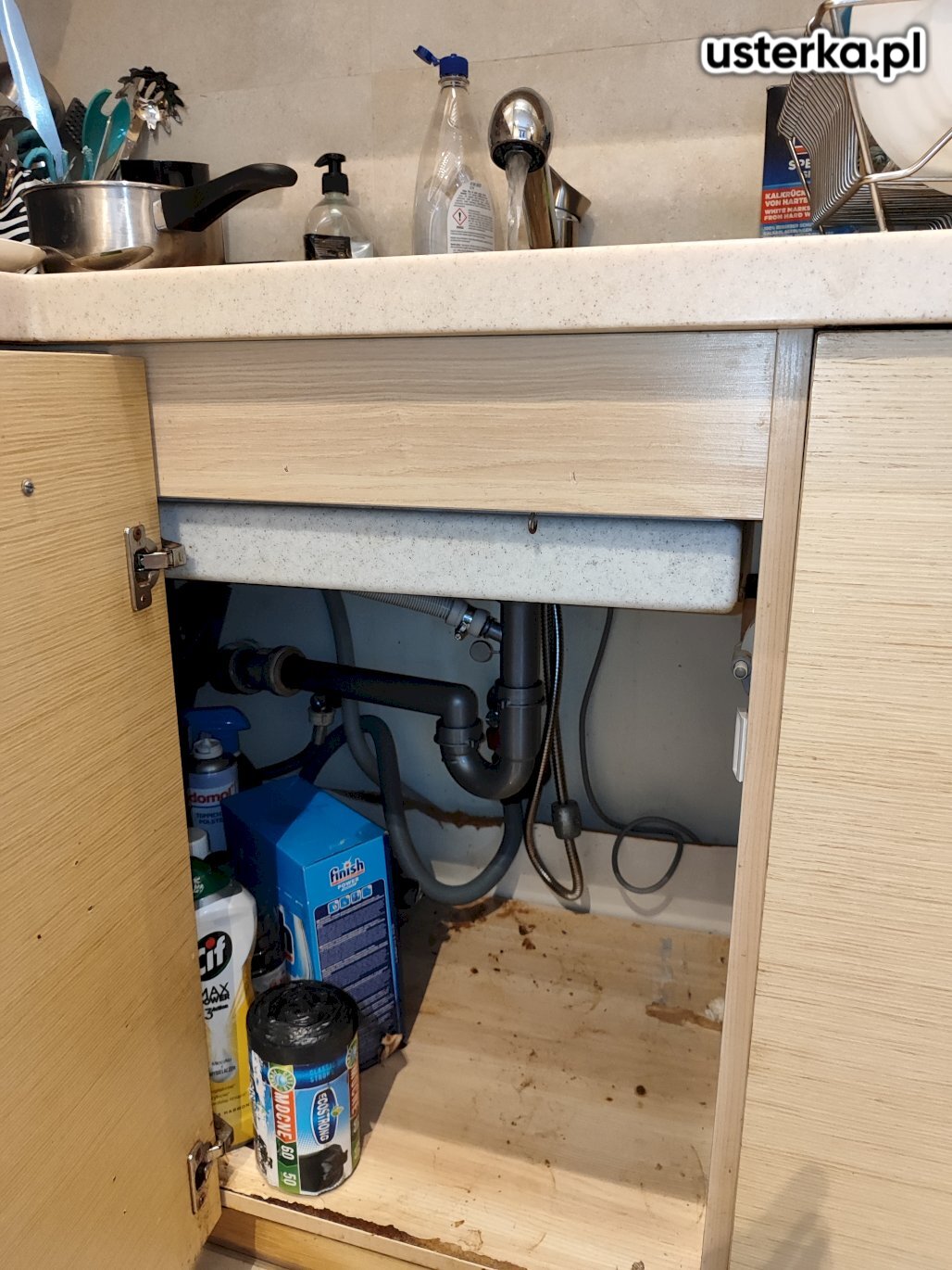 Wymieniłem uszczelki w syfonie pod zlewem, co wyeliminowało przeciek.