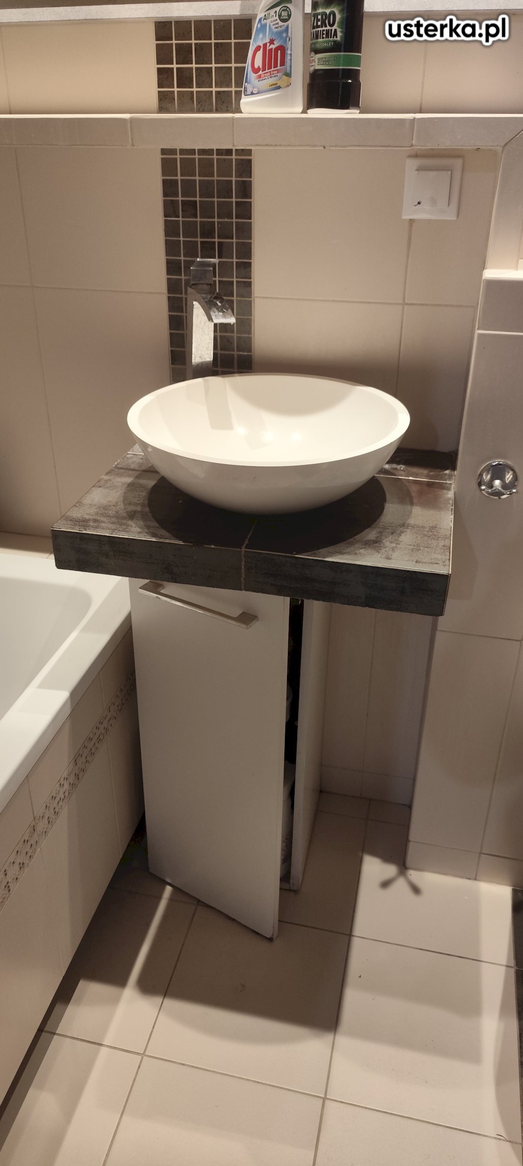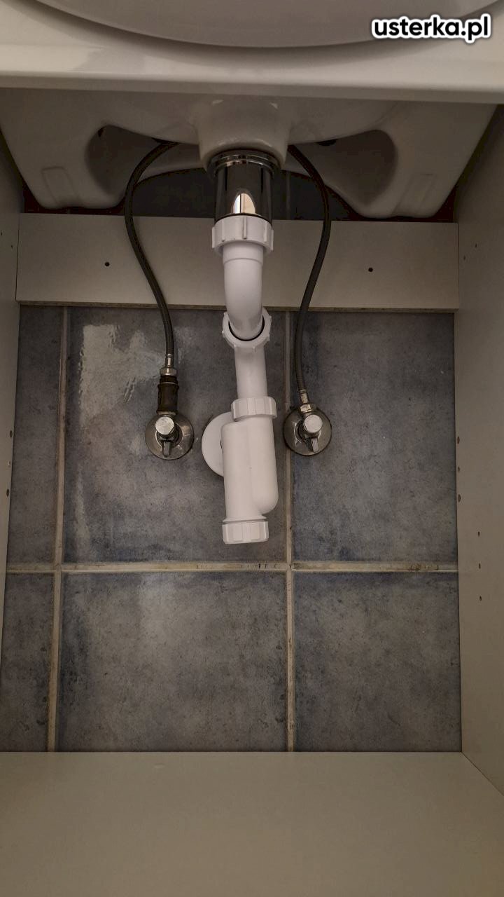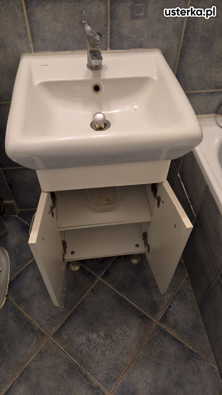Zdemontowałem starą szafkę, umywalkę i kran, a następnie zamontowałem nowy zestaw, dopasowując go do istniejących przyłączy. Szafka została zabezpieczona silikonem przy ścianie, aby zapobiec przeciekaniu wody.