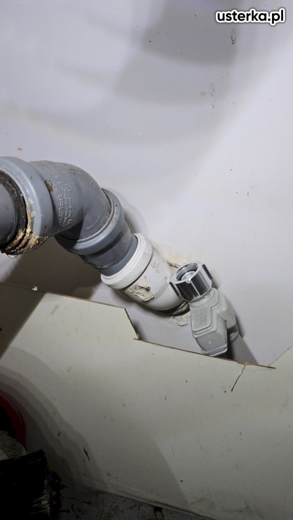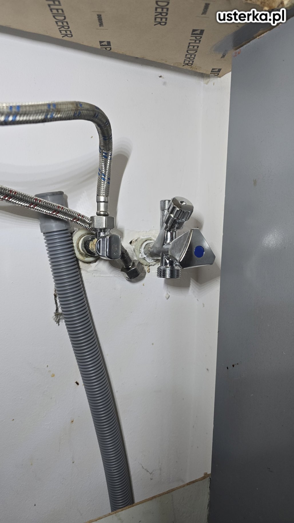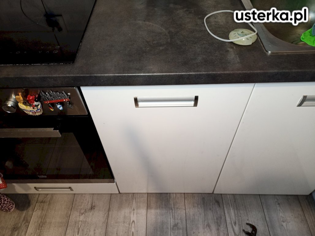 Podczas wizyty podłączono zmywarkę, wymieniono zawór na podwójny oraz wykonano otwory w cokole i szafce na przewody wodne.