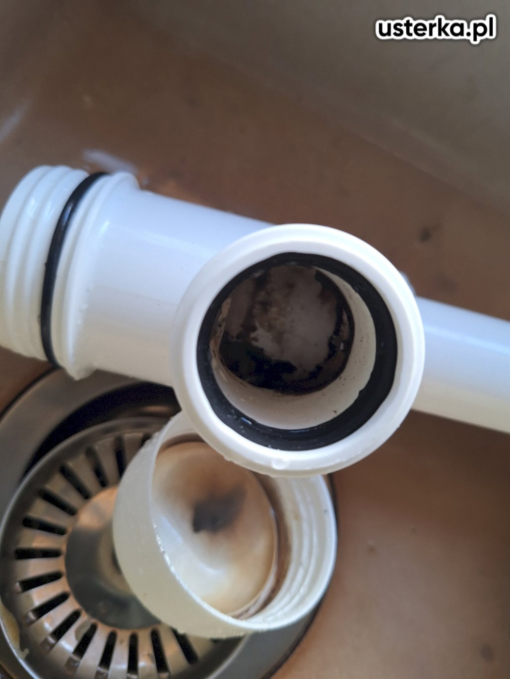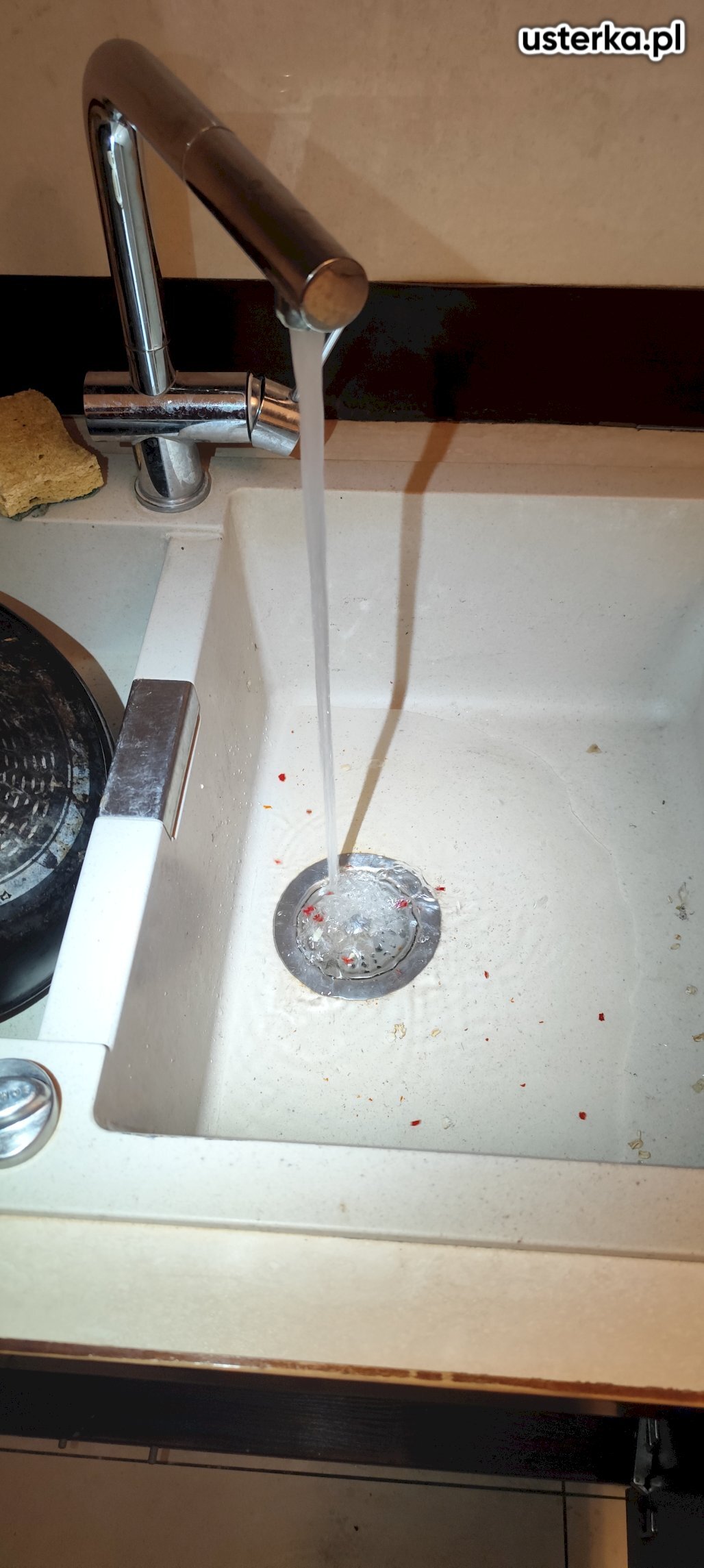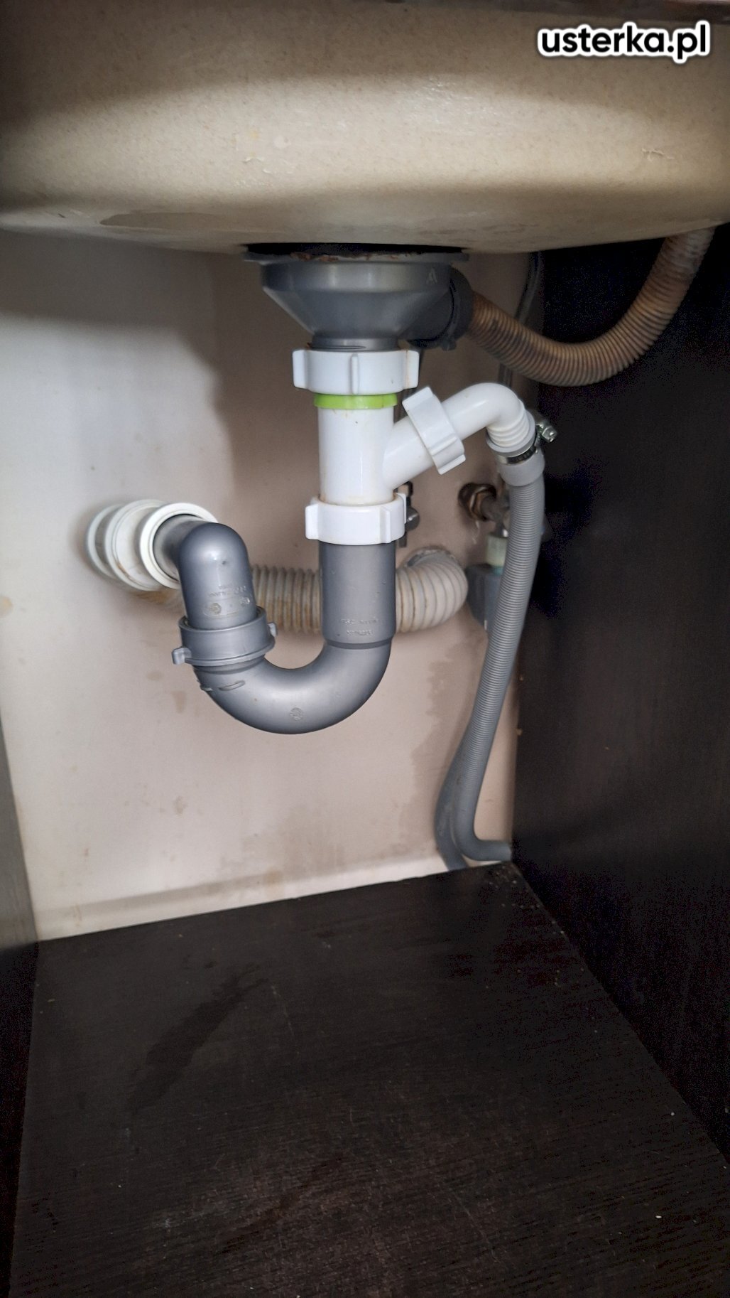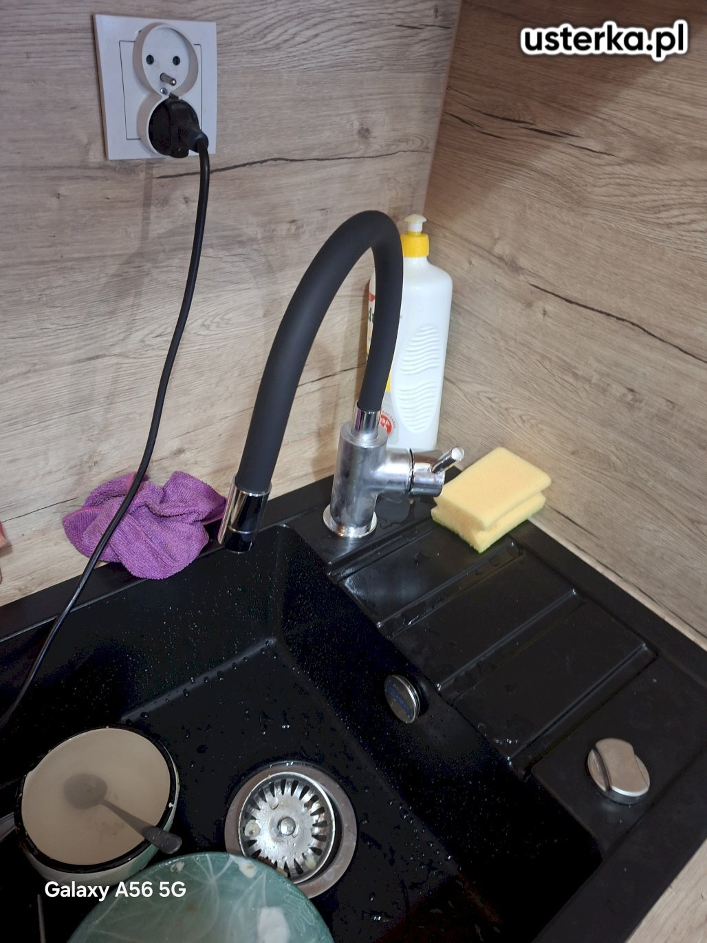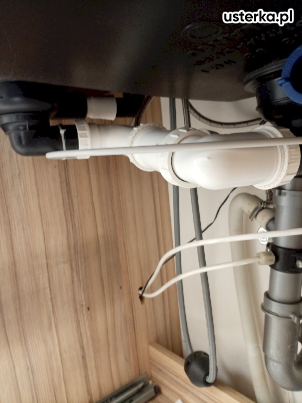 Zamontowano nowy zlewozmywak w istniejącym otworze, który okazał się nieco za szeroki, co ogranicza powierzchnię docisku uszczelki. Zainstalowano nowy syfon i sprawdzono szczelność – wycieków nie stwierdzono.