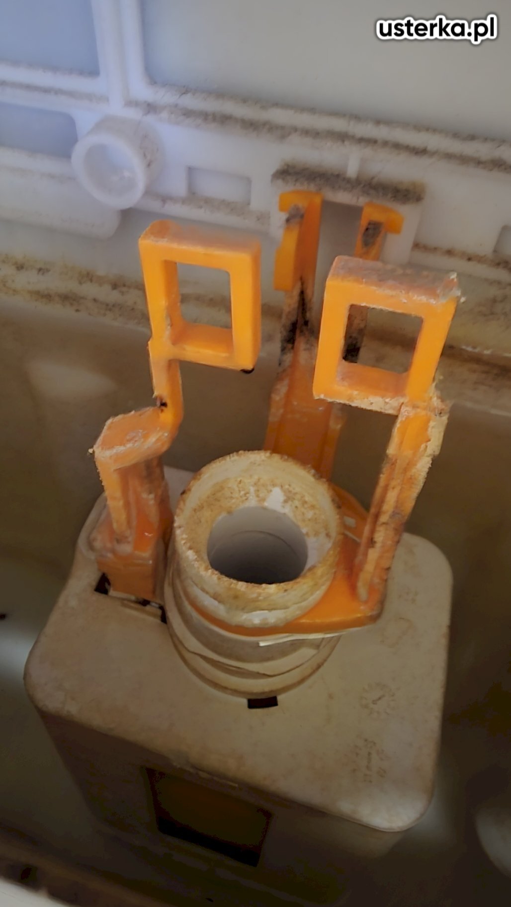Wyczyszczono zawór spustowy z osadów kamienia, co usunęło problem wycieku wody ze spłuczki.