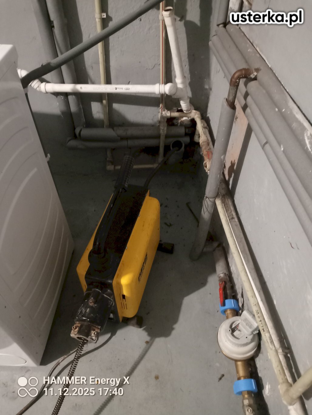Udrożniłem kanalizację w pralni za pomocą spirali elektrycznej, co rozwiązało problem cofającej się wody z pralki.