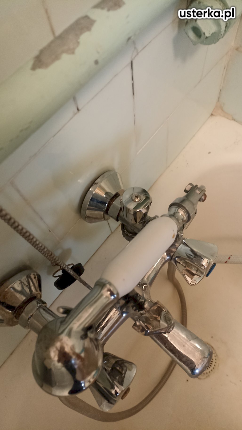 Przyczyną wycieku jest zakamieniony przełącznik natrysku. Zalecam wymianę tej części.