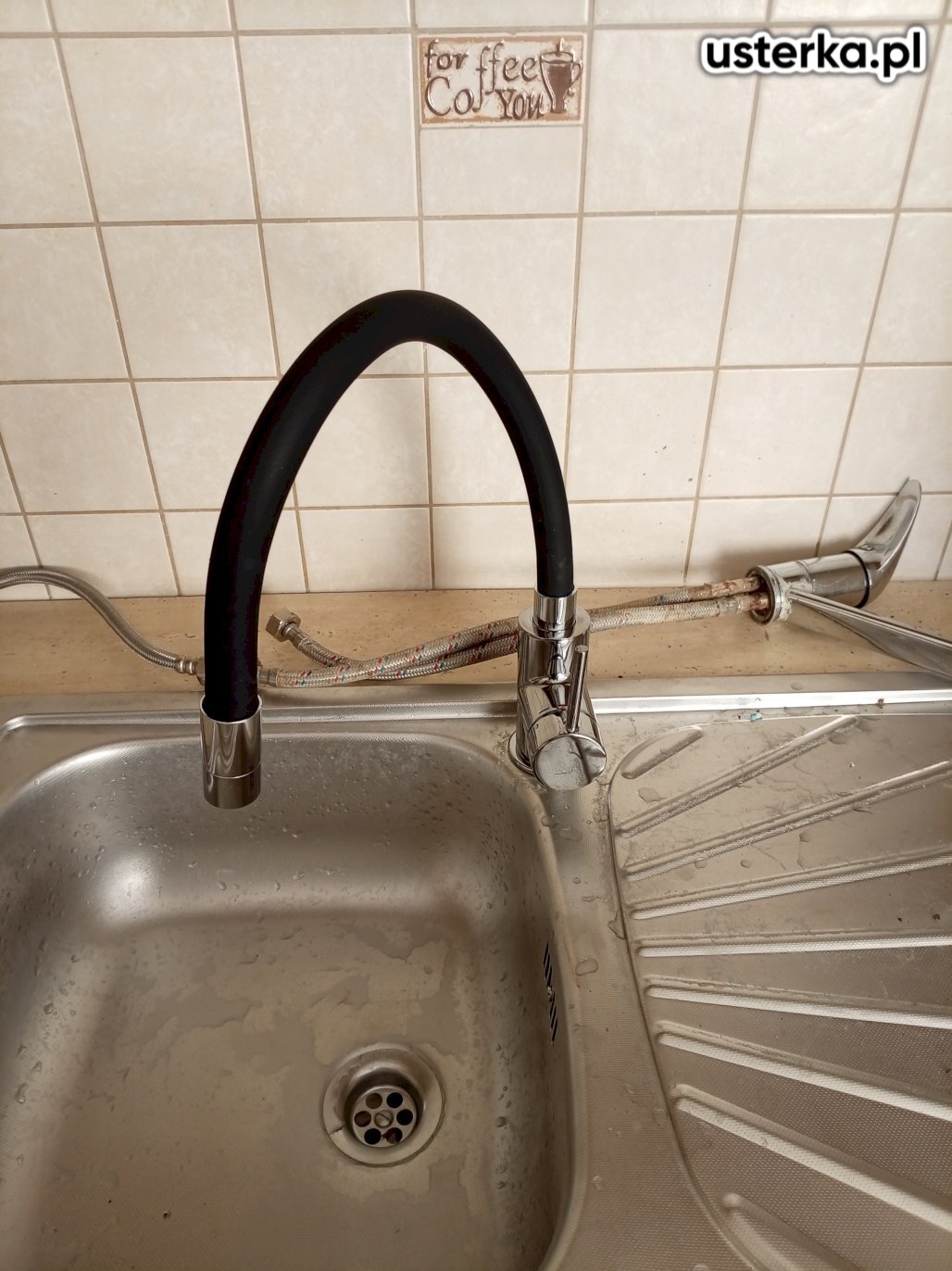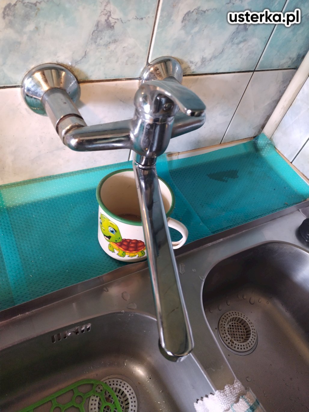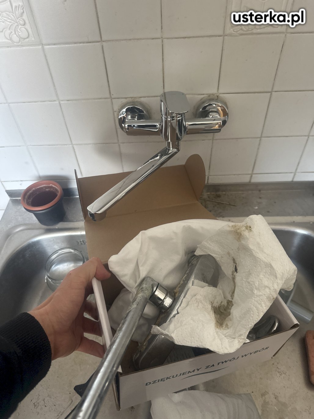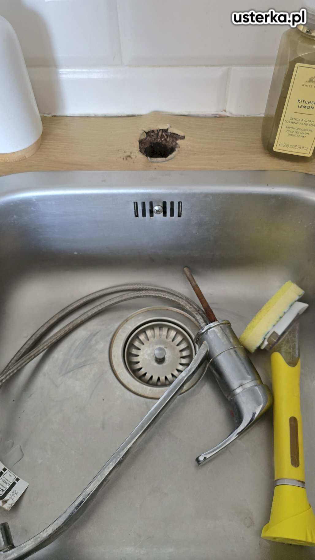 Wizyta obejmowała wymianę baterii kuchennej. Nowa bateria została zamontowana, jednak blat jest mocno zawilgocony i uszkodzony.