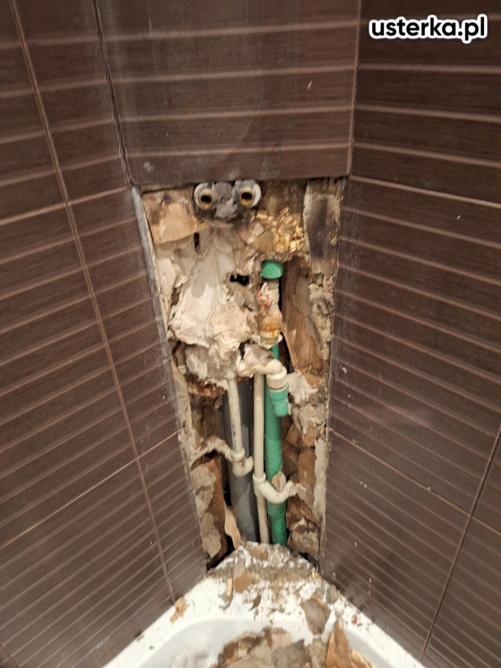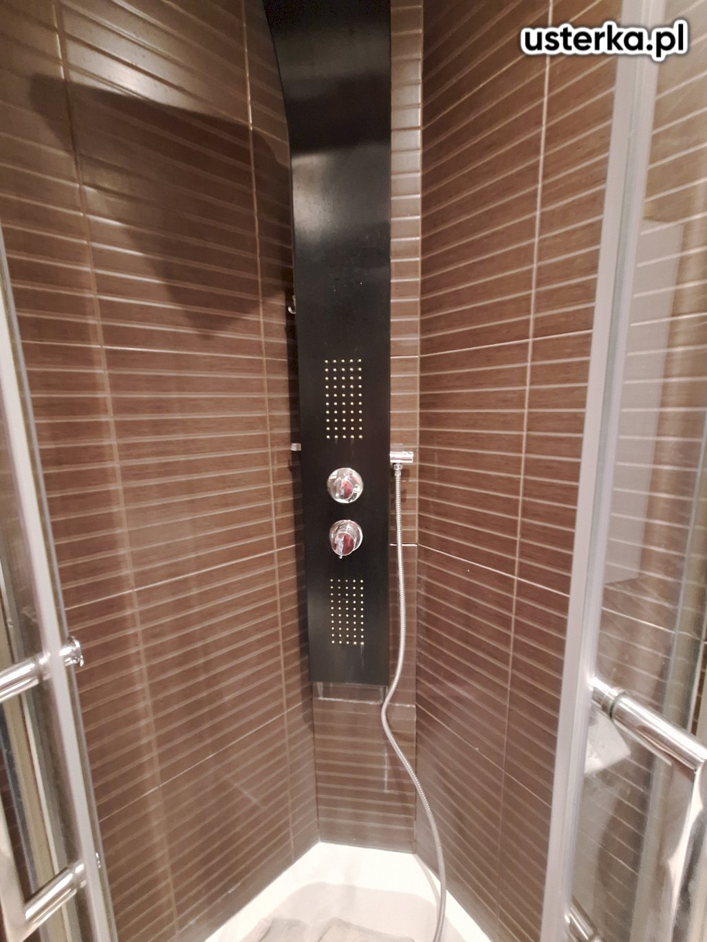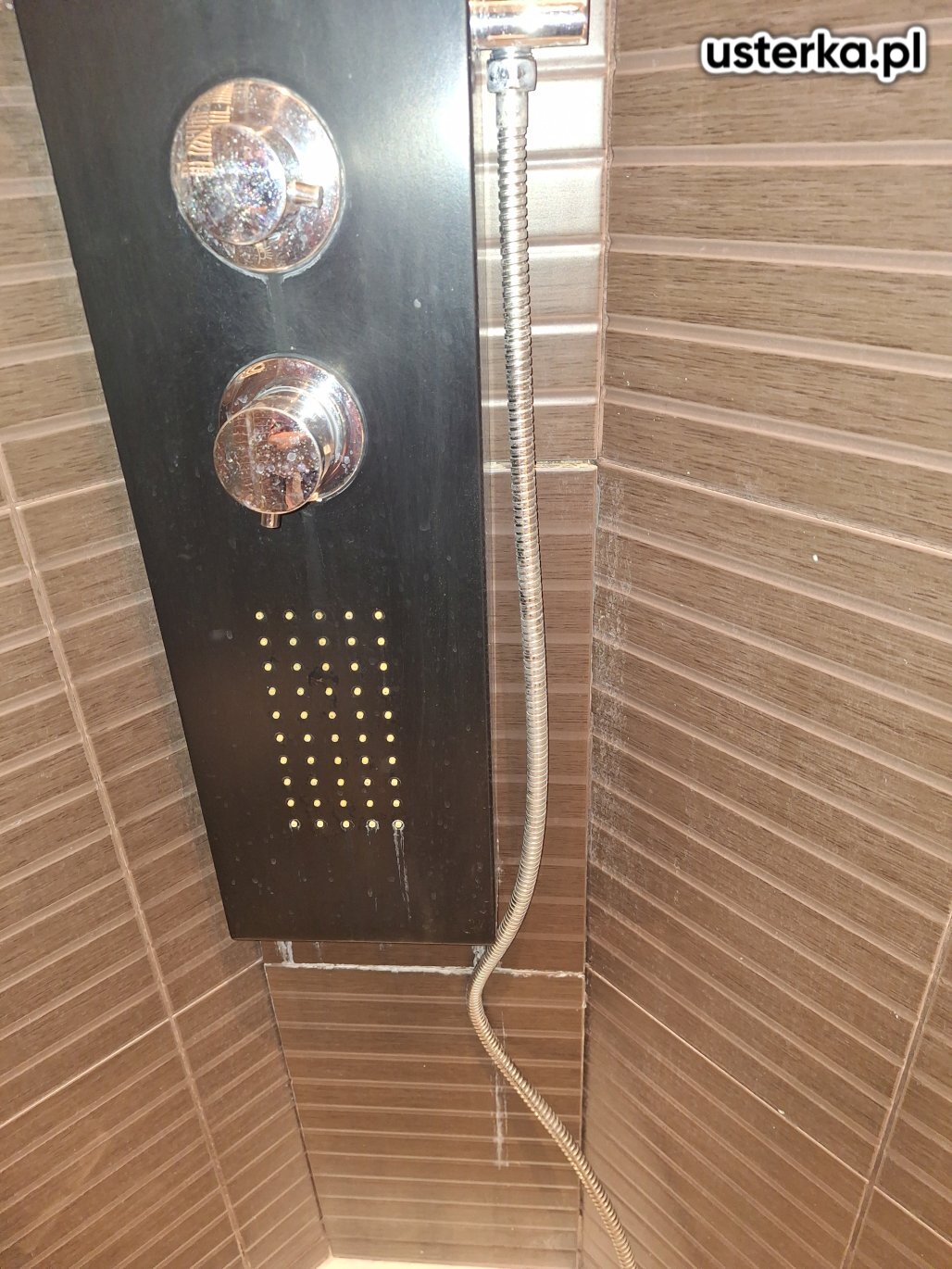 Po oględzinach stwierdziłem, że przyczyną przecieku były luźne płytki pod kolumną prysznicową oraz nieszczelna fuga, przez którą woda przedostawała się za ścianę i powodowała zawilgocenie płyt GK. Zdemontowałem kolumnę i płytki, tymczasowo zabezpieczyłem instalację wodną.