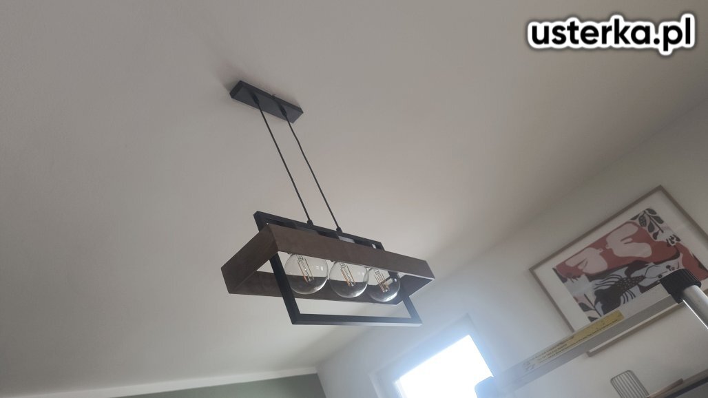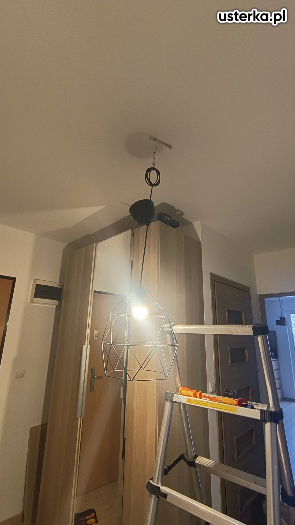 Zdemontowałem starą lampę i zamontowałem nową, metalową lampę o wadze 7 kg na suficie z podwójnej płyty GK. Użyłem specjalnych kołków Fischer oraz jedno mocowanie wykonałem w stelażu metalowym. Podłączyłem przewód ochronny PE do obudowy lampy. Lampa działa prawidłowo, a mocowanie jest stabilne.