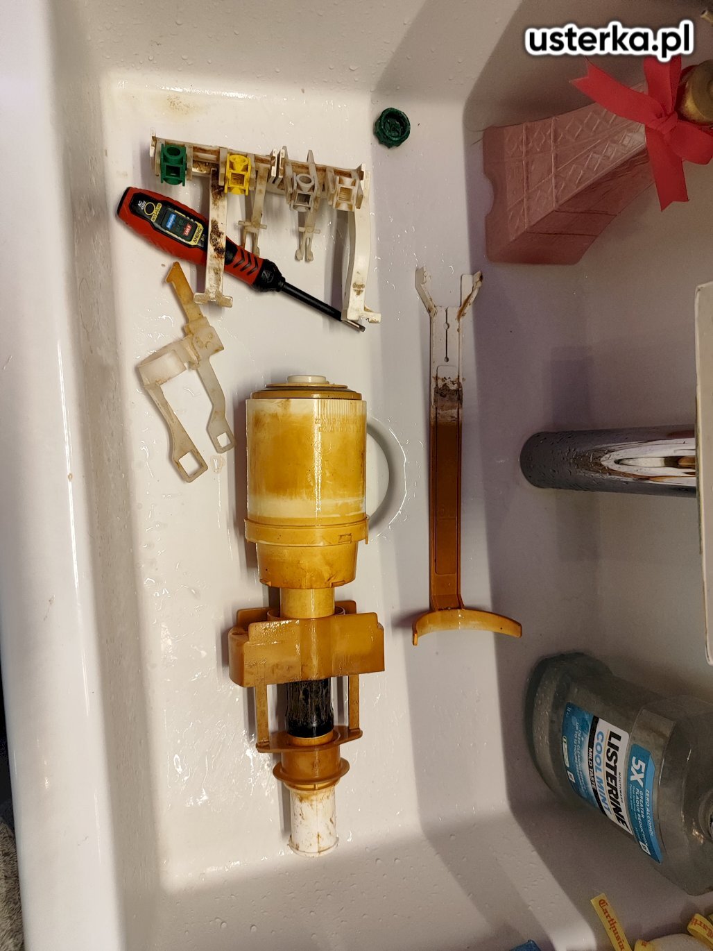 Wymieniłem zawór napełniający w spłuczce. Usterka została usunięta, spłuczka działa prawidłowo.