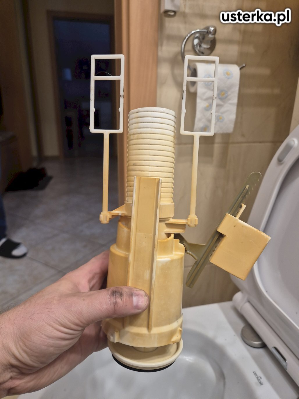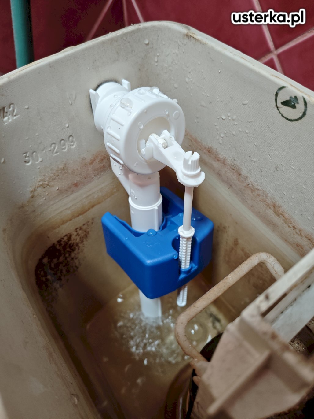 Wymieniono niesprawny zawór napełniający w spłuczce wolnostojącej, co usunęło problem z cieknącą spłuczką.