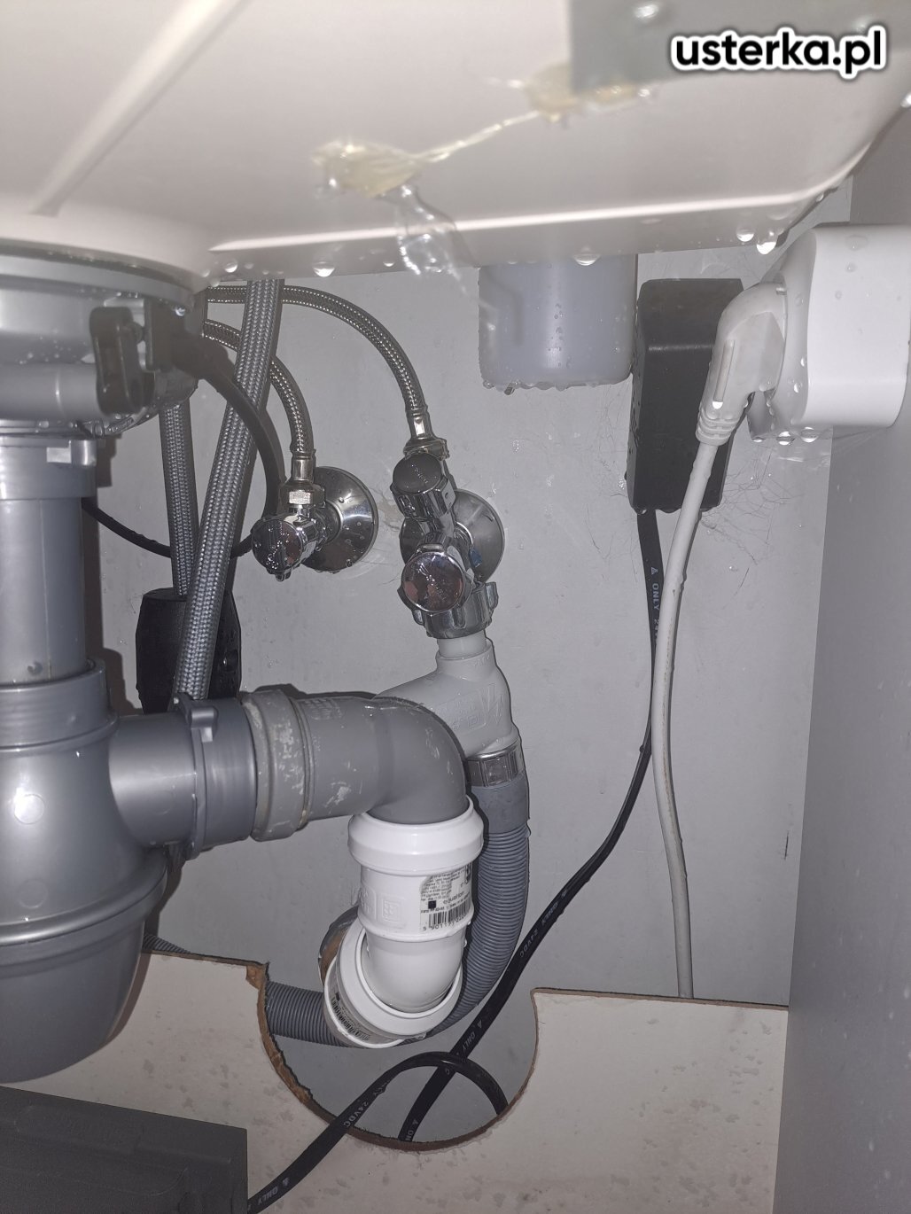 Zlokalizowano wyciek w syfonie pod zlewem. Wymieniono uszczelkę gumową, co wyeliminowało problem. Dodatkowo syfon został wyczyszczony. Instalacja działa prawidłowo.