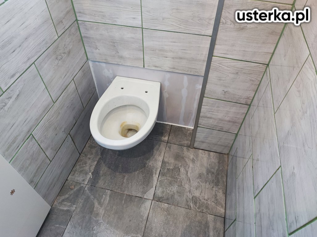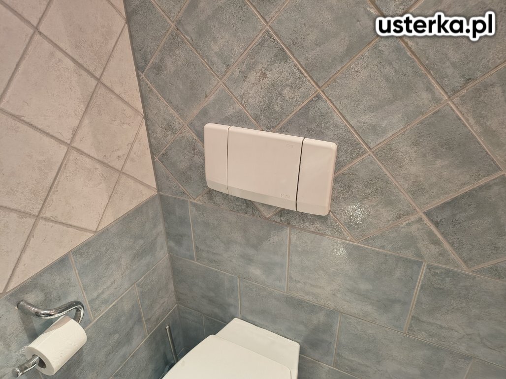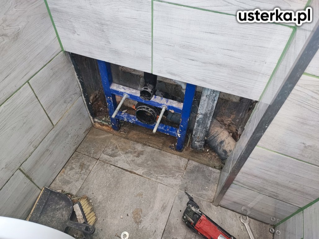 Zakres prac obejmował demontaż części kafli i zabudowy z płyt gipsowych za toaletą podwieszaną oraz wymianę uszkodzonej płyty gipsowej i kafli wraz z odtworzeniem uszkodzonych elementów.