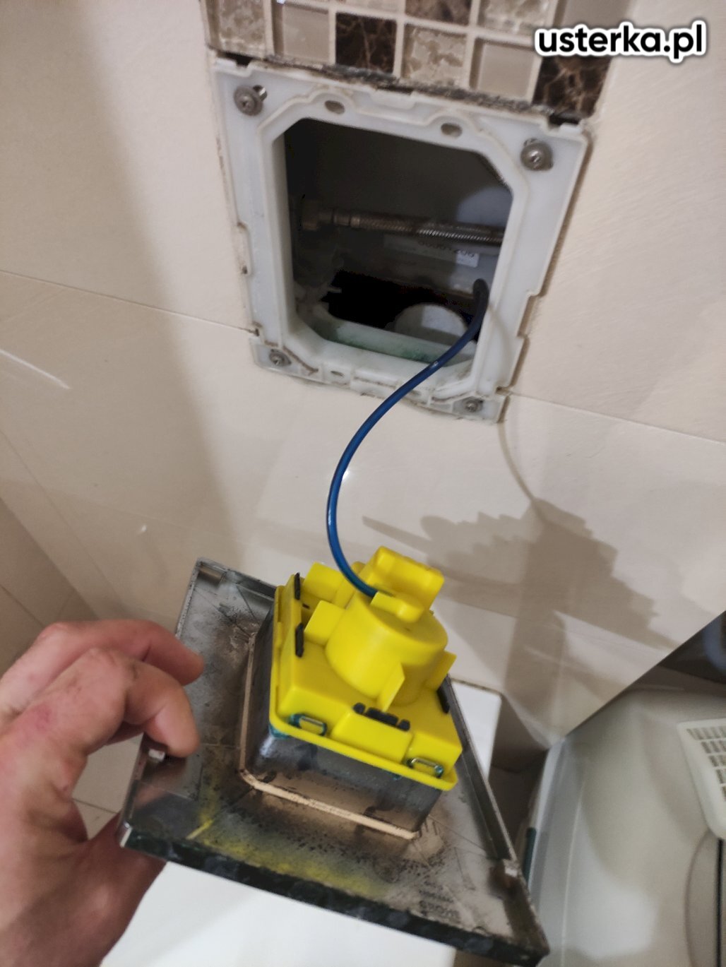 Odkamienienie dyszy zaworu napełniającego w spłuczce podtynkowej TECE oraz regulacja mechanizmu.