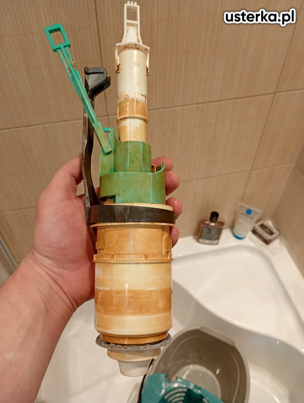 Zawór napełniający w spłuczce podtynkowej Geberit uległ awarii z powodu osadów kamienia.