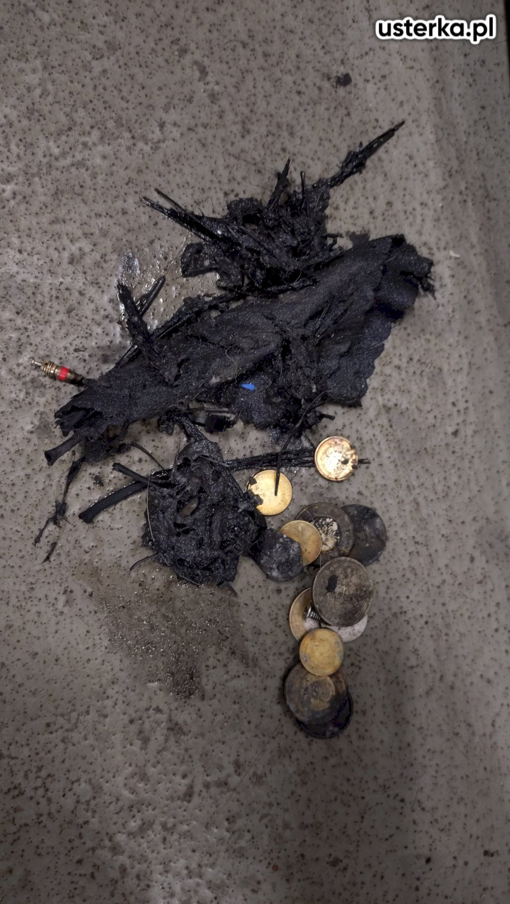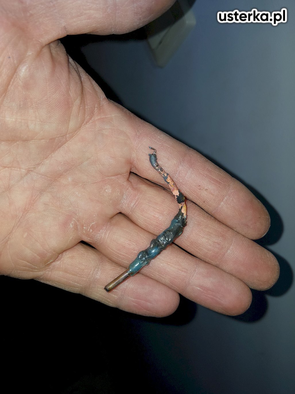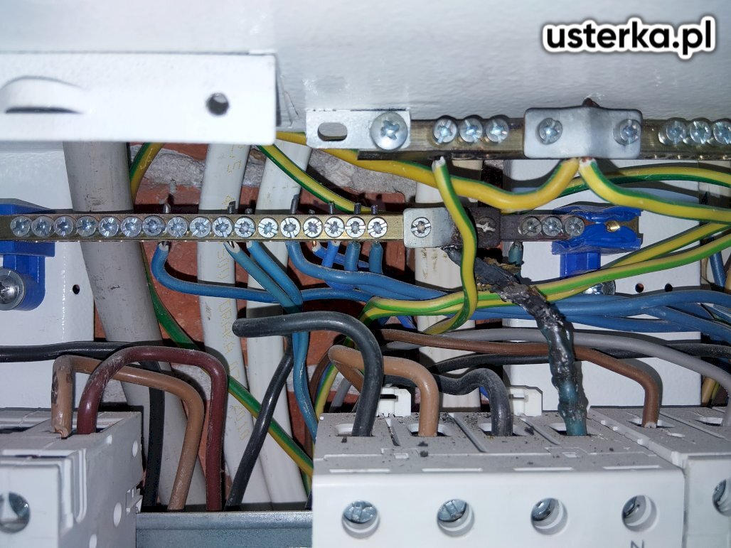 Po otwarciu rozdzielnicy stwierdzono uszkodzenie termiczne przewodu neutralnego (N) spowodowane poluzowanym zaciskiem śrubowym. Wymieniono uszkodzony odcinek przewodu oraz dokręcono wszystkie zaciski w rozdzielnicy, aby wyeliminować dalsze ryzyko przegrzewania instalacji.