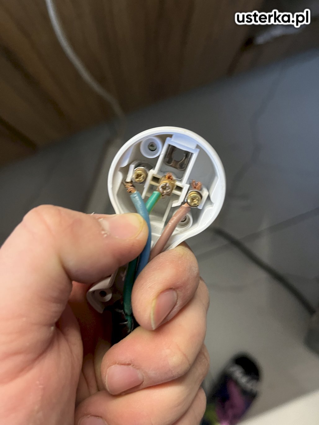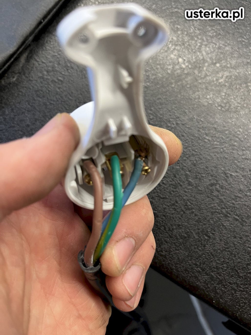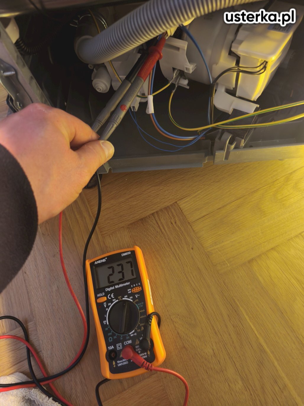 Brak uziemienia w gniazdku – wykonano zerowanie. Przewód PE nie był podłączony do uziemienia budynku. Po wykonaniu prac zmywarka działa prawidłowo, nie występuje napięcie na obudowie.