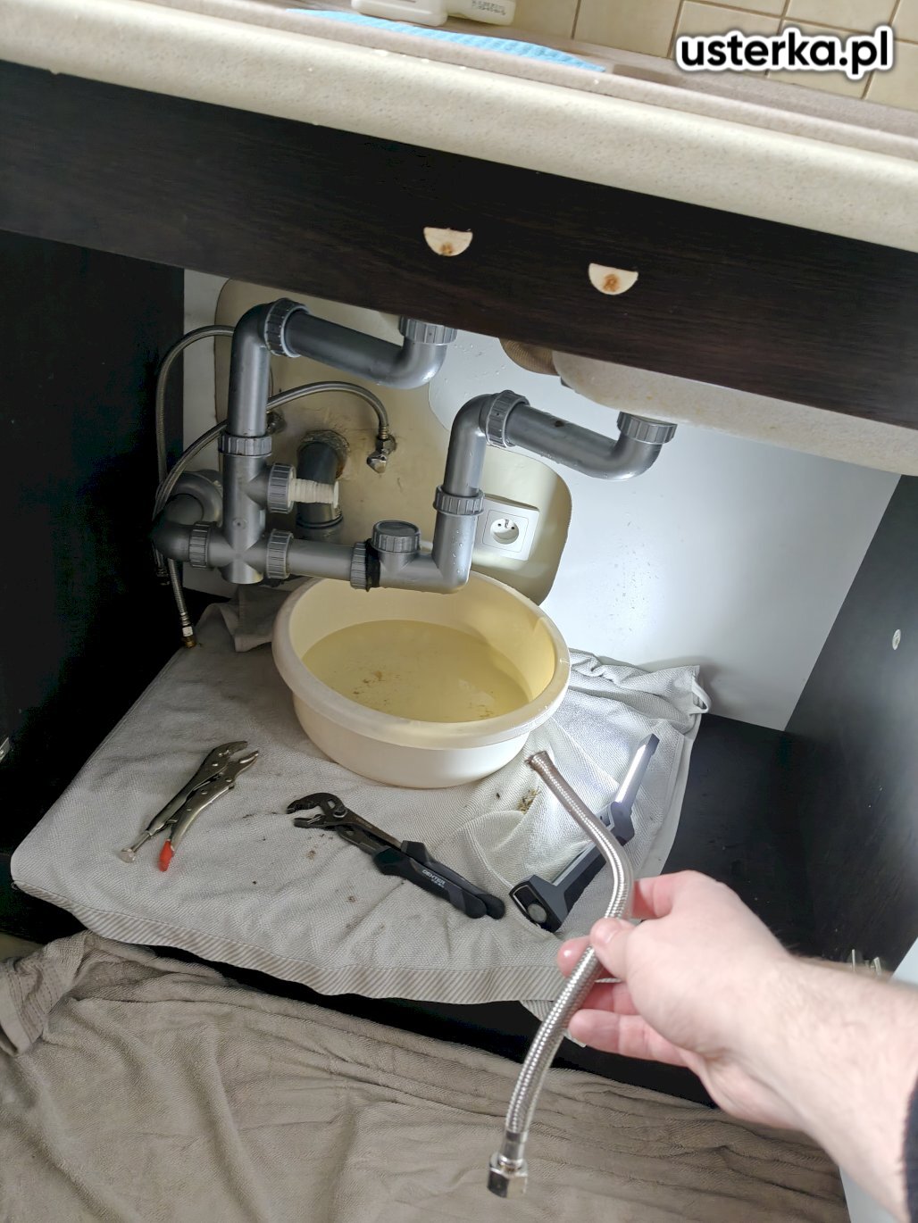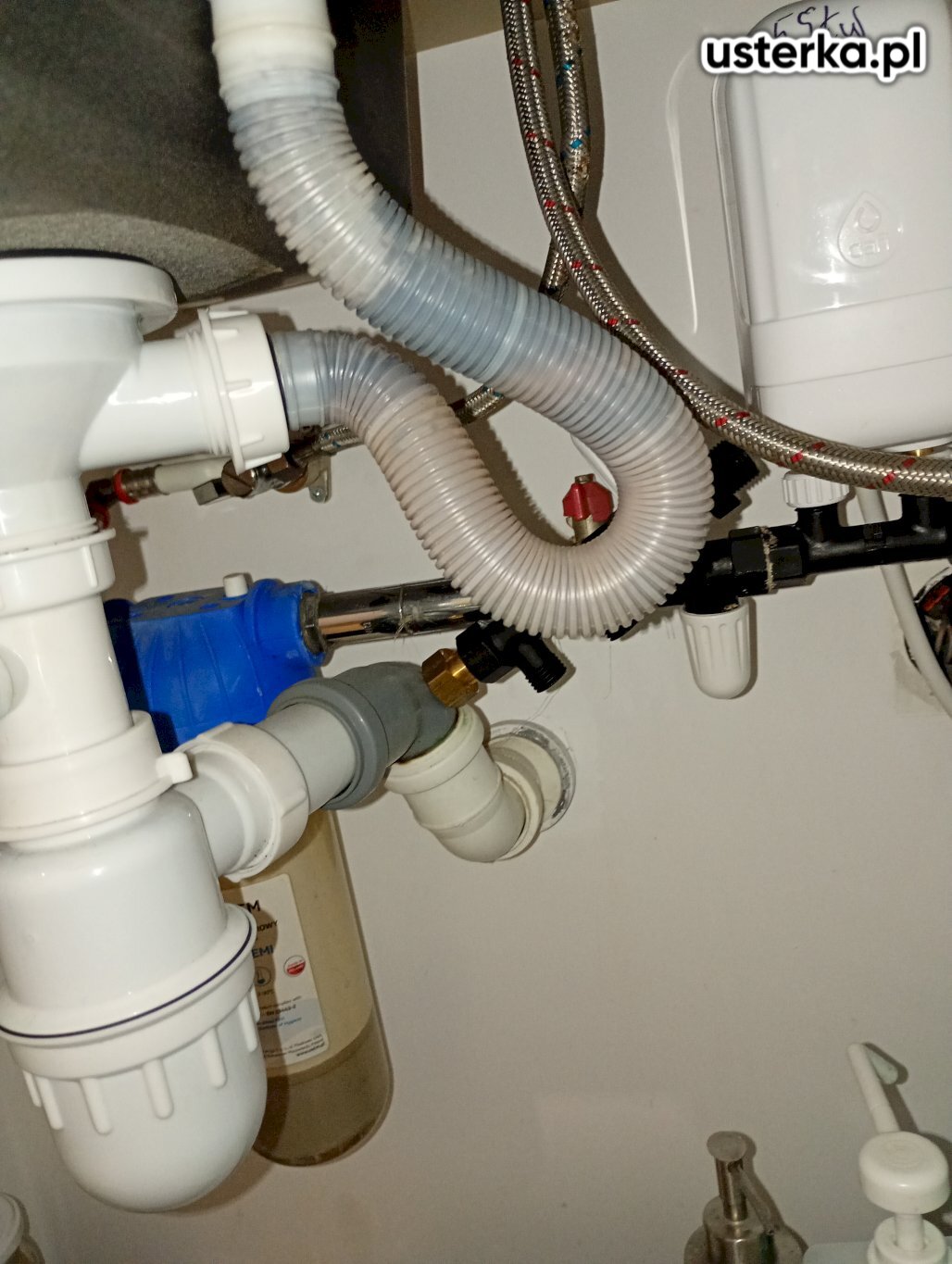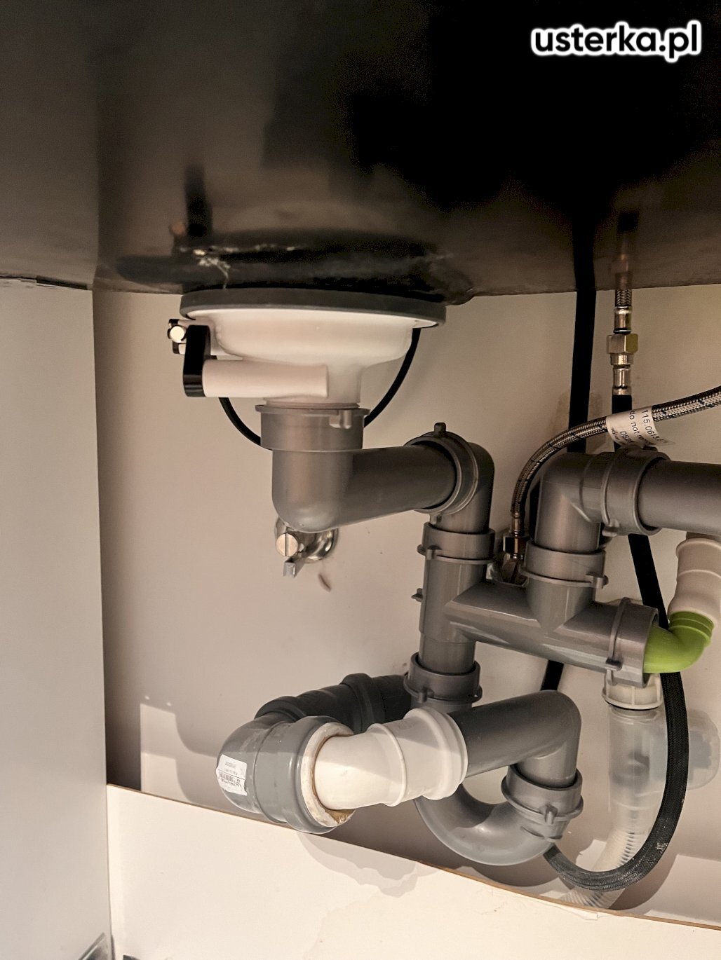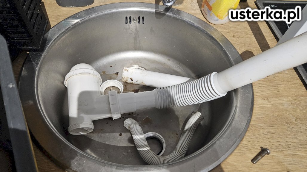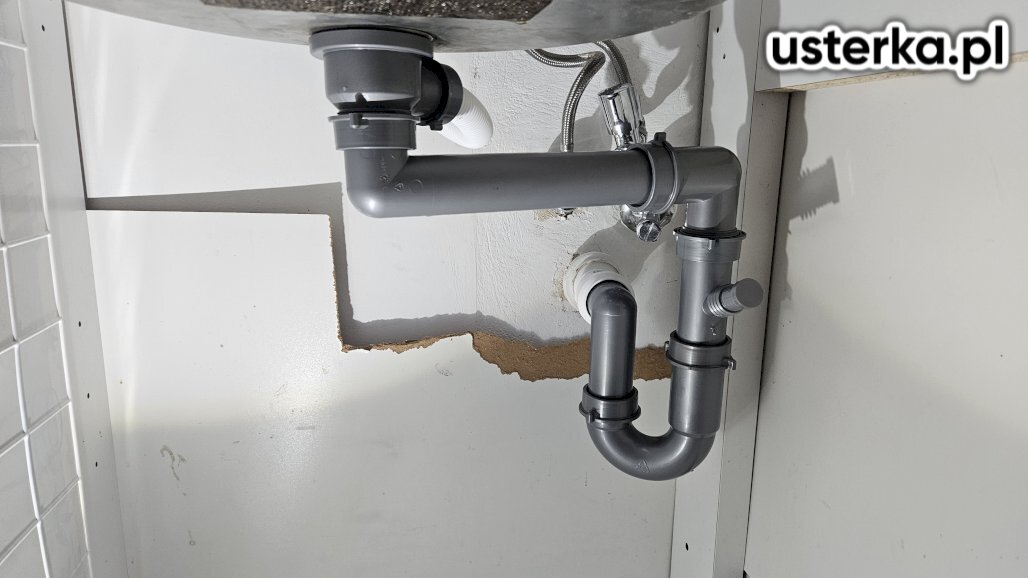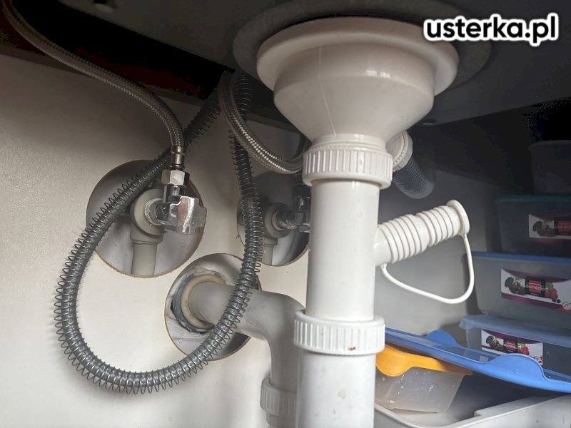 Sprawdzono instalację kanalizacyjną w kuchni, wymieniono syfon, uszczelniono połączenia zaworów baterii oraz zamontowano nowy zawór do zmywarki.