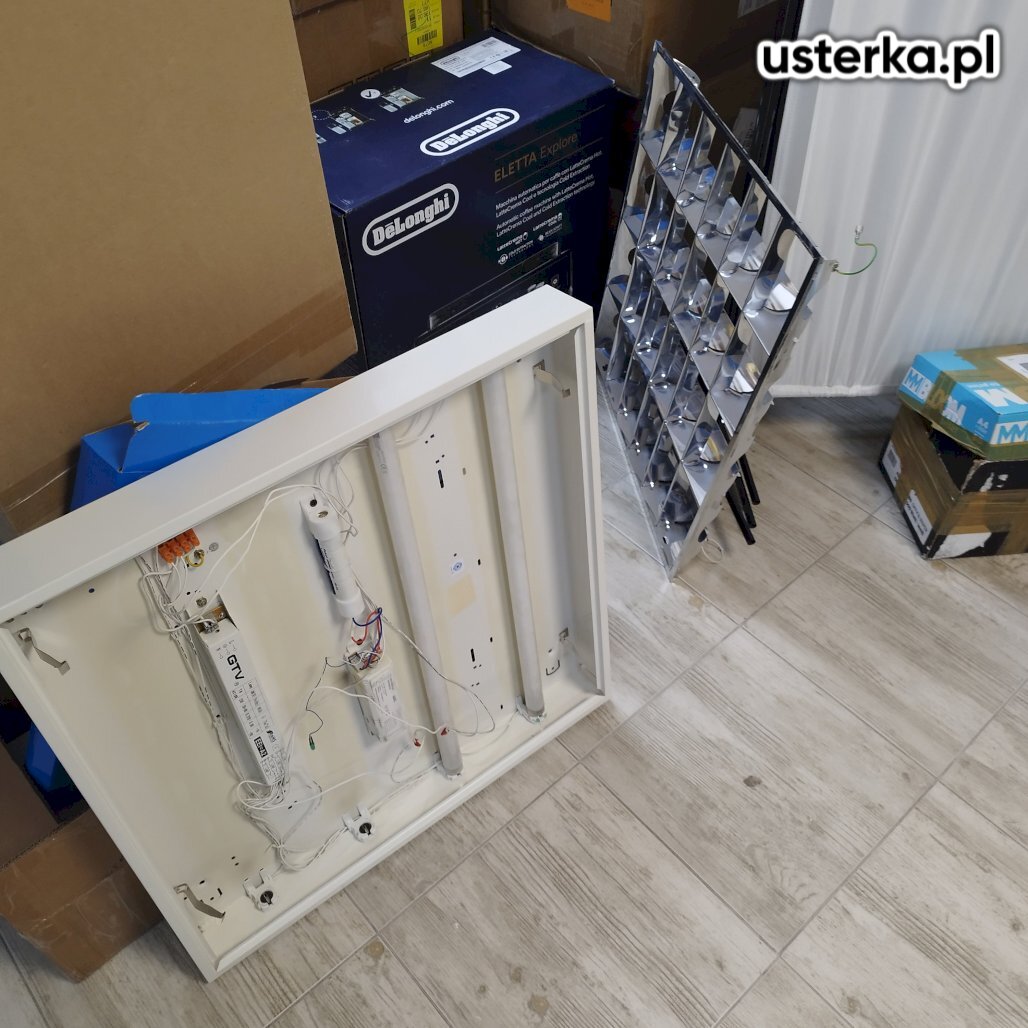 Zgłoszenie dotyczyło awarii oświetlenia w biurze. Po sprawdzeniu instalacji ustalono, że przyczyną problemu były uszkodzone zasilacze w czterech lampach rastrowych. W ramach naprawy wymieniono te oprawy na nowe panele LED, co przywróciło prawidłowe działanie oświetlenia.