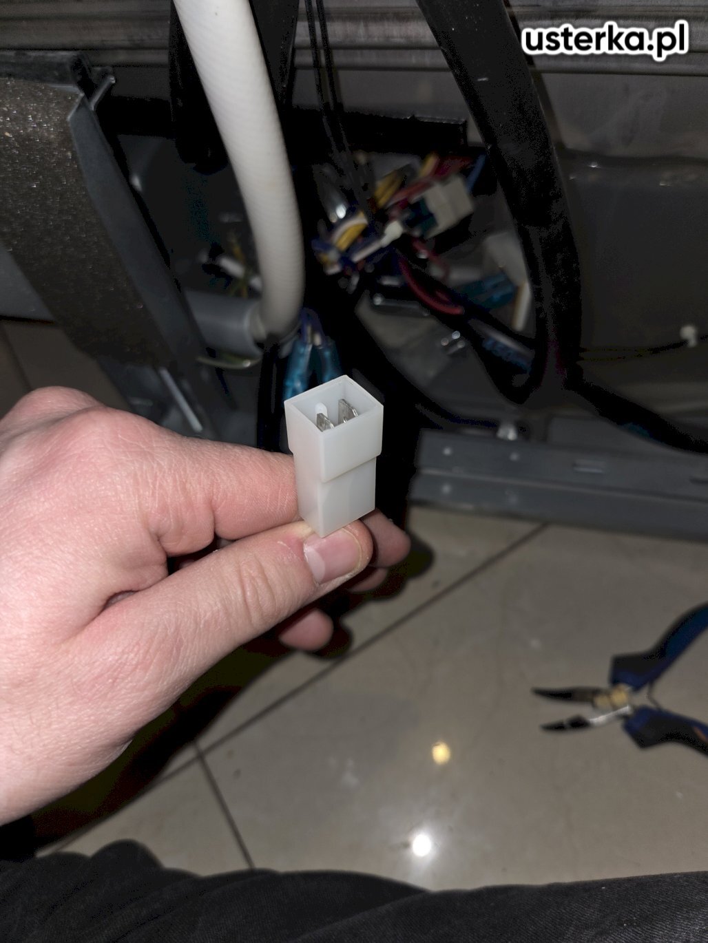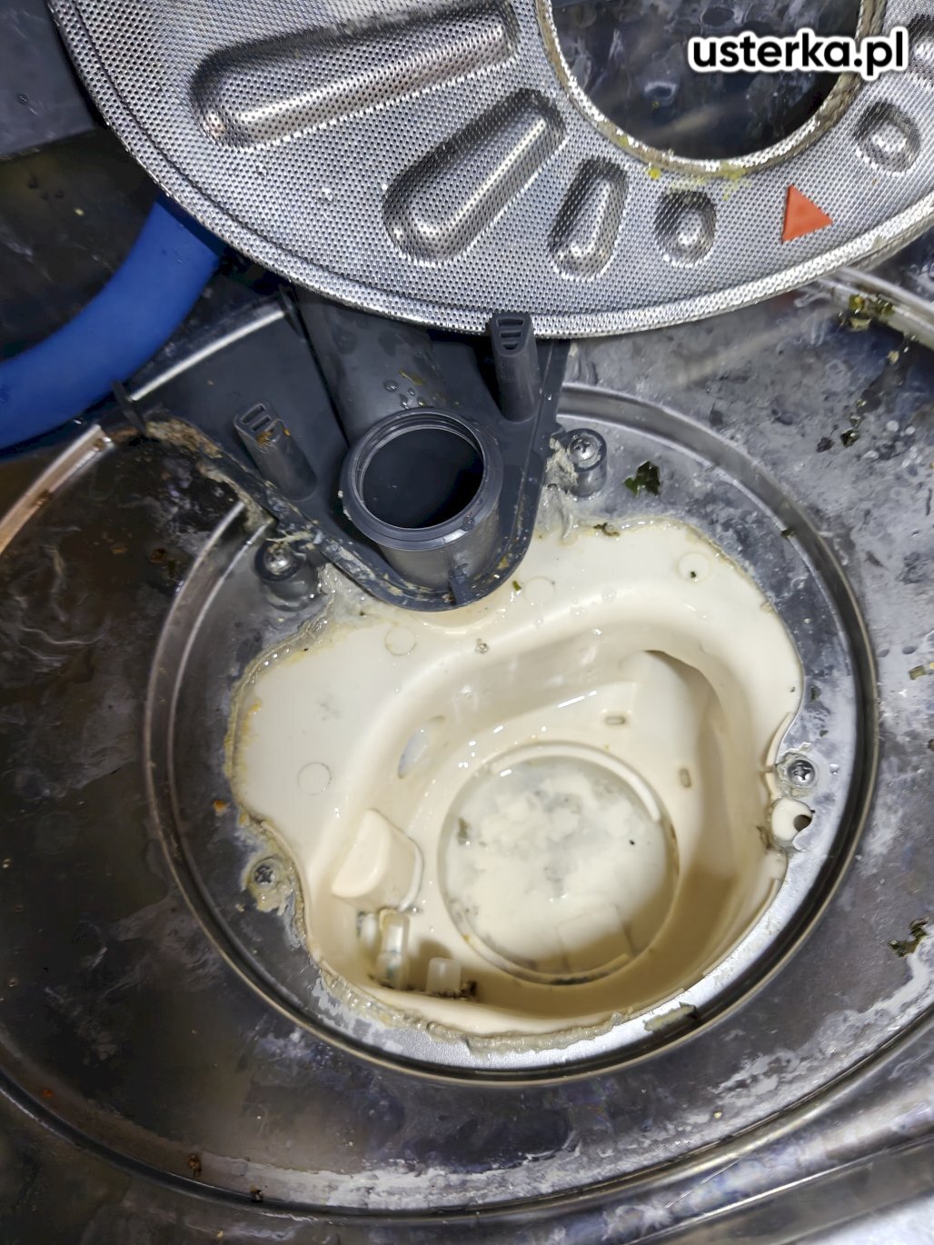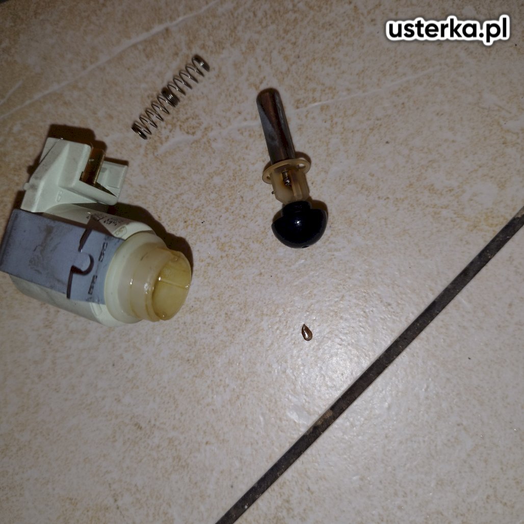 Zablokowana pompa odpływowa przez kawałek plastiku – odblokowano pompę i wymieniono obejmę.