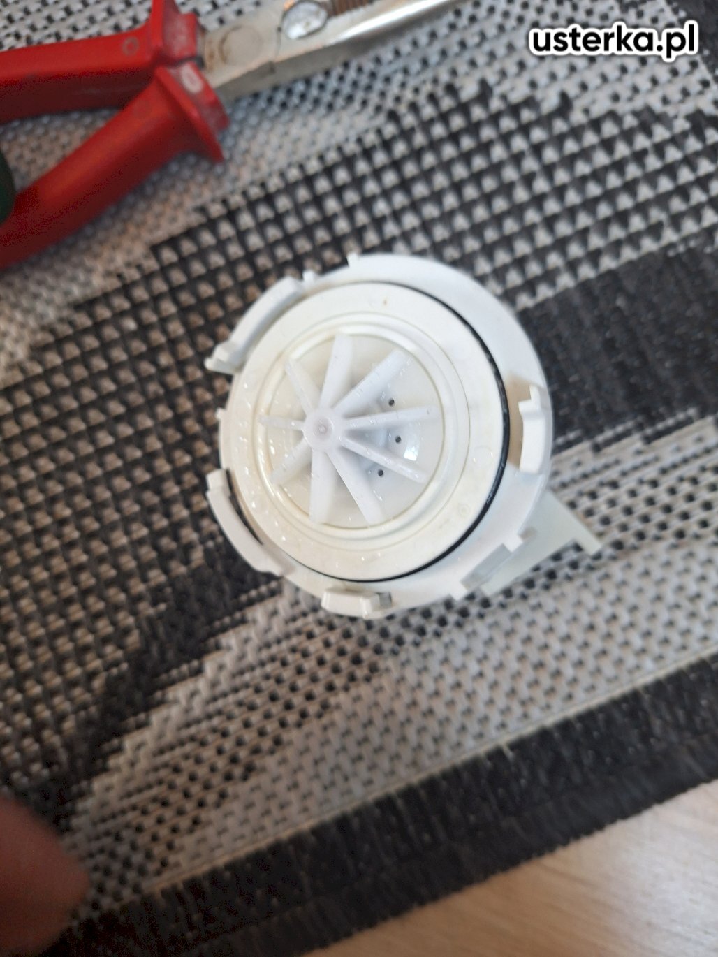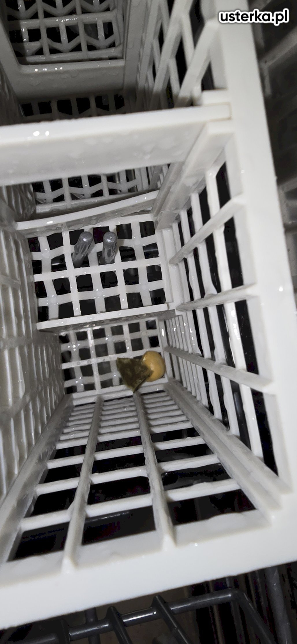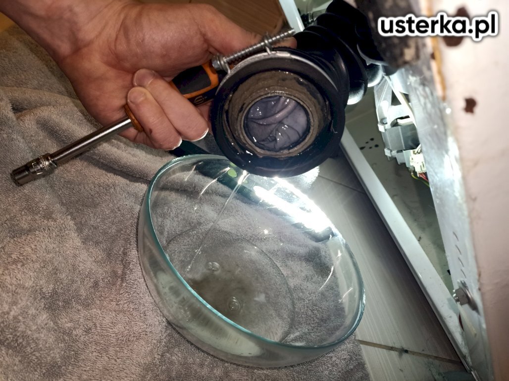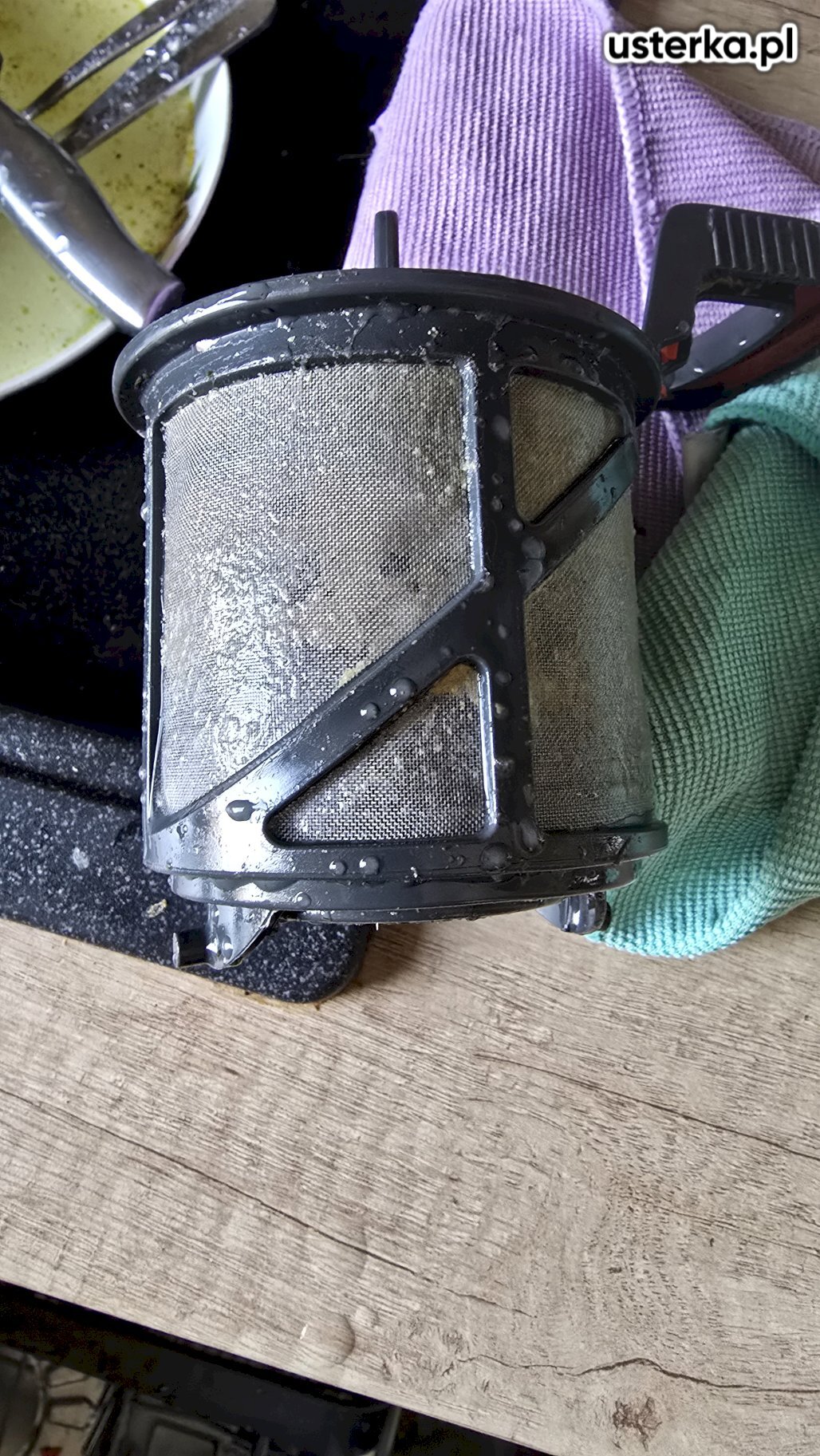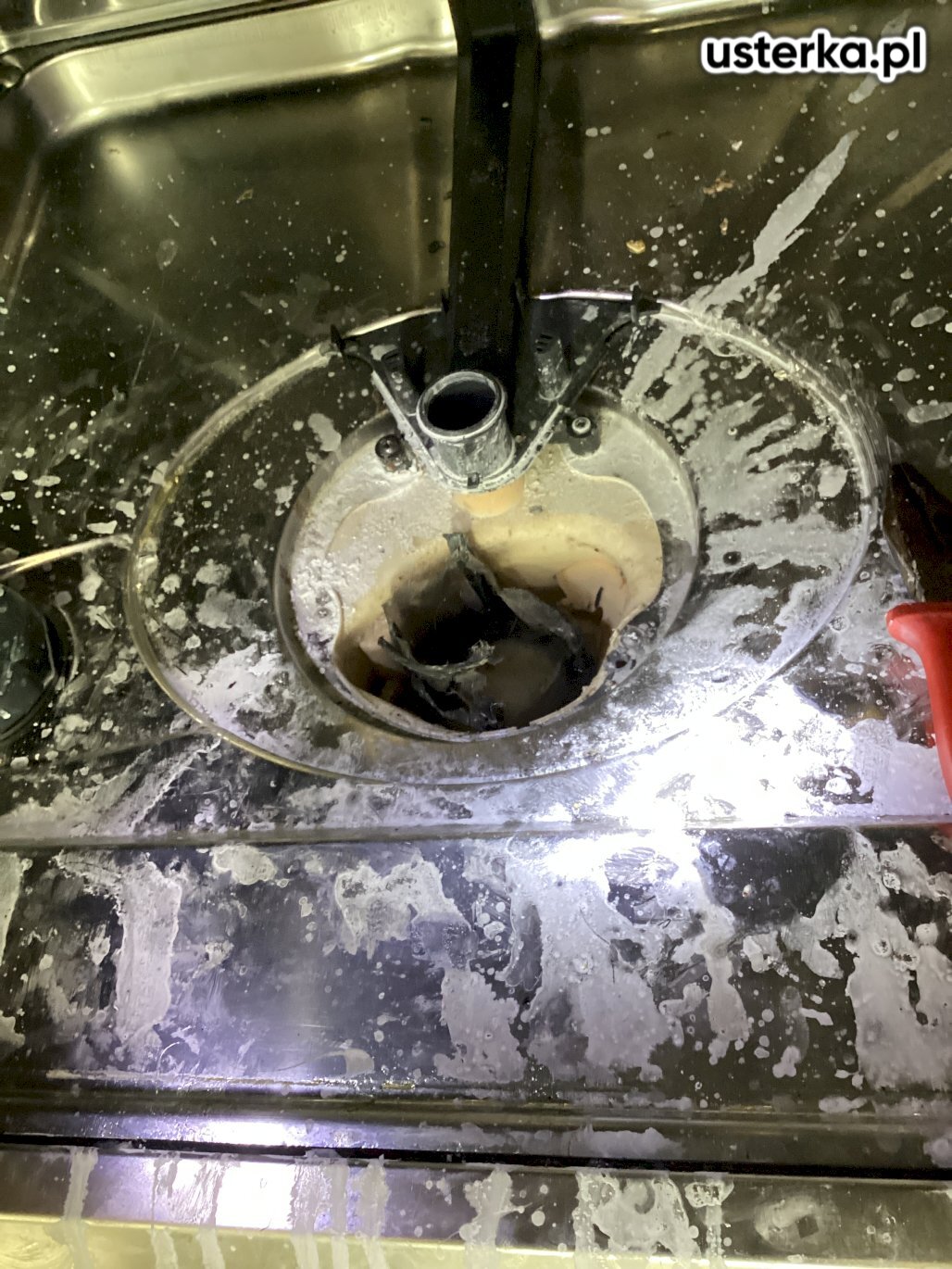 W zmywarce znajdowała się woda na tacy. Wykonano czyszczenie uszczelek drzwi, śmigieł oraz usunięto pestki i kawałek szkła z pompy myjącej. Po udrożnieniu urządzenie działa prawidłowo. Pompa myjąca wykazuje już pewne zużycie łożysk ślizgowych, ale pracuje poprawnie i nie generuje niepokojących dźwięków. Dolna uszczelka drzwi była mocno zabrudzona i może być częściowo odkształcona.