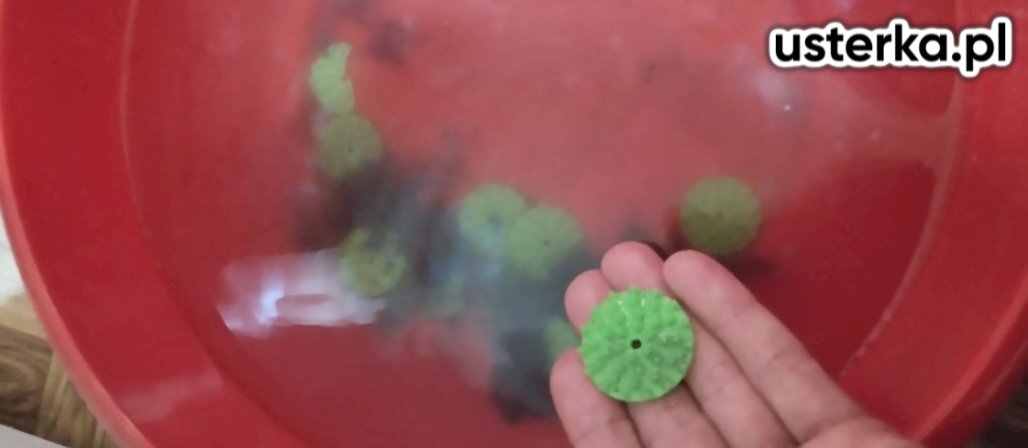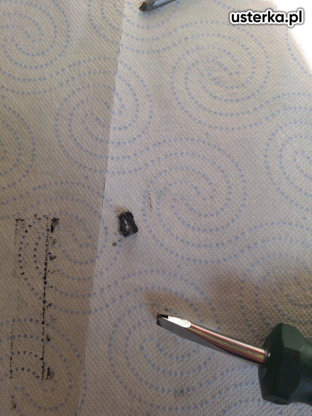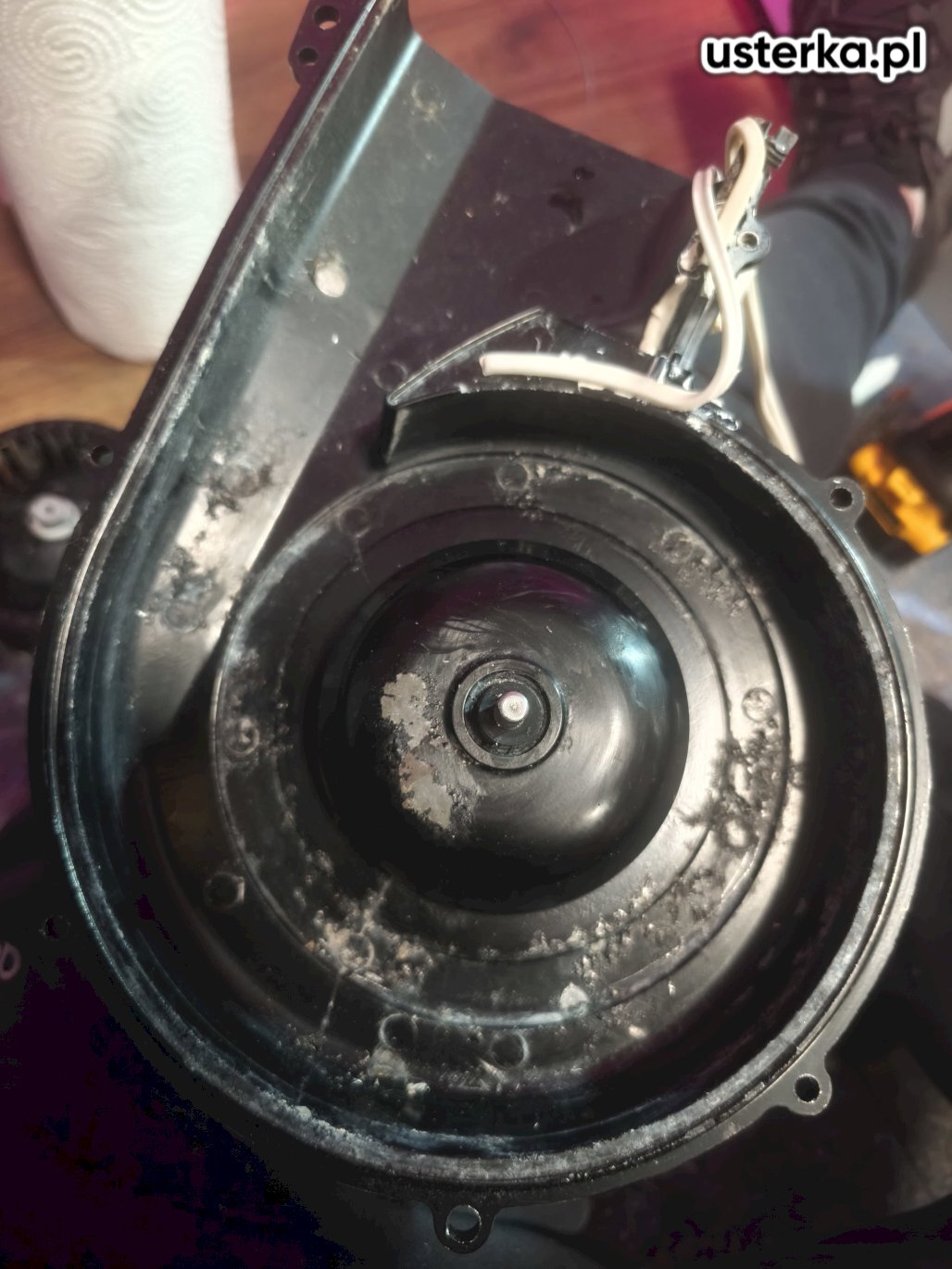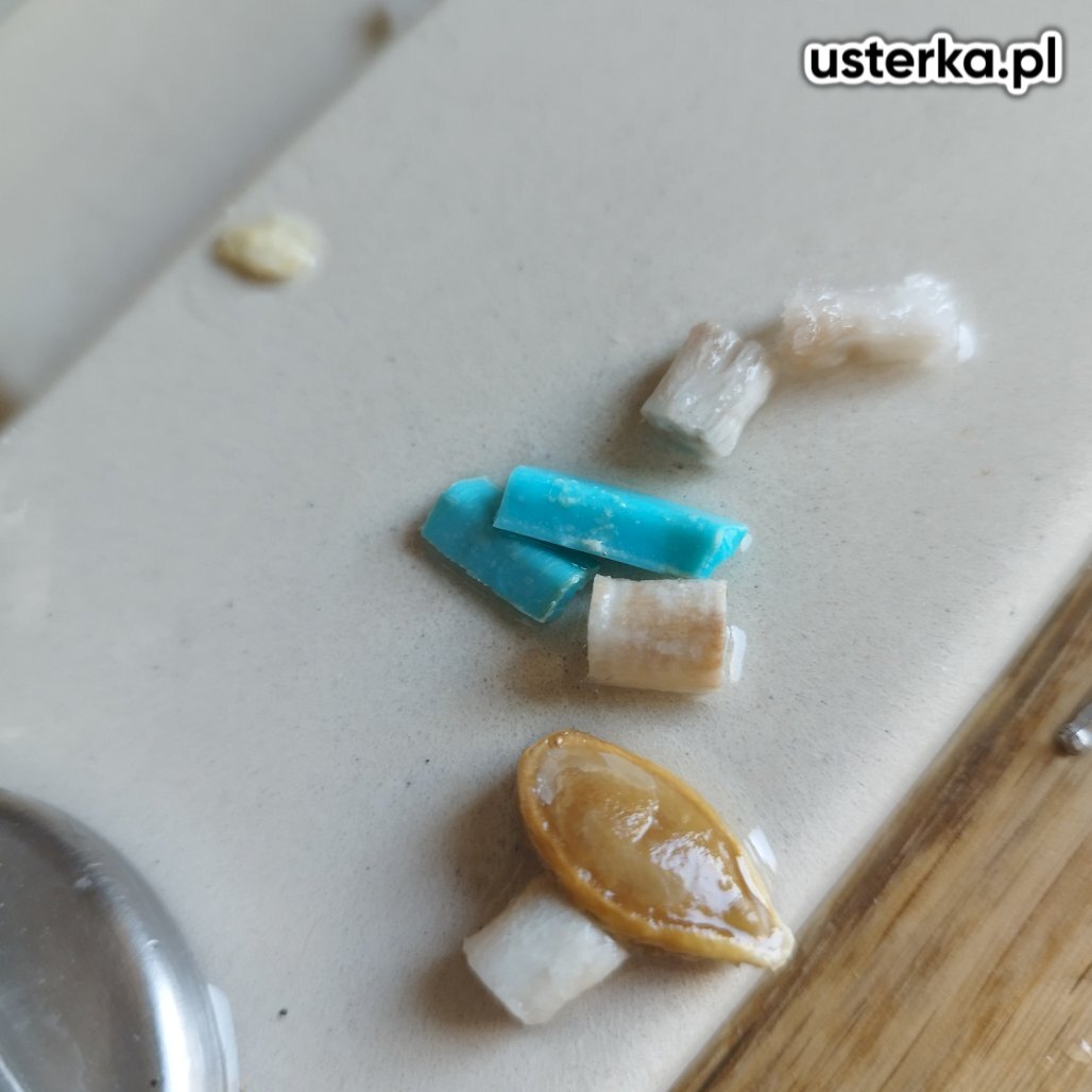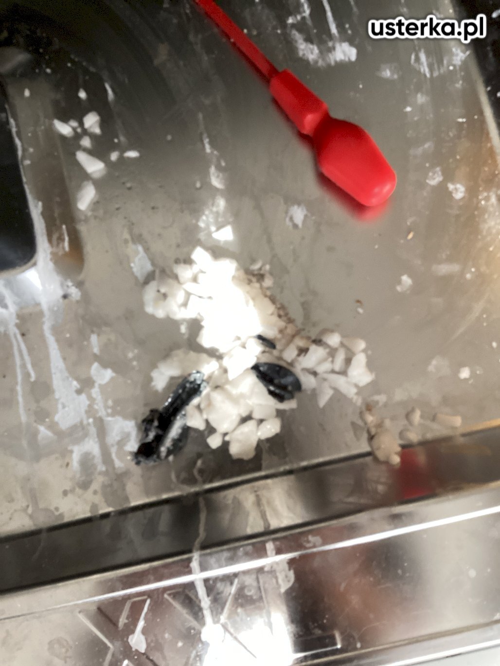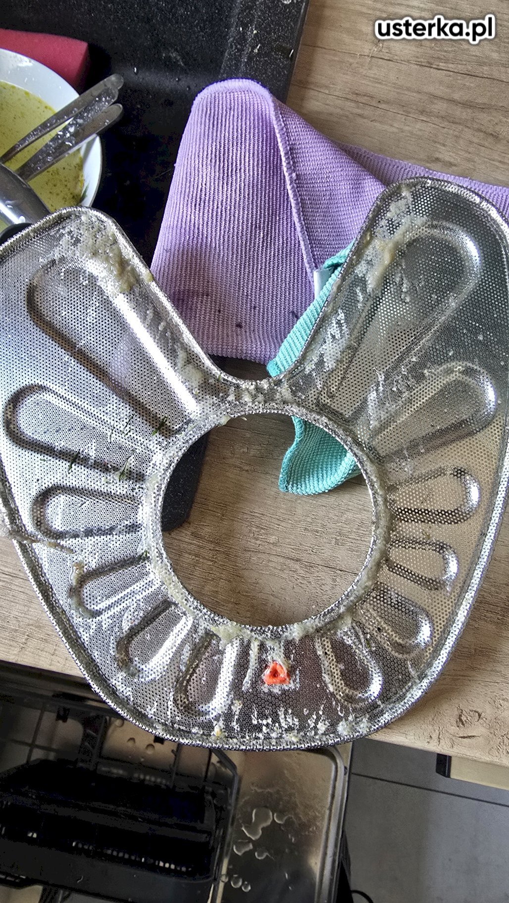 W zmywarce znajdowała się woda na tacy. Wykonano czyszczenie uszczelek drzwi, śmigieł oraz usunięto pestki i kawałek szkła z pompy myjącej. Po udrożnieniu urządzenie działa prawidłowo. Pompa myjąca wykazuje już pewne zużycie łożysk ślizgowych, ale pracuje poprawnie i nie generuje niepokojących dźwięków. Dolna uszczelka drzwi była mocno zabrudzona i może być częściowo odkształcona.