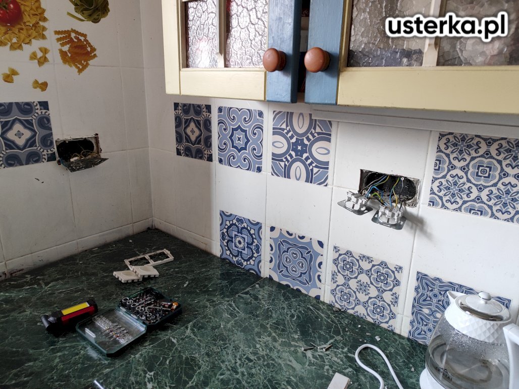 Zlokalizowano przyczynę braku prądu w gniazdkach kuchennych. Zalecana jest wymiana uszkodzonego fragmentu instalacji poprzez poprowadzenie nowych przewodów.