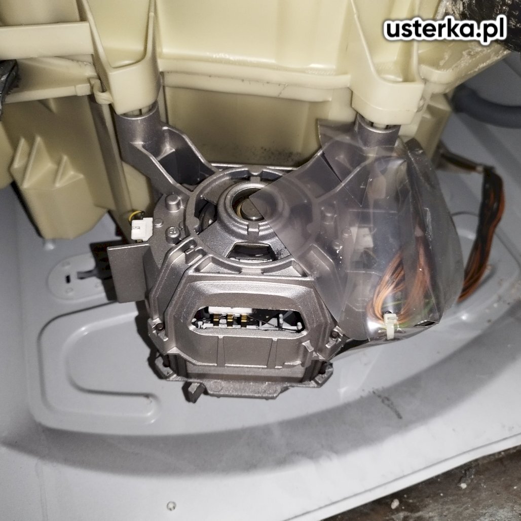 Stwierdzono uszkodzenie łożyska oraz jego wyrwanie z mocowania. Bęben wydaje zgrzytające dźwięki podczas obracania, a łożysko jest nieszczelne.