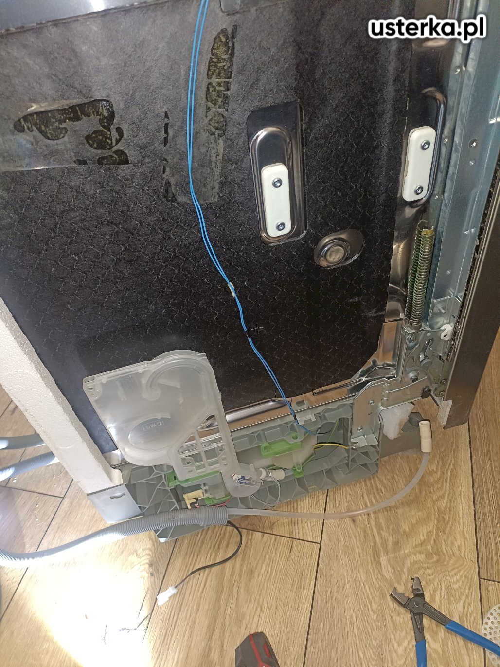 Zmywarka Bosch, 25-letnia, po uszkodzeniu przewodów przez gryzonie. Przewody naprawiono, urządzenie działa prawidłowo – pobiera wodę, myje i grzeje.