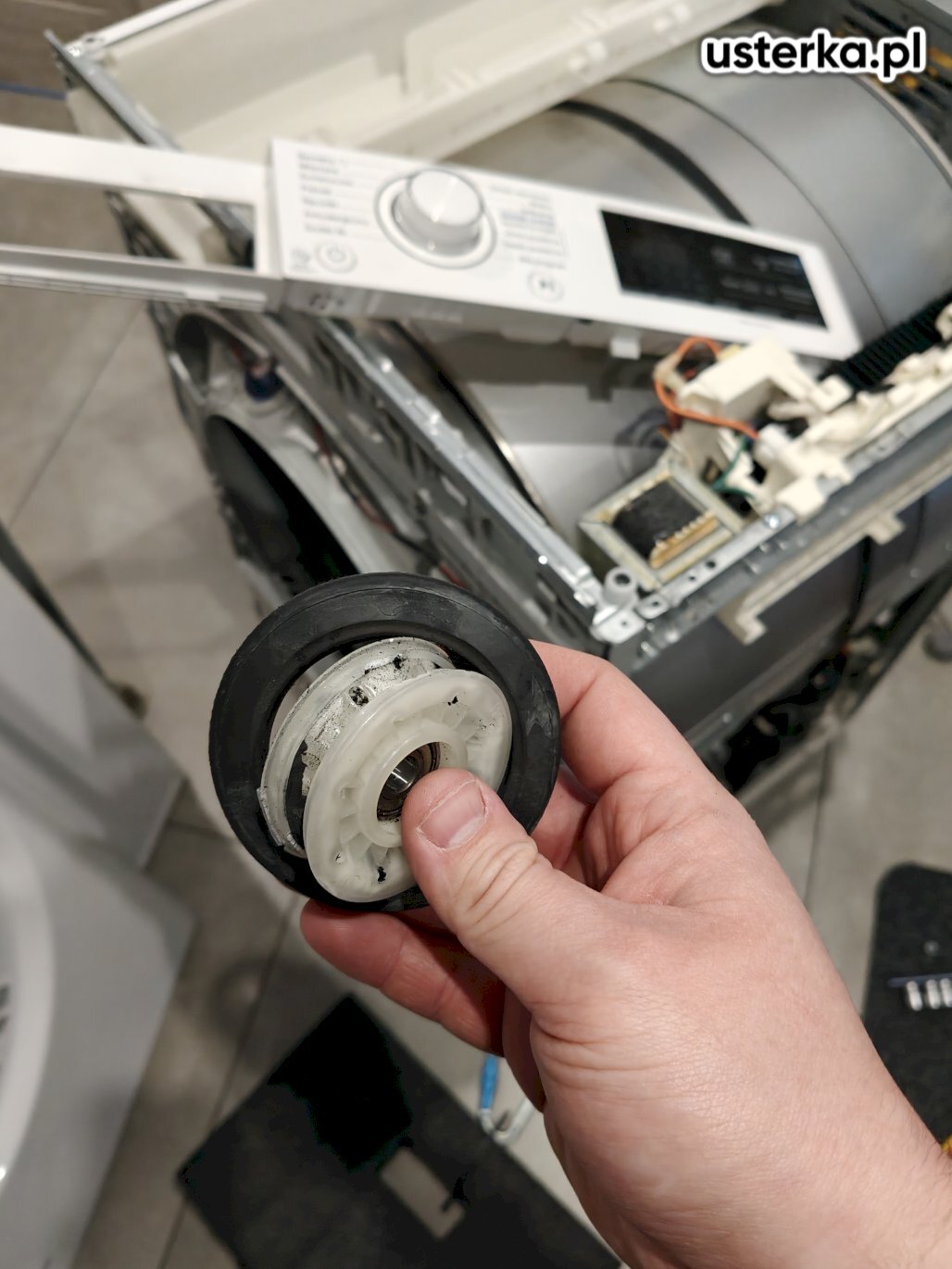 Przeprowadzono diagnostykę suszarki – urządzenie brudziło ubrania i bęben obracał się z oporem. Po demontażu osłon stwierdzono uszkodzenie rolki bębna.