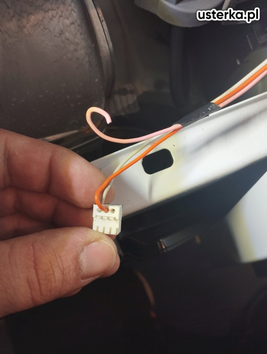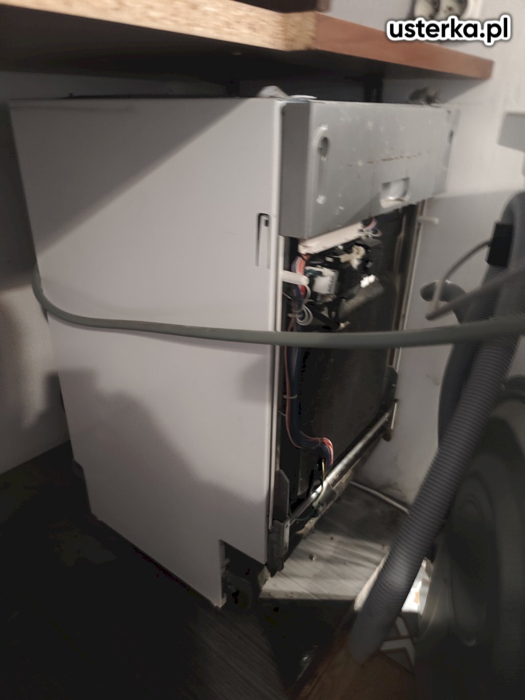 Zdiagnozowano zmywarkę – grzałka i hydrostat są sprawne. Podczas demontażu obudowy drzwiczek jedna kostka była luźno podłączona do modułu sterującego; po jej poprawnym wpięciu urządzenie zaczęło podgrzewać wodę. Dodatkowo stwierdzono uszkodzenia węża połączeniowego i odpływowego.