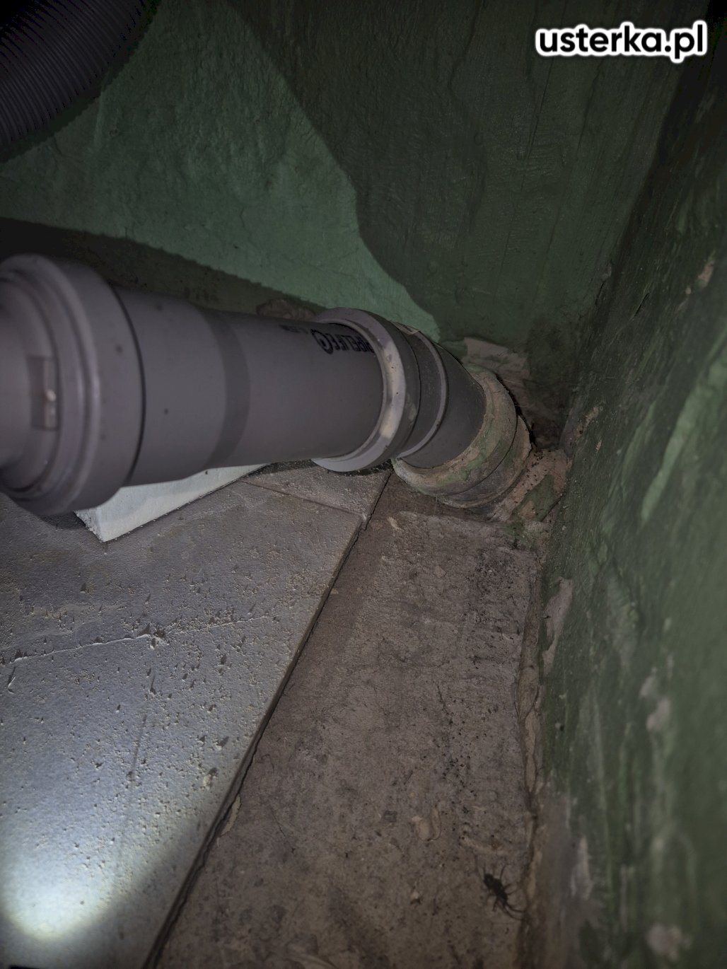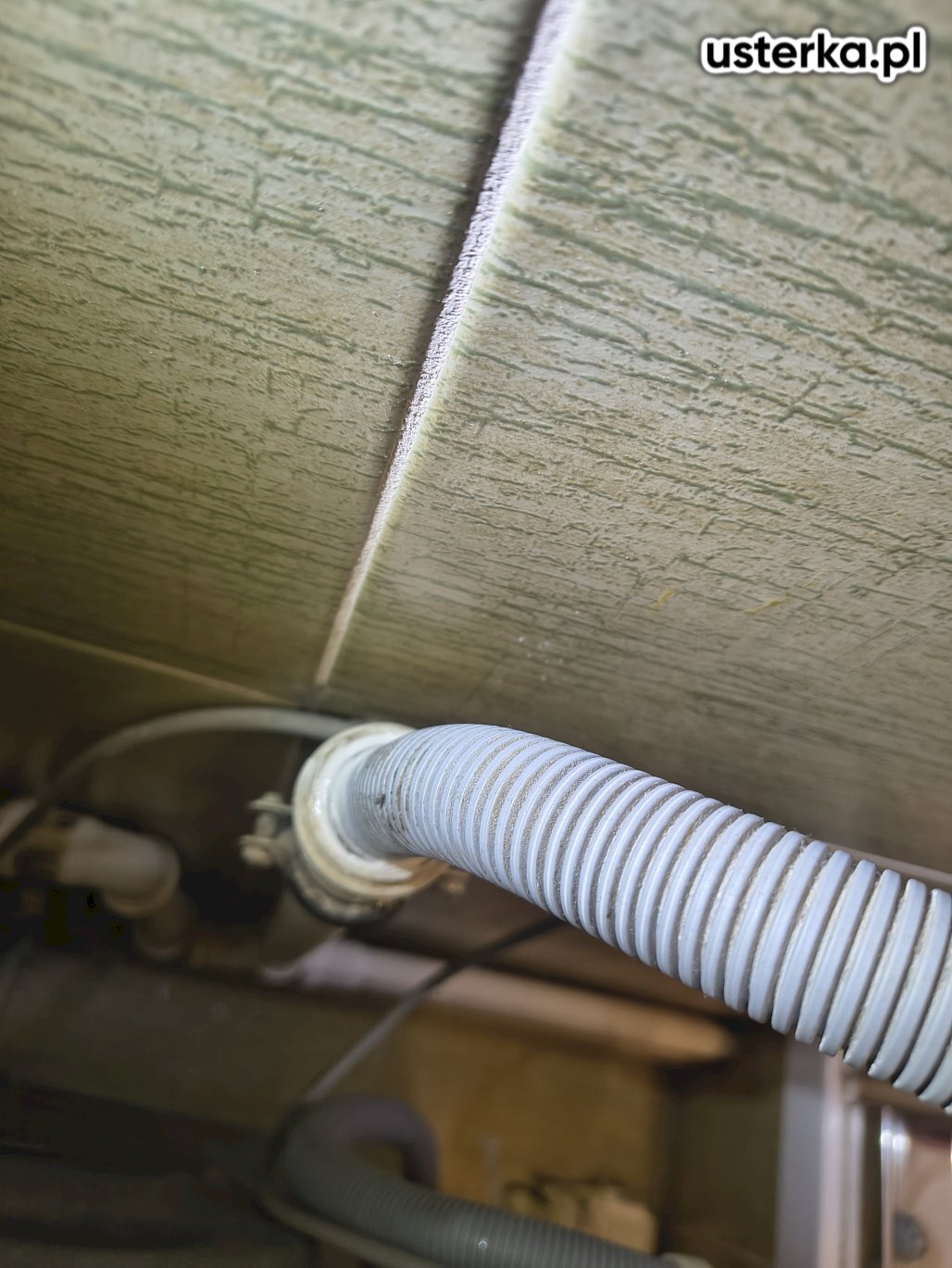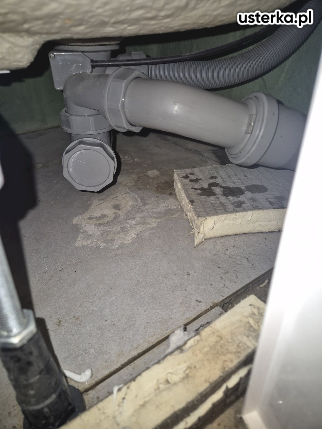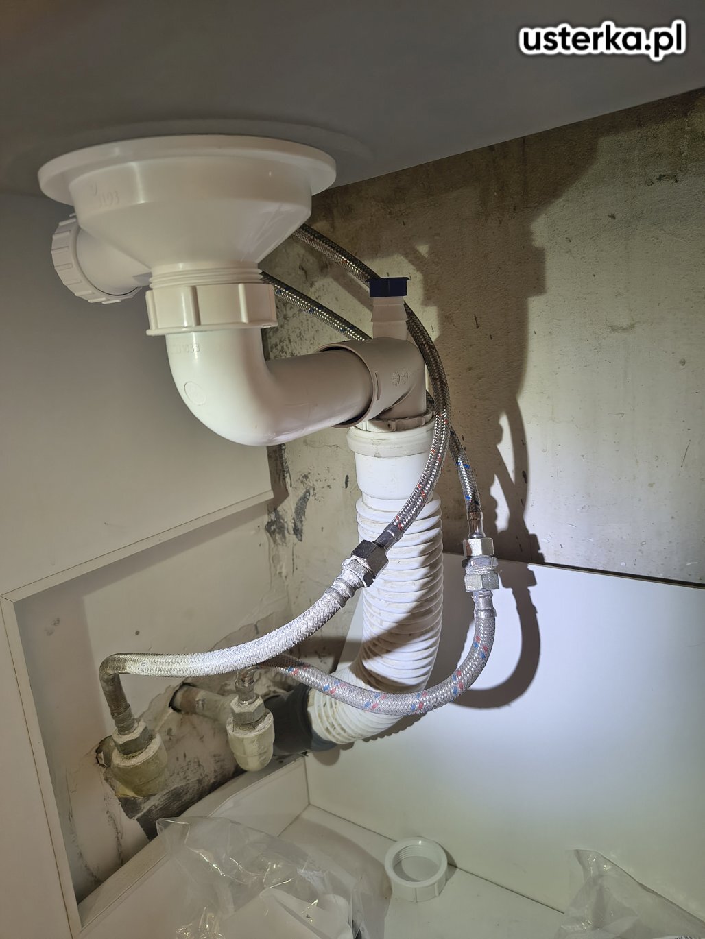 Naprawiono instalację kanalizacyjną – starą rurę harmonijkową zastąpiono sztywną rurą kanalizacyjną o średnicy 50 mm.