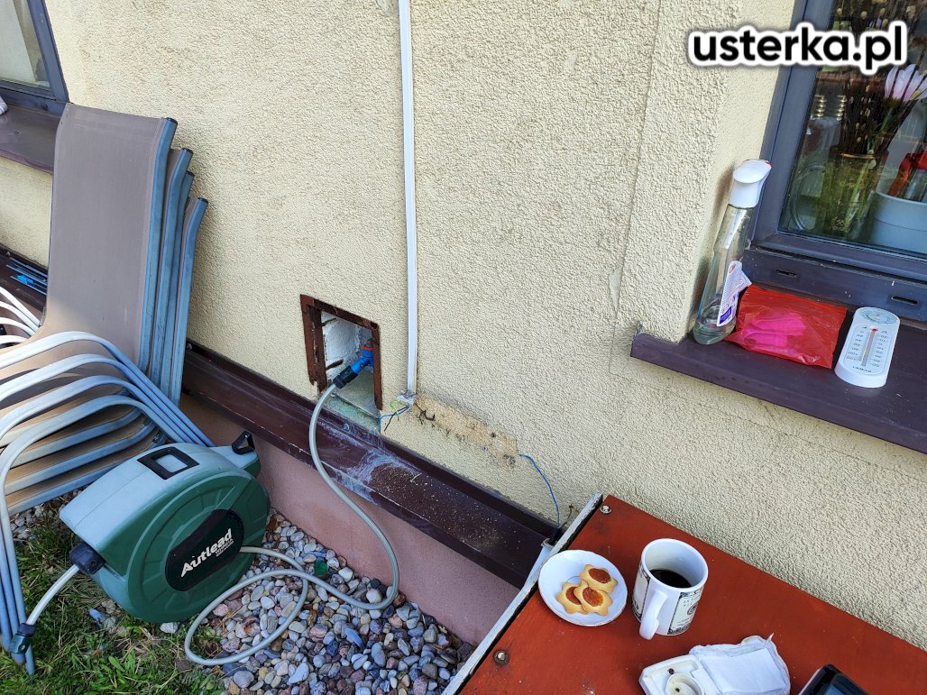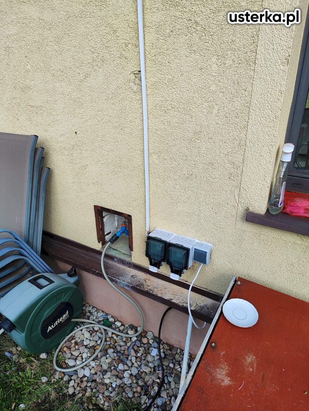 Wykonano naprawę instalacji elektrycznej zasilającej zewnętrzne gniazda i roletę. Wymieniono gniazda oraz wyłącznik oświetlenia na modele IP67 dostarczone przez klienta.