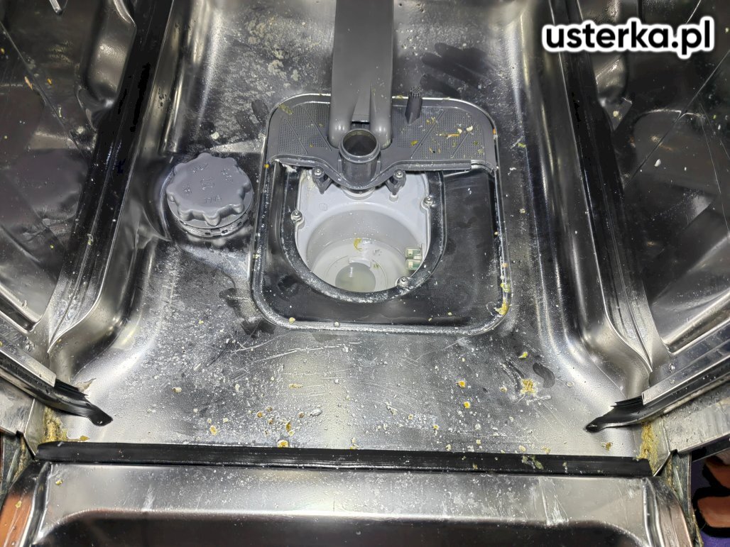 Usunięto zalegającą wodę z komory, wyczyszczono filtr, pompę odpływową oraz śmigła myjące (dysze były zatkane pestkami cytryny). Oczyszczono uszczelki drzwi. Sprawdzono szczelność urządzenia – brak wycieków. Skontrolowano czujnik pływakowy, drożność węża odpływowego i syfonu oraz sitko na wężu dopływowym. Zmywarka przeszła program testowy bez zarzutów. Klientka otrzymała wskazówki dotyczące prawidłowej eksploatacji sprzętu.