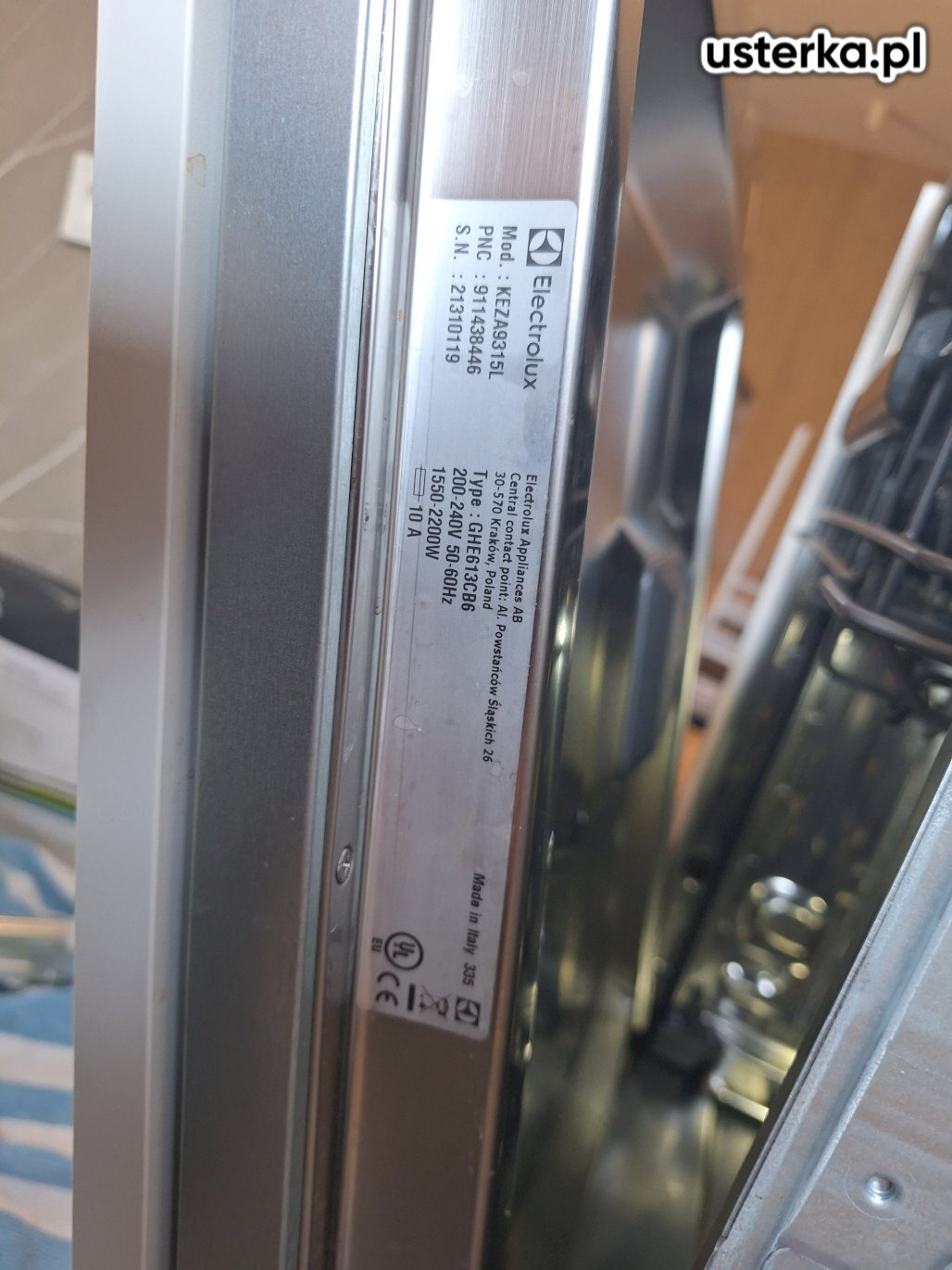 W zmywarce Electrolux stwierdzono zużycie i pęknięcie dolnej uszczelki drzwi oraz wykrzywienie blachy wewnętrznej. Fronty i blat zostały niewłaściwie zabezpieczone, co doprowadziło do ich rozwarstwienia. Konieczna jest wymiana uszczelek oraz zalecana wymiana blachy wewnętrznej.