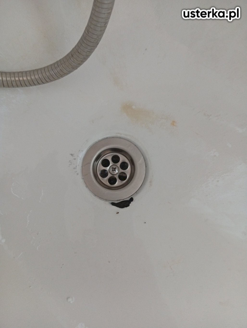 Po oględzinach stwierdziłem odklejenie silikonu na połączeniu brodzika ze ścianą oraz wykrzywienie odpływu. Uszczelniłem oba miejsca silikonem. Zaleciłem wymianę odpływu, jednak klientka zdecydowała się na tymczasowe uszczelnienie. Poinformowałem o konieczności nieużywania wody do czasu wyschnięcia silikonu i dalszej obserwacji ewentualnych wycieków.