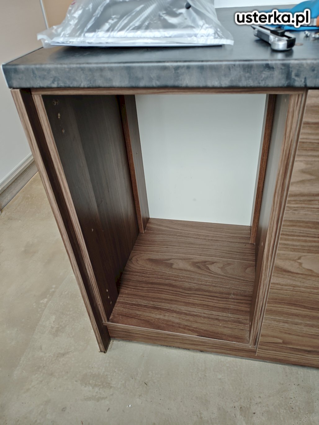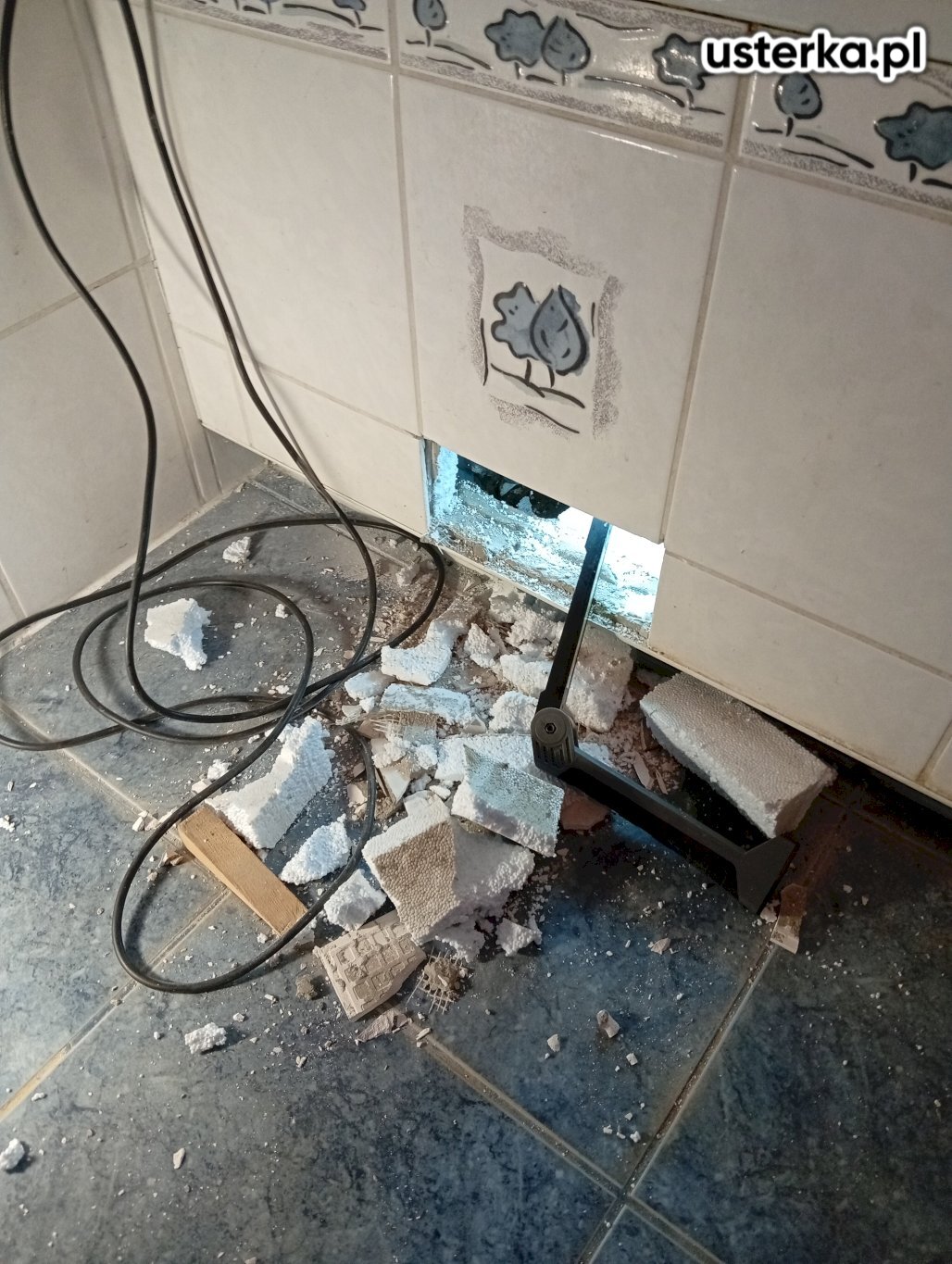 Po przyjeździe stwierdzono wyciek wody spod pralki, spowodowany uszkodzonym i załamanym wężem zasilającym. Pralka została zabudowana blatem, co uniemożliwia łatwą wymianę węża – konieczny jest demontaż blatu łazienkowego. Dodatkowo uszkodzone są prowadnice szuflad, które wymagają wymiany. Zalecam również zabezpieczenie silikonem lub wymianę spuchniętej płyty meblowej.