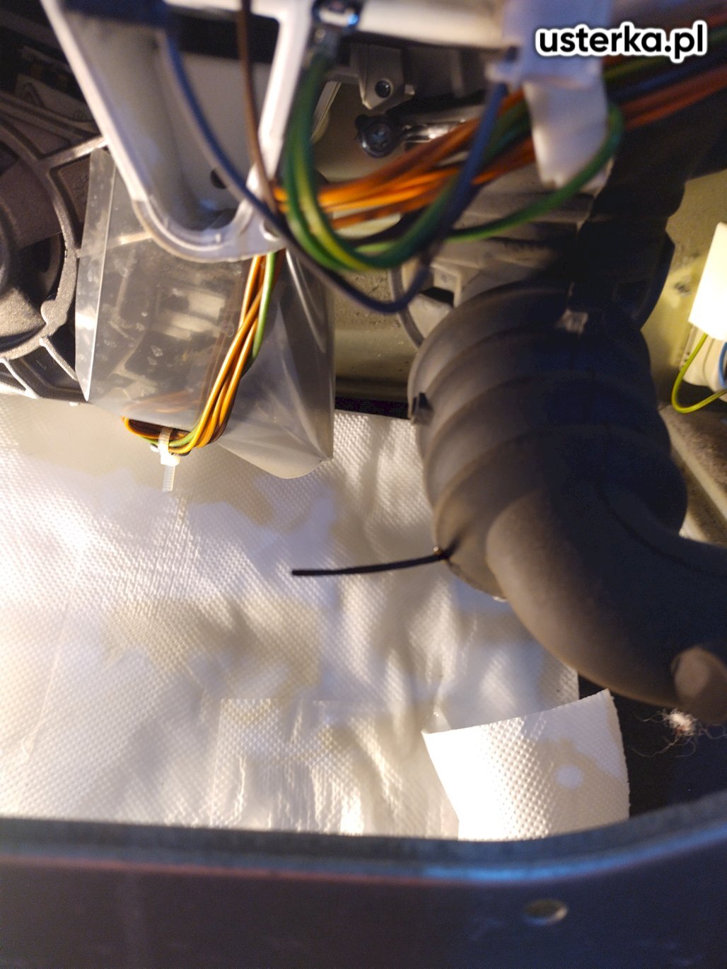 Podczas wizyty przeprowadzono diagnostykę pralki Bosch w związku z wyciekiem wody od spodu. Stwierdzono uszkodzenie węża łączącego bęben z pompą, co powoduje nieszczelność i uniemożliwia bezpieczne użytkowanie urządzenia.
