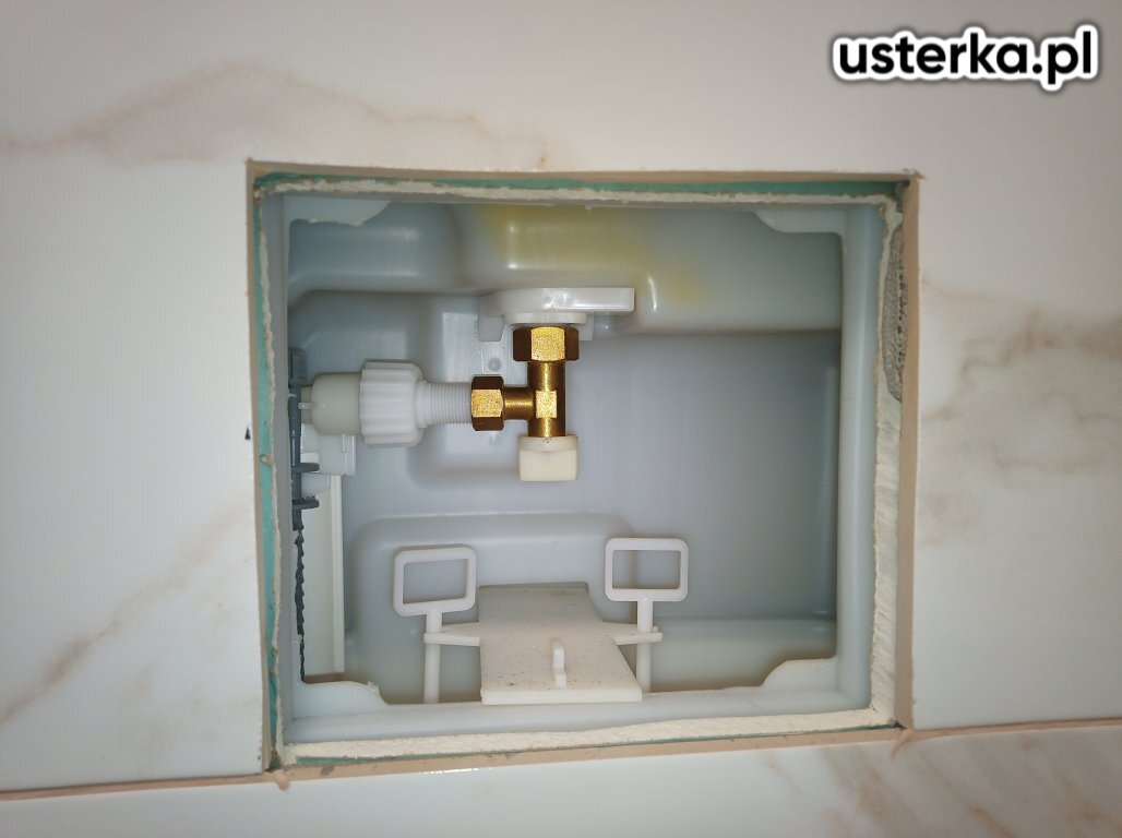 Po przeglądzie spłuczki podtynkowej stwierdziłem konieczność jej wymiany. Tymczasowo zamontowałem uniwersalny zawór, aby zapewnić prawidłowe działanie instalacji.