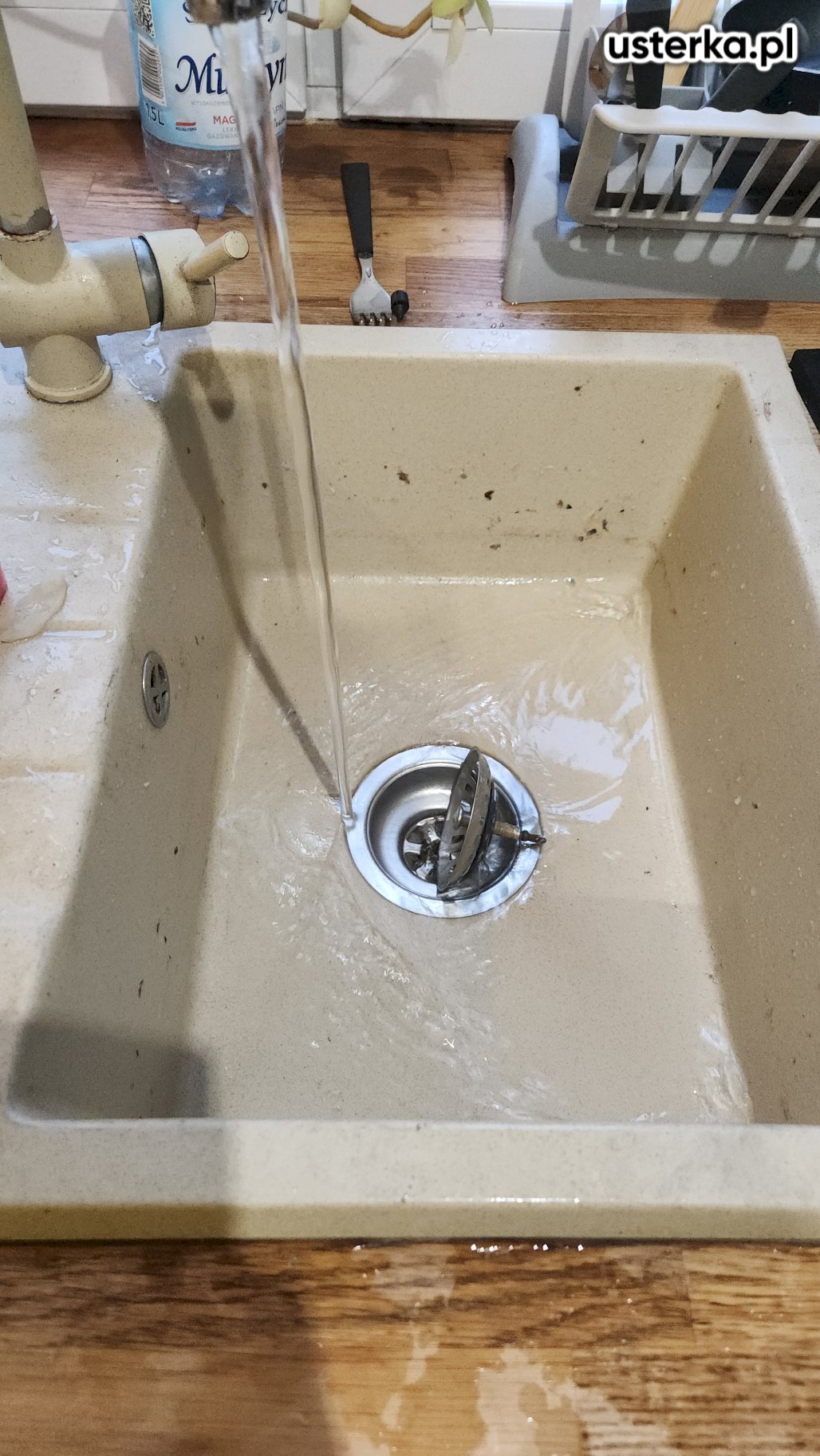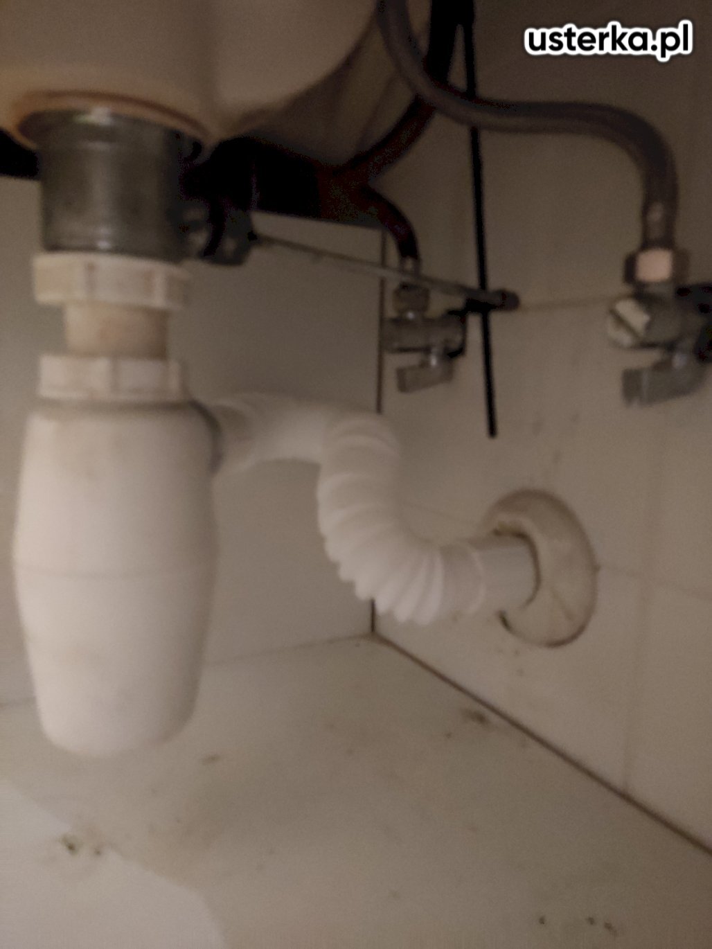 Stwierdzono nieszczelność syfonu spowodowaną zatkaniem kanalizacji. Wymieniono syfon na nowy i udrożniono odpływ środkiem chemicznym. Instalacja działa prawidłowo. Zaleca się regularne stosowanie preparatów bakteryjnych do kanalizacji raz w miesiącu oraz przemywanie rur gorącą wodą z płynem raz w tygodniu. Odpady spożywcze należy wyrzucać do odpadów biodegradowalnych.