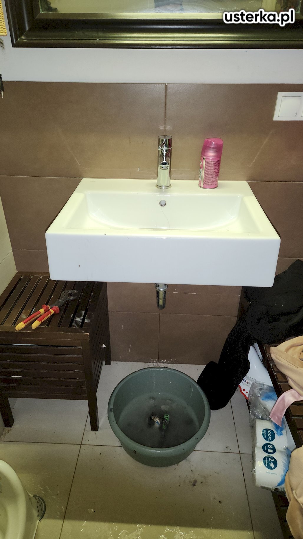 Na miejscu zdiagnozowałem wyciek z połączenia syfonu. Po rozkręceniu okazało się, że uszczelka jest odkształcona i uszkodzona. Wymieniłem ją oraz uszczelkę odpływu, a pozostałe sprawdziłem pod kątem szczelności. Po ponownym montażu i próbie szczelności wyciek nie występuje.