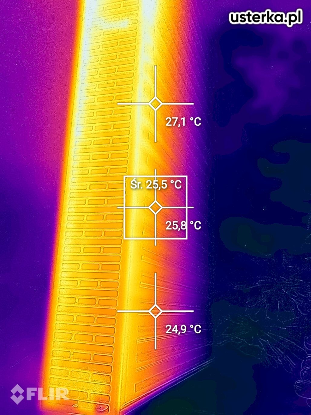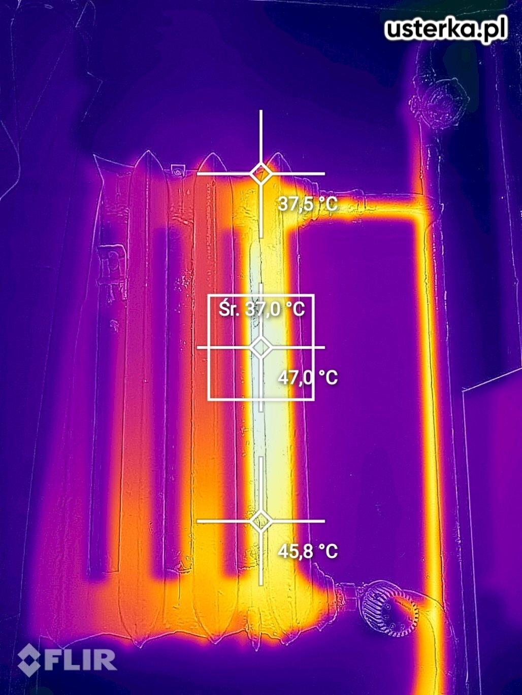 Sprawdzono działanie grzejników i zaworów termostatycznych – pracują prawidłowo, nie stwierdzono zapowietrzenia. Grzejniki nagrzewają się równomiernie.