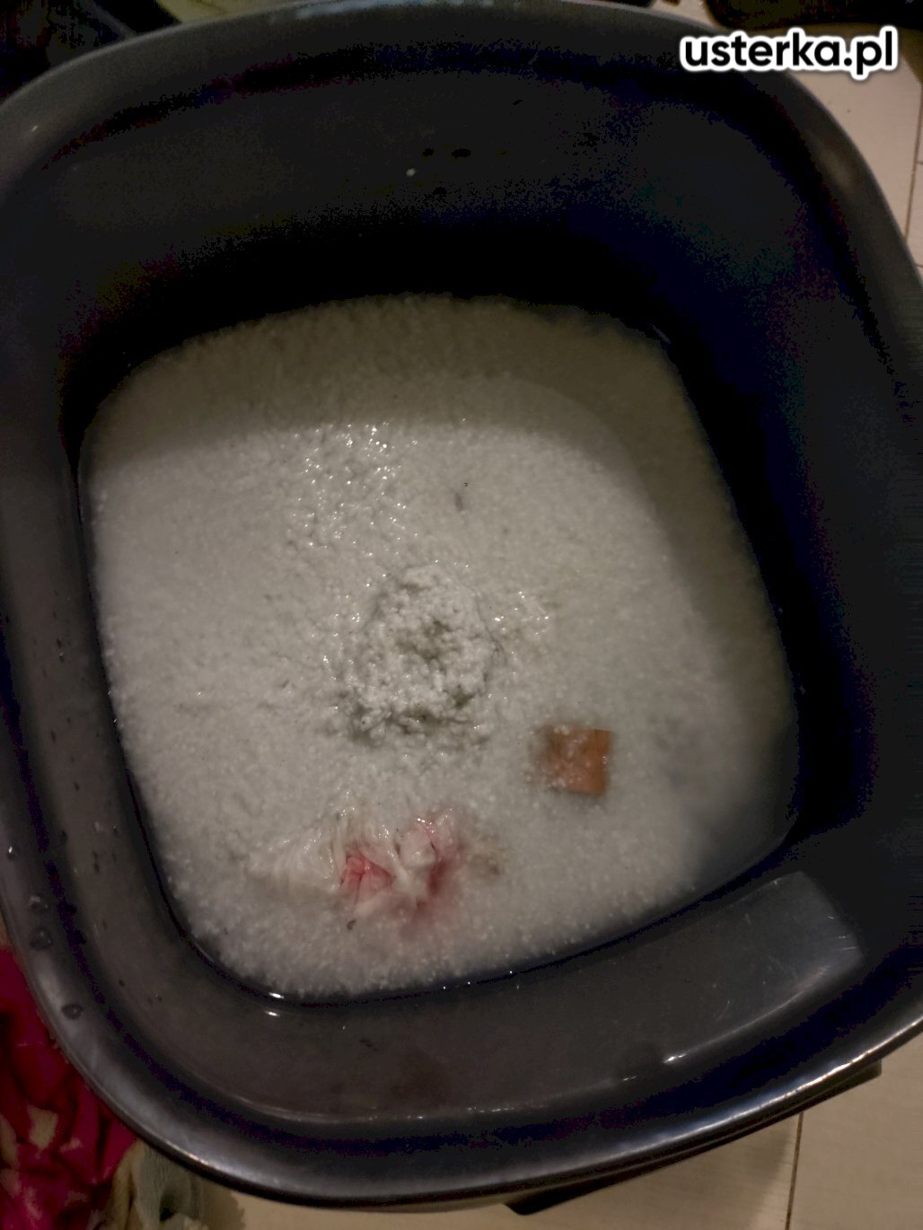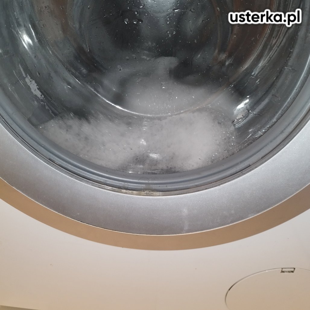 Po przeprowadzeniu czyszczenia odpływu i sprawdzeniu dopływu wody wykonano testy prania. Stwierdzono nadmiar detergentu, co powodowało silne pienienie się wody podczas płukania. Pralkę przepłukano do momentu uzyskania czystej wody. Prawdopodobną przyczyną problemu był zbyt duży dodatek środka piorącego, co mogło wywołać błąd ERR E17. Dodatkowo zauważono pordzewiały silnik pompy wody, co może być skutkiem intensywnej eksploatacji w warunkach lokalu gastronomicznego.